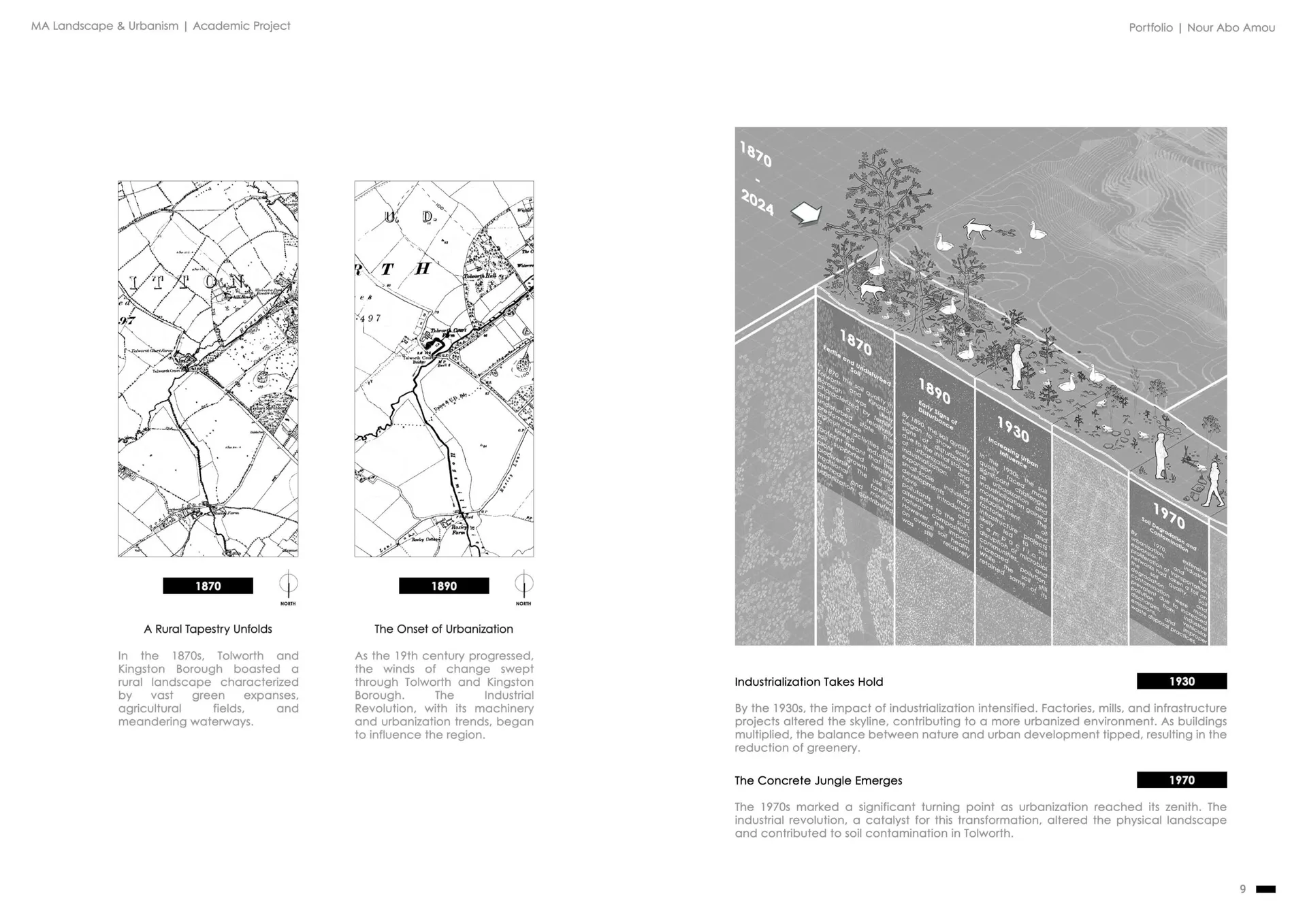 Tolworth has transformed from a thriving agricultural area to an urban landscape dominated by concrete, eroding its unique identity. This project aims to reclaim Tolworth’s character through Sub-Urban Farming and Productive Landscape, reintroducing agriculture into the urban environment. By blending farming practices with urban living and encouraging local participation in food harvesting, the project seeks to reconnect the community with the land, revitalize the area, and honor Tolworth’s agricultural heritage. The goal is to shift the narrative from decline to rejuvenation, creating a sustainable, resilient, and community-centric urban space.