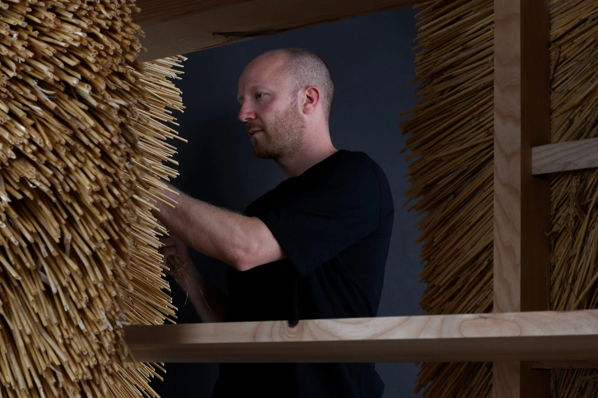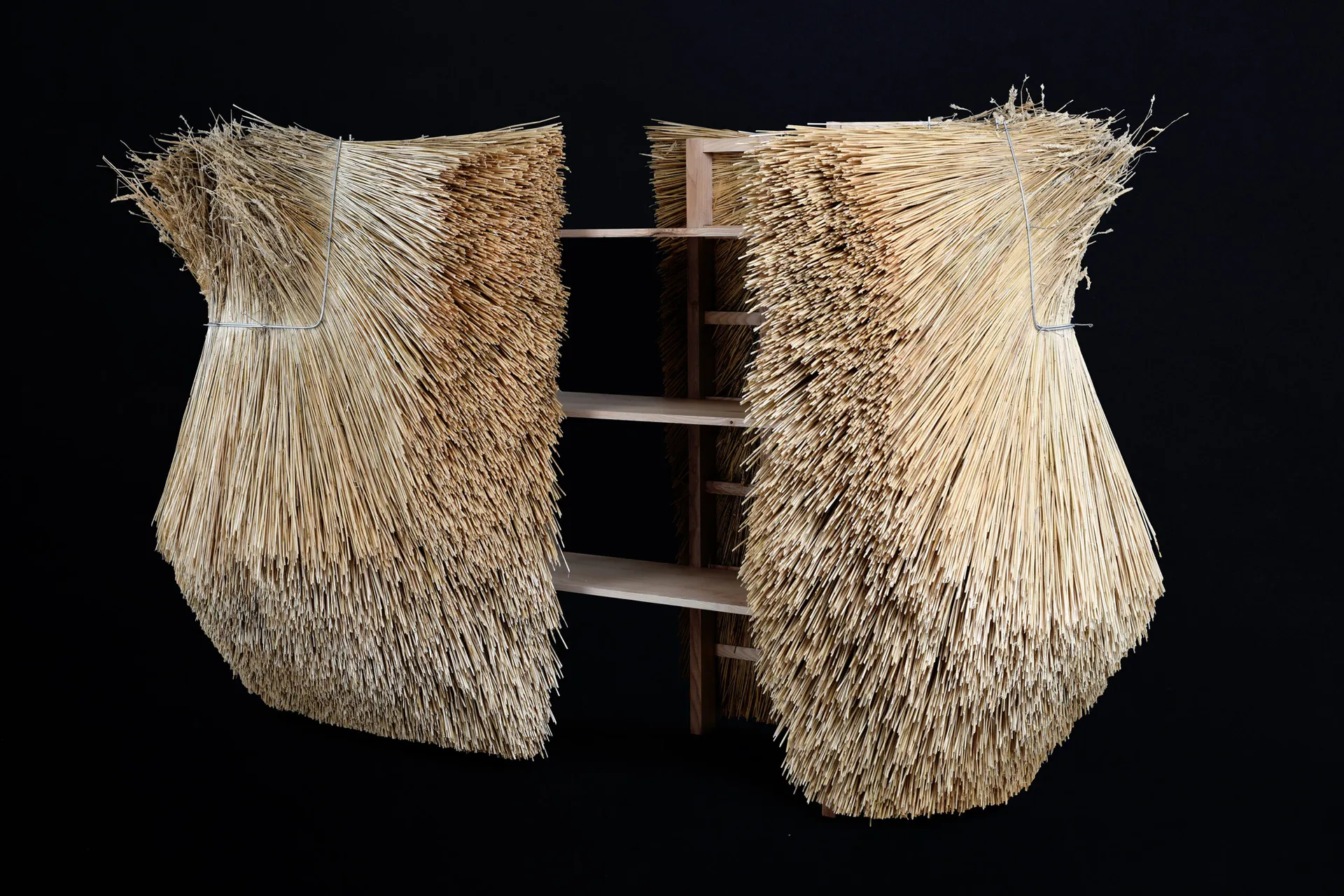 Re-Thatched explores the characteristics, techniques, and materials of thatching with the aim of integrating this traditional craft into contemporary furniture design. “Kow” (pronounced “Koo”) is a thatched shelf that embodies the preservation and adaptation of heritage in modern life by blending traditional techniques with modern functionality. Inspired by the corners of thatched roofs, it is designed as a centrepiece that offers varied perspectives of surfaces, textures, and shapes of thatch. “Kow” marks the first step in the Re-Thatched project, with ongoing work to create new pieces and share the making practices, materials, and textural palettes.