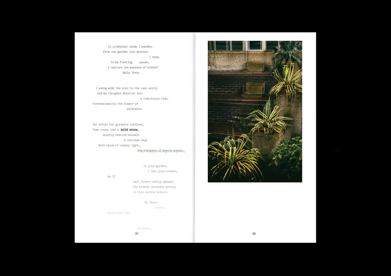 This publication is a journey through my diverse walking experiences from street observations to artist workshops, promoting people to use a state of uncertainty to explore the world, let people rediscover their lives, through interesting ideas and graphic design, inspiring people find a way of experiencing the beauty of nature while living in the city and exploring the interaction with nature. Give a brand-new experience of a common scene through the perceptual transformation.