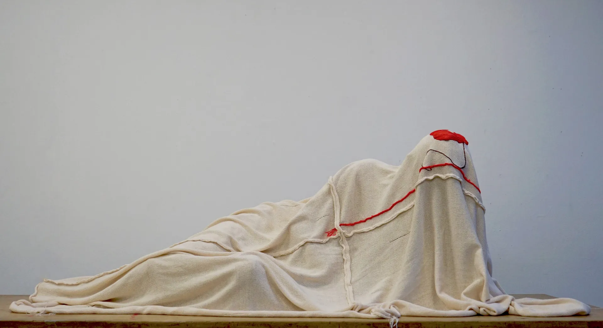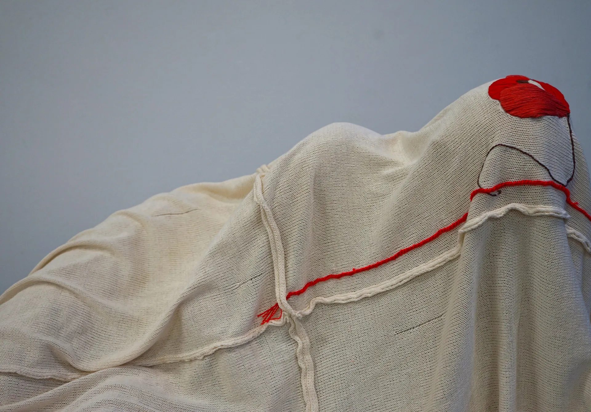The sculpture ‘Untitled’ is a creative expression on relevant personal experiences linked directly to the subject matter and surrounding stigmas. Part of it being copying my own bodily form as the base for the sculpture and incorporating elements in embroidery design traditional to my origin and culture on a hand produced knitted fabric.
