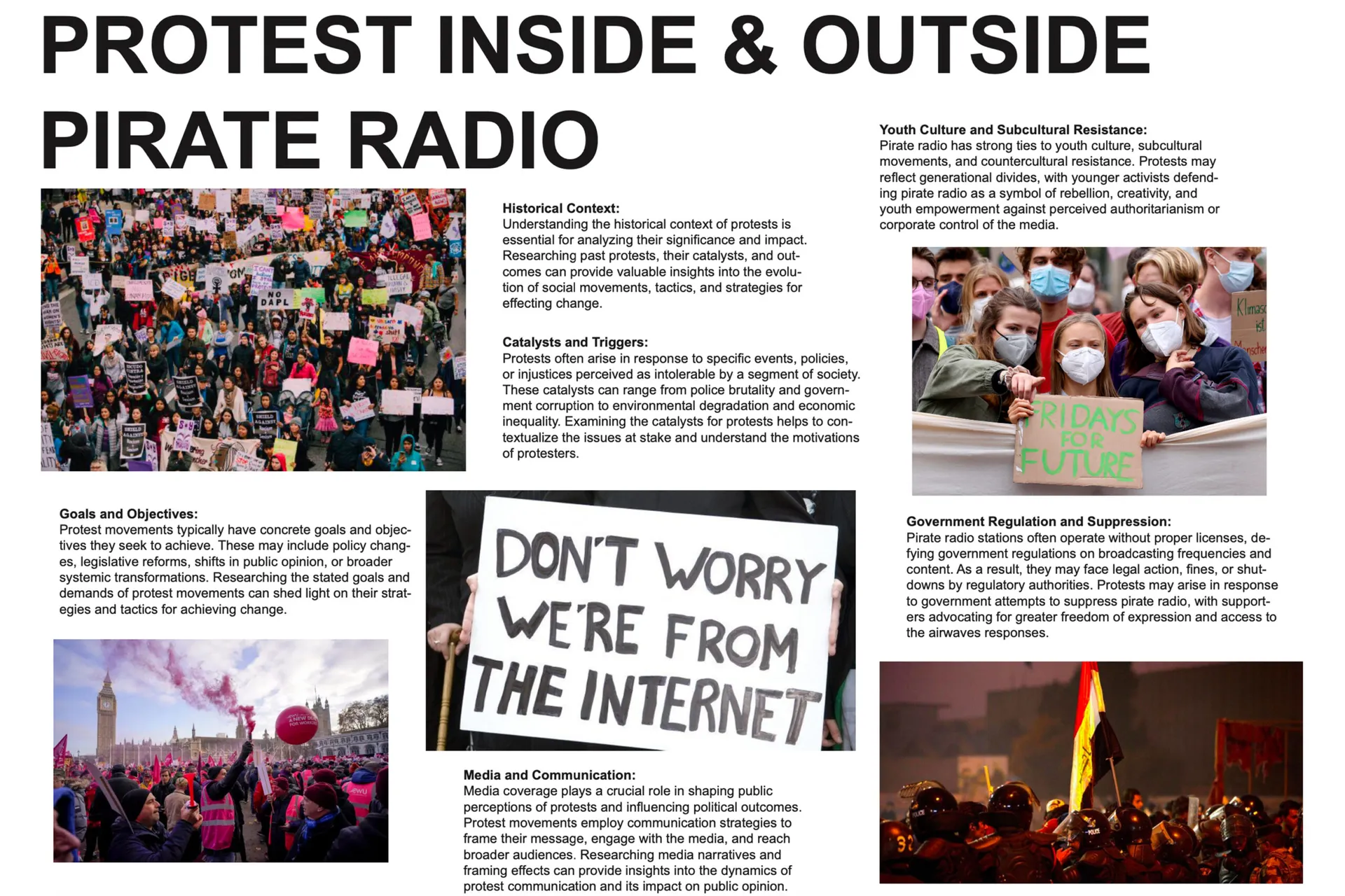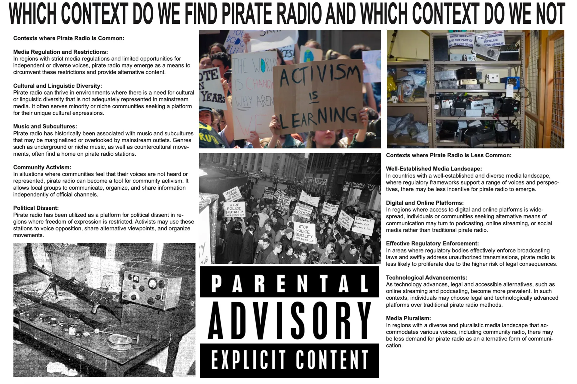 My final piece for my final major project is a piece of sound accompanied by a film. My aim with this is to show the importance of pirate radio on British culture to the younger generations. I also want to communicate that even with radio not necessarily being as popular nowadays with the rise of the internet, it is still an ongoing cycle and influence on today’s culture. I believe that my final piece has fulfilled its intention to communicate the importance of pirate radio to the younger generations and the cycle of it by informing them of the history of its origins and what it has done in more recent years which would appeal and be more relatable for the younger generations.