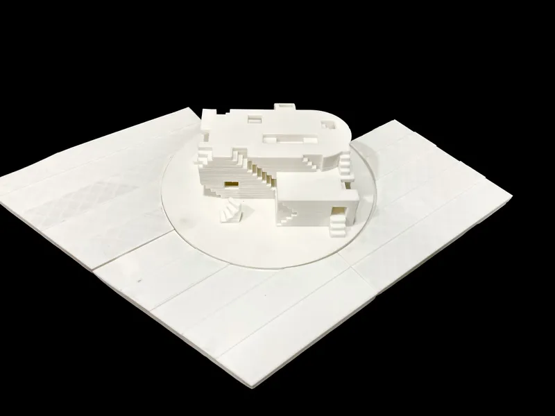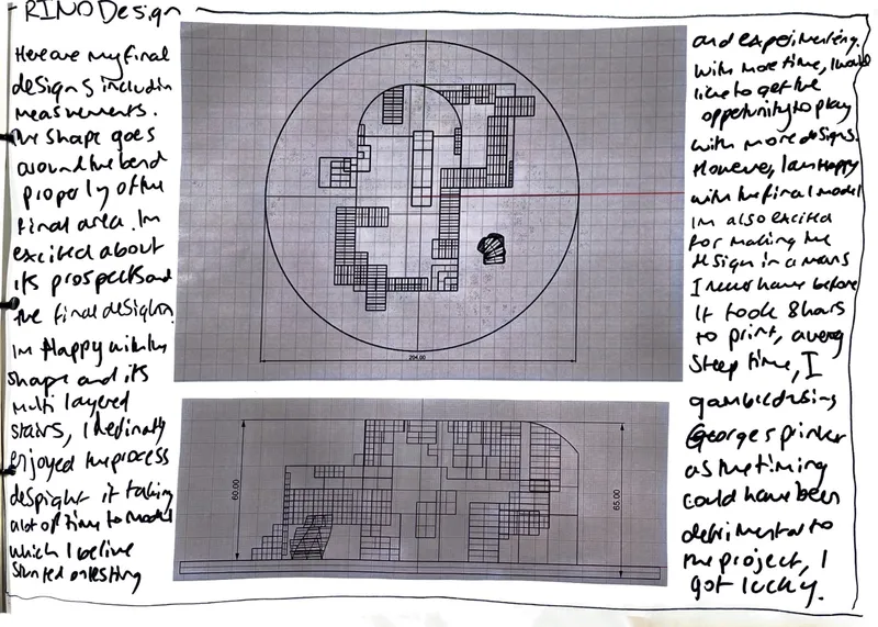 My final piece is a spatial design as a response to the concept of ‘taking the long way round.’ I became invested with the idea of making a response to this idea as it allowed me to focus on spatial design. The final piece is a structure of urban design which encourages passersby to climb and walk around the area in a different route. I chose to place my structure in kings cross square, a fitting place for a design about travel and space, which is thematically relevant to the demography as I discovered in my sight visits. I even base my designs on the preexisting shapes which occur at the sight such as the benches and plinths. I don’t see my project particularly as an end point, this model reflects an aspect of my research as opposed to a definitive solution to my belief of making the world more playful and giving an excuse to play. My piece fulfills my project intention by giving people a sense of play through a departure of normal routes. My design is intestinally a departure from the rouse passersby take on their journey through kings cross, I believe that this fulfils my philosophy that play is integral to all, including older demographics, but that we need to facilitate moments of exploration, excuses to question and take different routes, thus, much like what I define play to be, my model archives the same outlooks which I have been searching for across my project. I presented my work as an architectural model, alongside some photos of my model. My intended audience is everyone, for a project where my philosophy is that it is integral to the every day, I believe I will document it in anticipation of, peers, parents, tutors and others to interact and engage with my work.