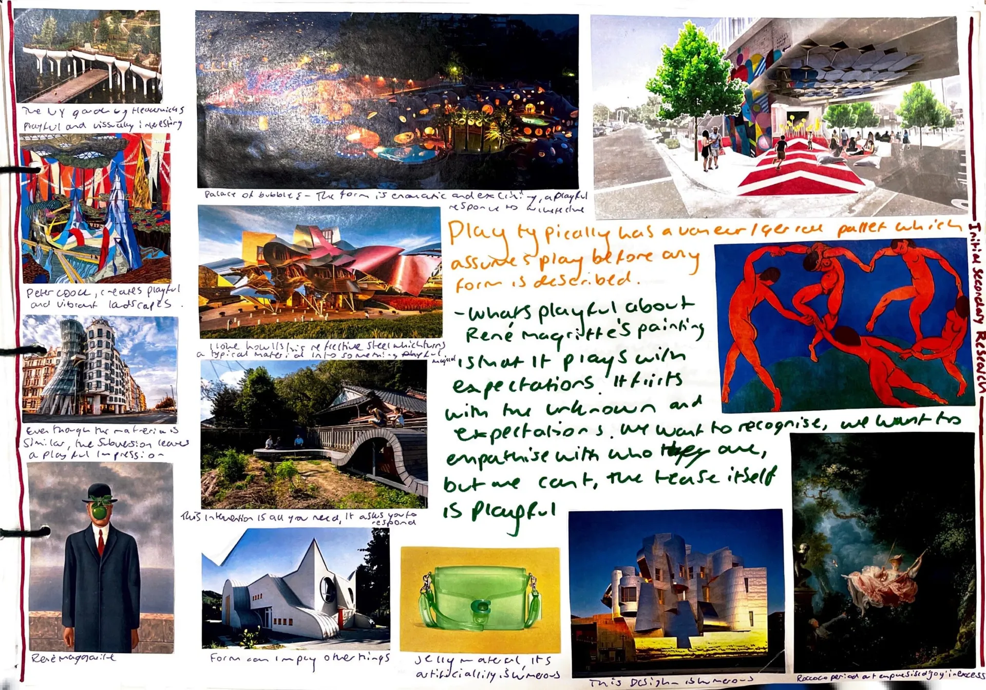 My final piece is a spatial design as a response to the concept of ‘taking the long way round.’ I became invested with the idea of making a response to this idea as it allowed me to focus on spatial design. The final piece is a structure of urban design which encourages passersby to climb and walk around the area in a different route. I chose to place my structure in kings cross square, a fitting place for a design about travel and space, which is thematically relevant to the demography as I discovered in my sight visits. I even base my designs on the preexisting shapes which occur at the sight such as the benches and plinths. I don’t see my project particularly as an end point, this model reflects an aspect of my research as opposed to a definitive solution to my belief of making the world more playful and giving an excuse to play. My piece fulfills my project intention by giving people a sense of play through a departure of normal routes. My design is intestinally a departure from the rouse passersby take on their journey through kings cross, I believe that this fulfils my philosophy that play is integral to all, including older demographics, but that we need to facilitate moments of exploration, excuses to question and take different routes, thus, much like what I define play to be, my model archives the same outlooks which I have been searching for across my project. I presented my work as an architectural model, alongside some photos of my model. My intended audience is everyone, for a project where my philosophy is that it is integral to the every day, I believe I will document it in anticipation of, peers, parents, tutors and others to interact and engage with my work.