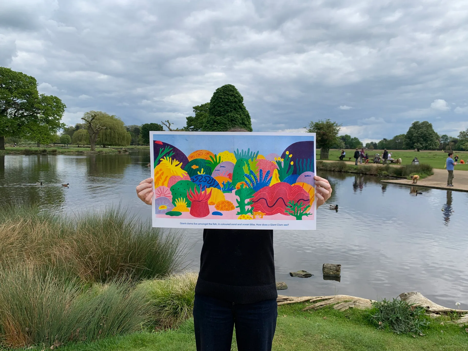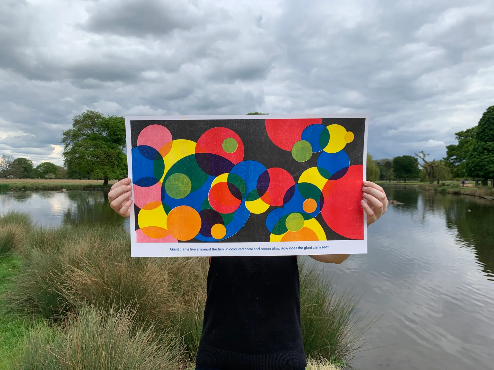 This book reveals what the world looks like from different animals viewpoints; ranging from the perspective of a tiger, who only see in green and blue, to the view of a bee, who see the world in Ultraviolet light. I wanted to visualise what humans cannot physically see and recreate these worlds in an abstract and surreal way. The moral of the book is for children to keep paying attention to what is around them and look out for all of nature’s hidden secrets.