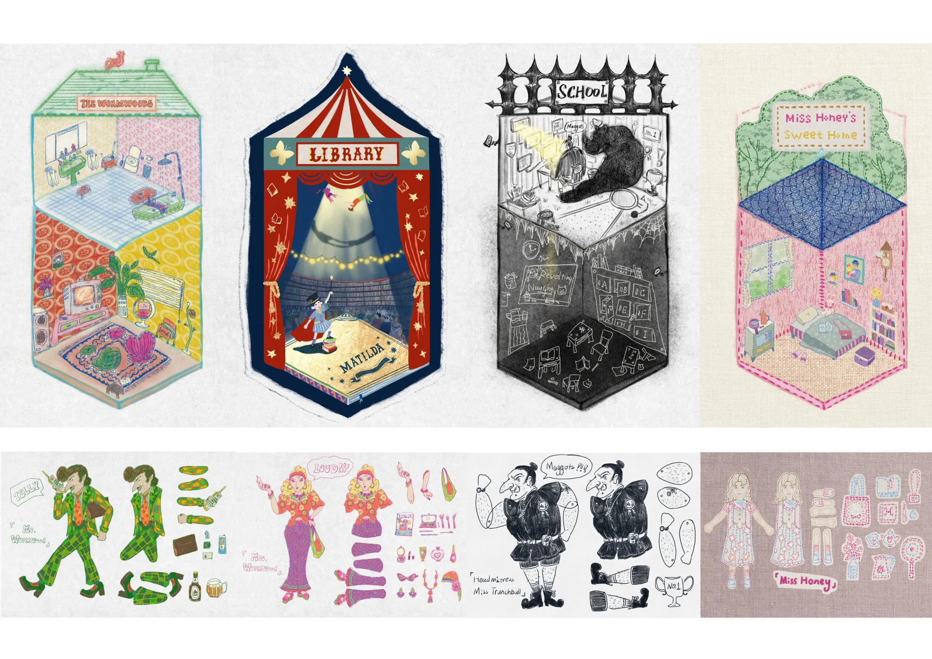 Inspired by Roald Dahl’s beloved novel ‘Matilda‘, my project explores the vivid scenes of Matilda’s world, drawing on both the original book and its adaptations. Each key setting – Matilda’s home, the library, the school and Miss Honey’s house – evokes different emotions, prompting me to adopt four unique styles to capture their essence.