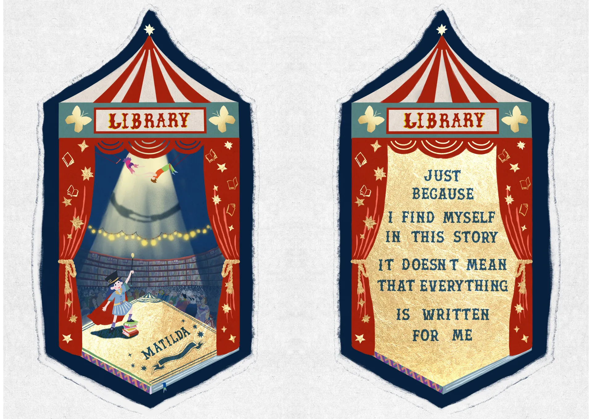 In contrast, the library emerges as a sanctuary for Matilda, a place where she finds solace in the world of books. Using a cut-paper collage style, I transformed the library into a vibrant circus, with books and characters serving as eager spectators to Matilda’s imaginative stories.