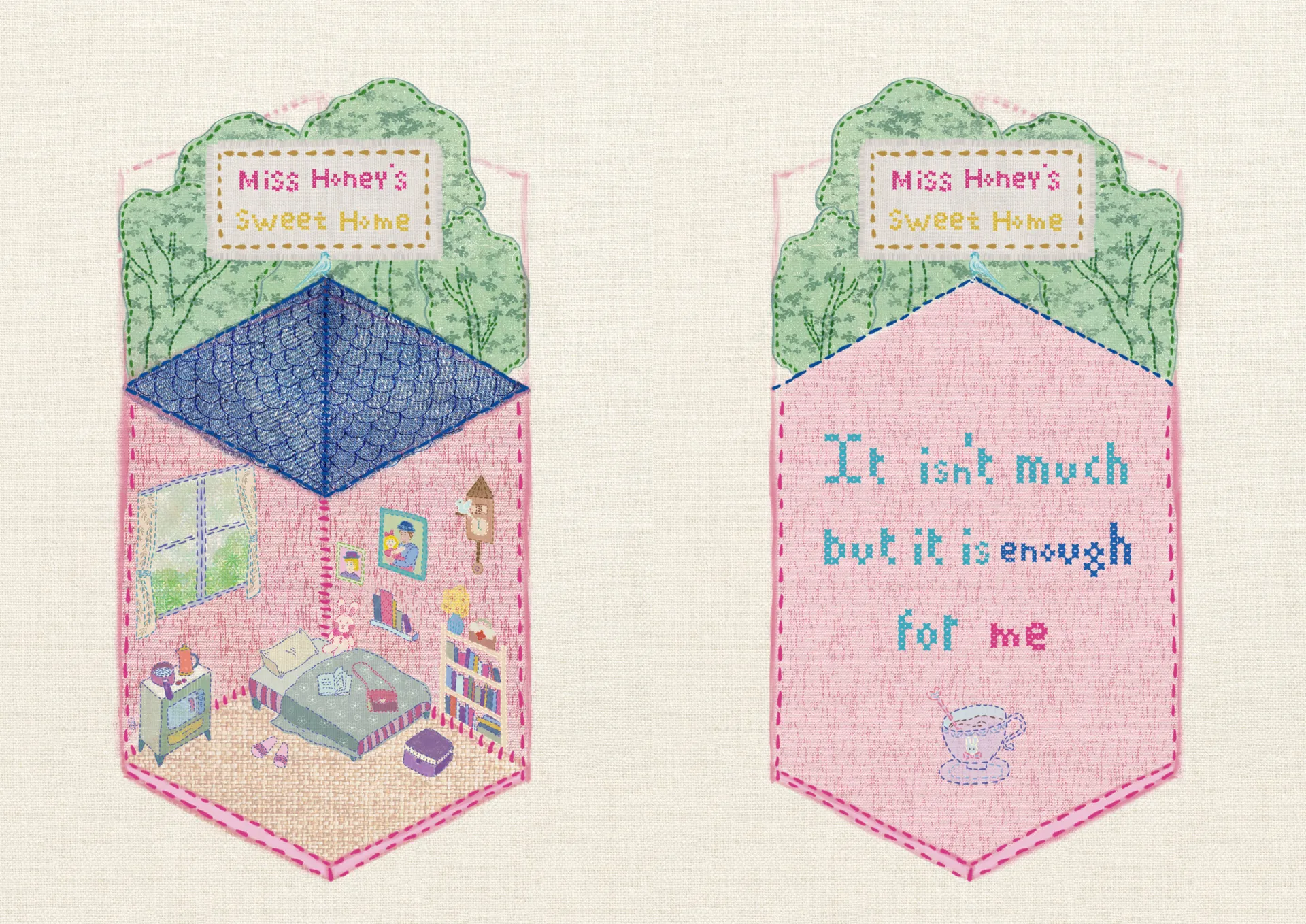 Conversely, Miss Honey’s humble abode radiates warmth and comfort despite its modest appearance. Using fabric collage techniques, I aim to capture the nurturing spirit of Miss Honey as she transforms her ramshackle hut into a haven of positivity and optimism in the face of adversity.