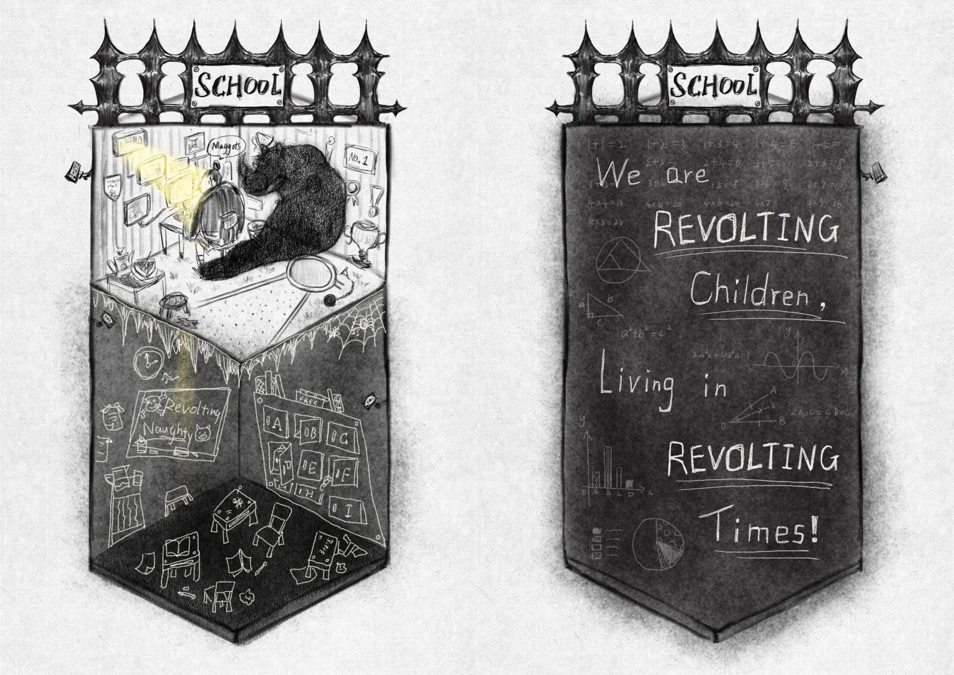 The school, depicted as a dreary and oppressive institution under the tyrannical rule of Miss Trunchbull, is rendered in stark black and white, resembling a grim dungeon where children are subjected to cruelty and punishment.