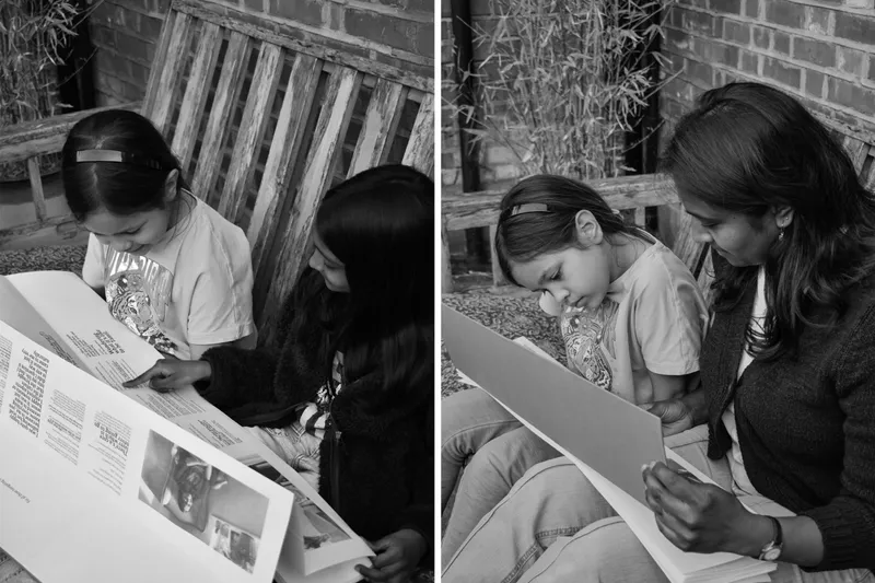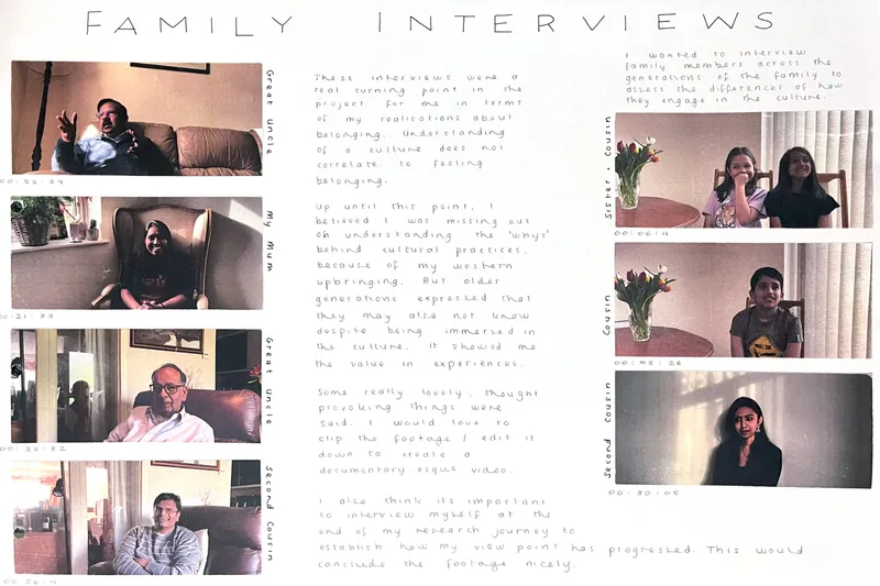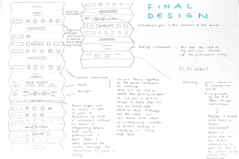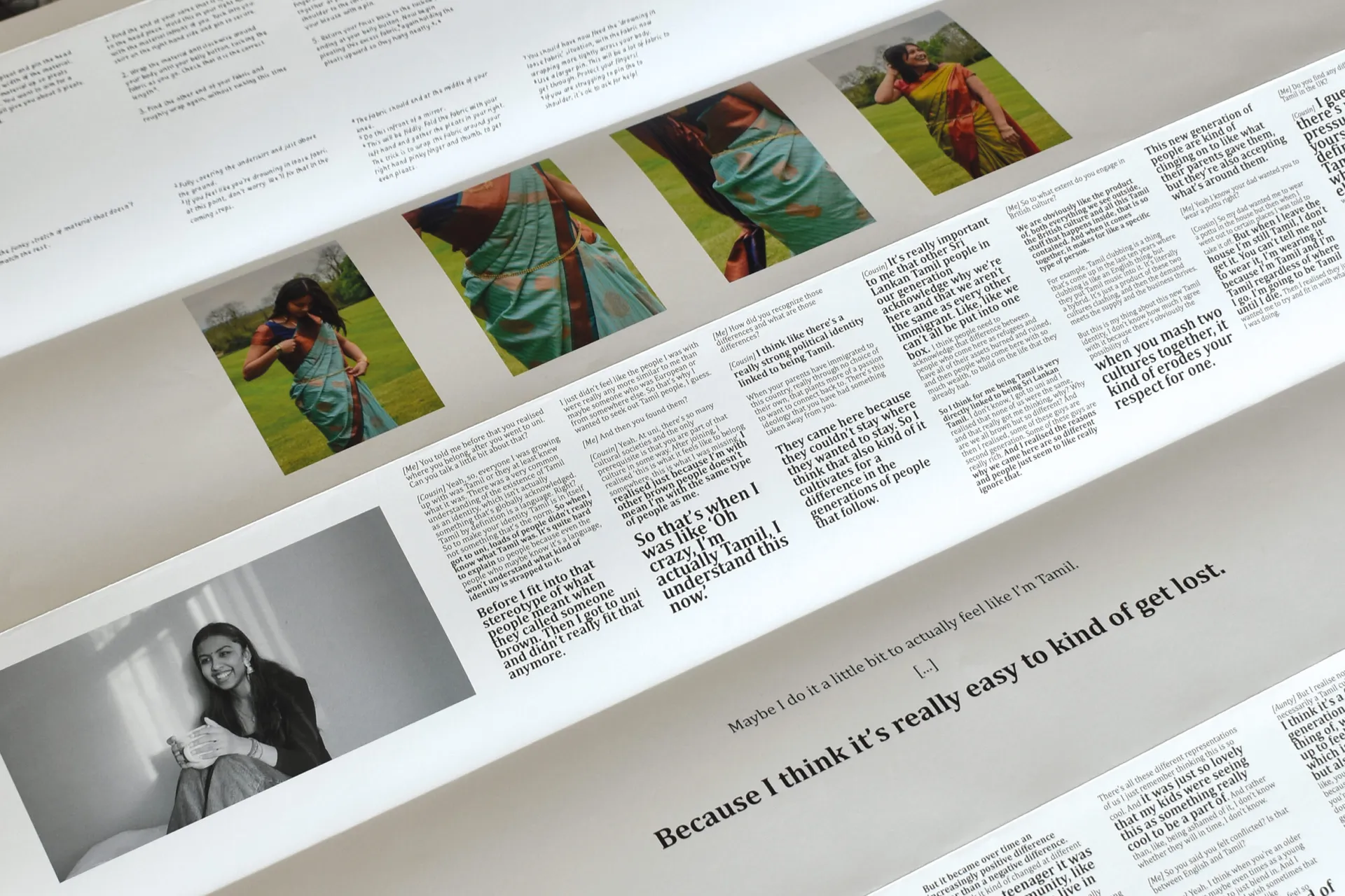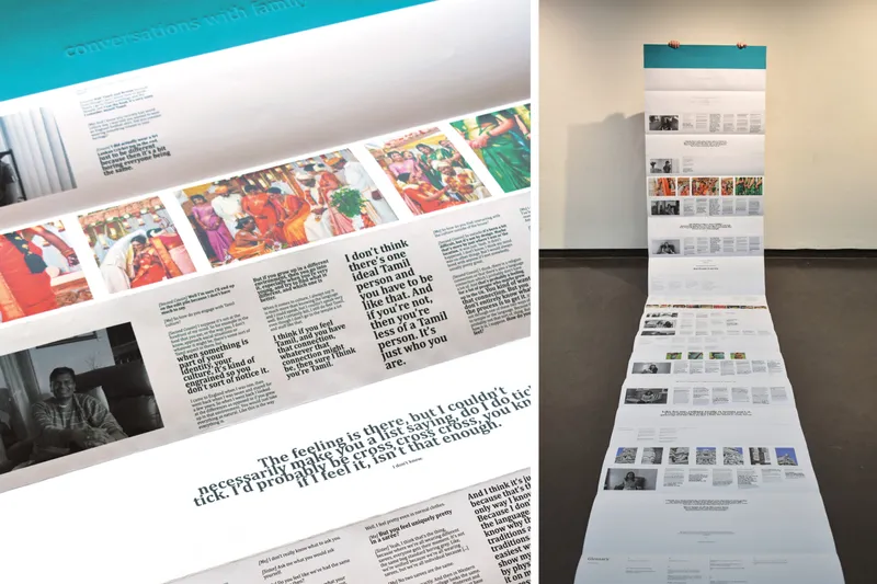 My outcome includes interviews of family members across the generations, ranging from my younger cousins to my great uncles. I ask questions such as, ‘How do you engage with Tamil culture?’ or ‘What is being Sri Lankan all about?’. Each individual had a different viewpoint. I think that the breadth of answers within one family shows that there is truly no standard to meet, when it comes to identifying with a culture. Within the concertina, I also included instructional elements based on my primary research. As a means of becoming closer to my Tamil heritage, I learned to drape a saree, wearing it daily over a two week period. I also learned to cook curries from my parents, which I am now passing to those who may not have the means of attaining such knowledge. Whilst researching, I found that learning about a culture from word of mouth is uniquely trustworthy, and I am trying to emulate that process through these informal, instructional pages – where I am teaching what I learned.