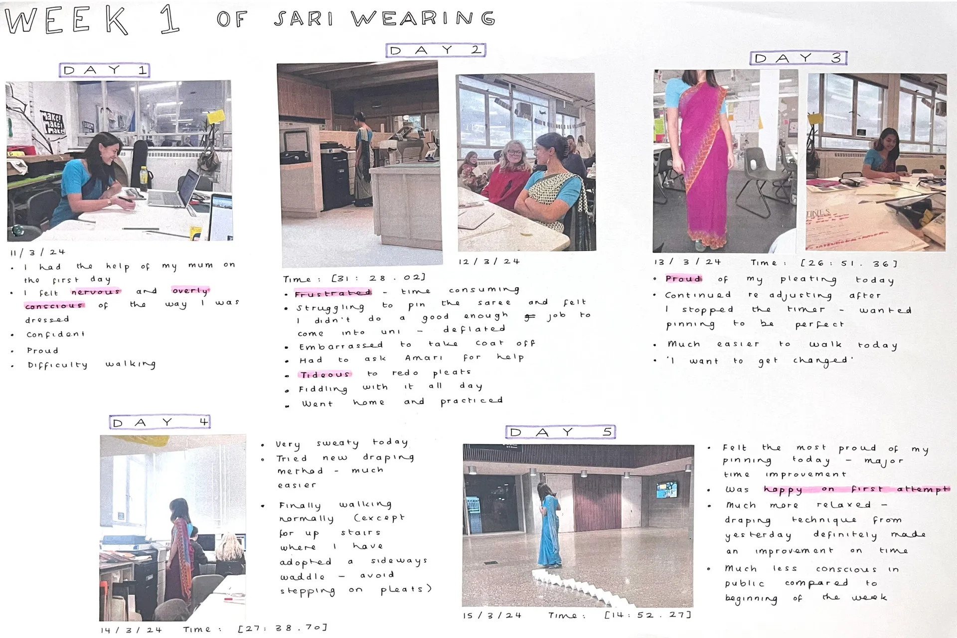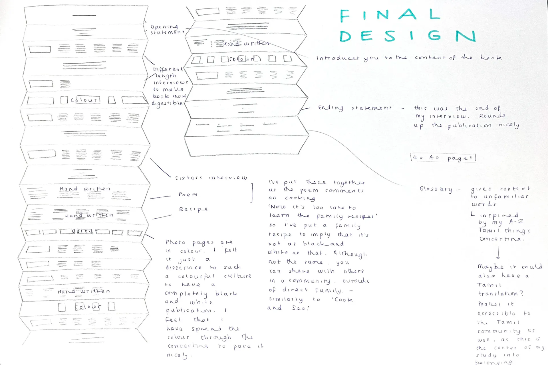 My outcome includes interviews of family members across the generations, ranging from my younger cousins to my great uncles. I ask questions such as, ‘How do you engage with Tamil culture?’ or ‘What is being Sri Lankan all about?’. Each individual had a different viewpoint. I think that the breadth of answers within one family shows that there is truly no standard to meet, when it comes to identifying with a culture. Within the concertina, I also included instructional elements based on my primary research. As a means of becoming closer to my Tamil heritage, I learned to drape a saree, wearing it daily over a two week period. I also learned to cook curries from my parents, which I am now passing to those who may not have the means of attaining such knowledge. Whilst researching, I found that learning about a culture from word of mouth is uniquely trustworthy, and I am trying to emulate that process through these informal, instructional pages – where I am teaching what I learned.