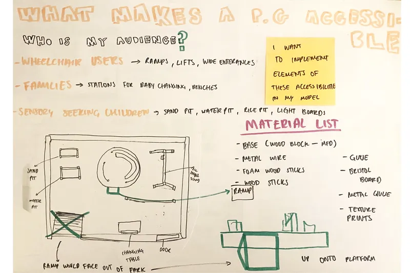My final piece is a documentation of a workshop I conducted exploring accessibility in play spaces. My workshop was conducted in Rutherford House Primary School on the 23rd of April 2024 with nine, 8–11-year-old students, discussing the issues with accessibly in play spaces. In particular looking at a playground 300 metres away from the school located in Balham. Following this I made a publication sharing the children’s designs with a summary of the workshop alongside drawings of their designs on isometric paper and a letter all addressed to Wandsworth council.