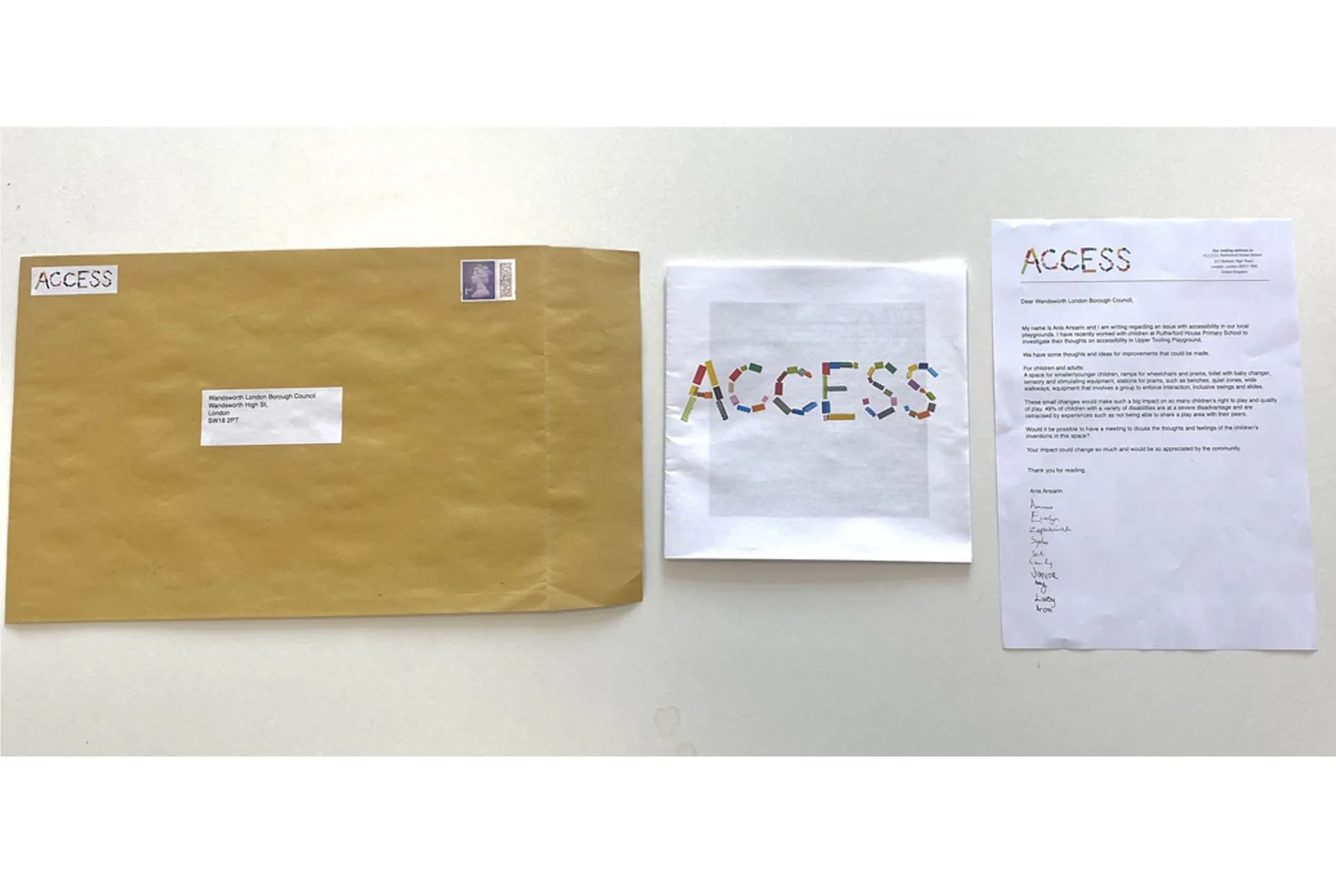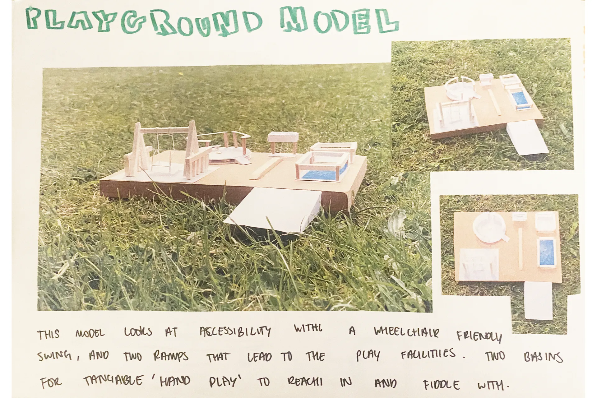 My final piece is a documentation of a workshop I conducted exploring accessibility in play spaces. My workshop was conducted in Rutherford House Primary School on the 23rd of April 2024 with nine, 8–11-year-old students, discussing the issues with accessibly in play spaces. In particular looking at a playground 300 metres away from the school located in Balham. Following this I made a publication sharing the children’s designs with a summary of the workshop alongside drawings of their designs on isometric paper and a letter all addressed to Wandsworth council.