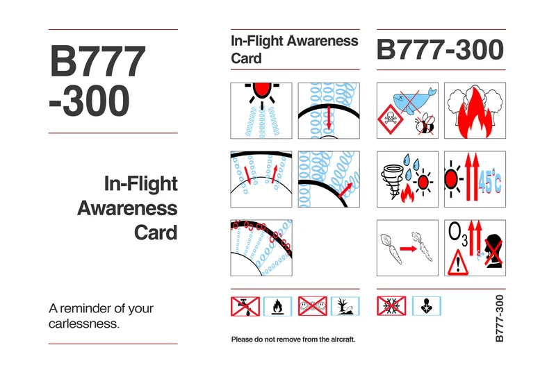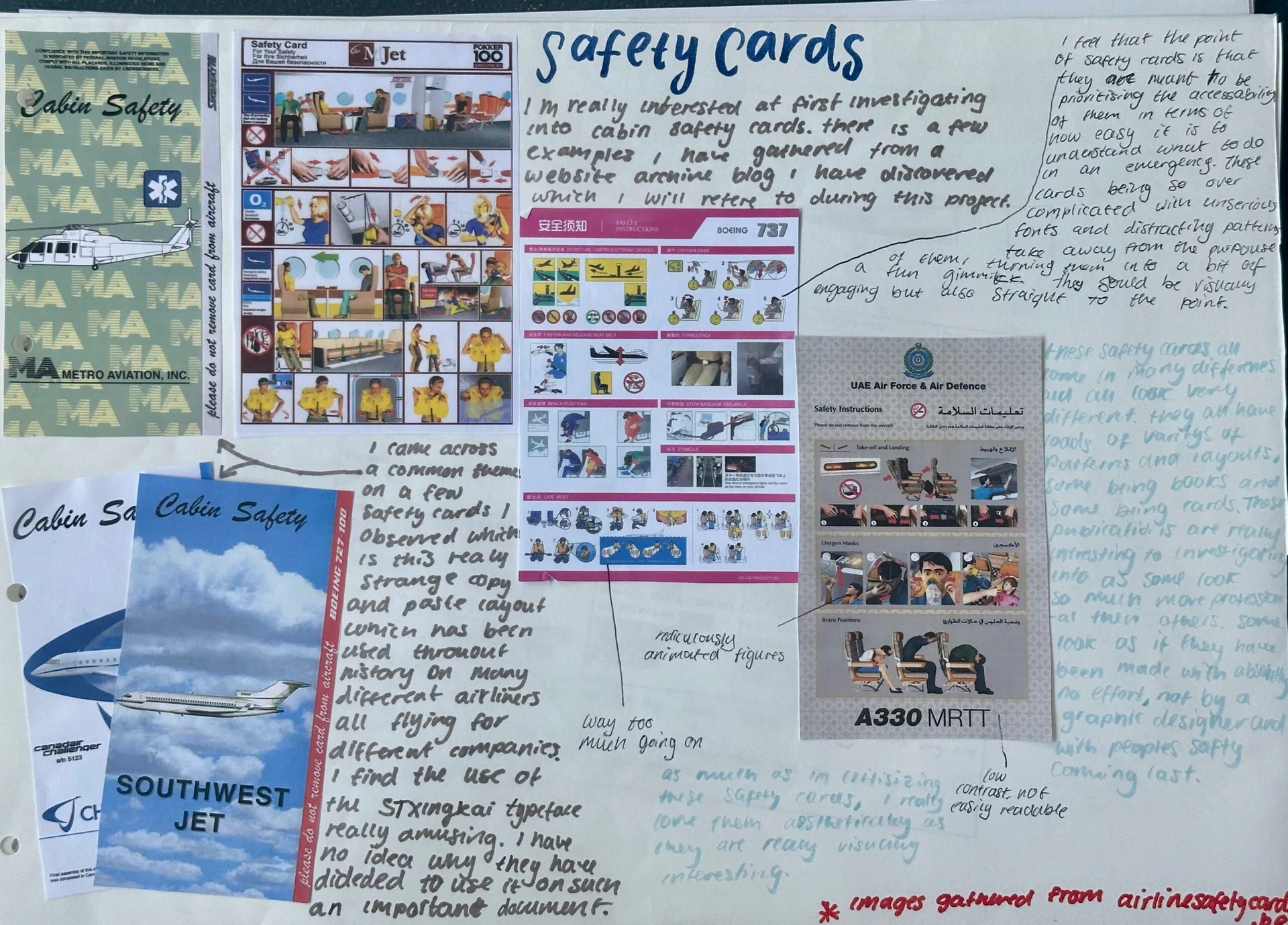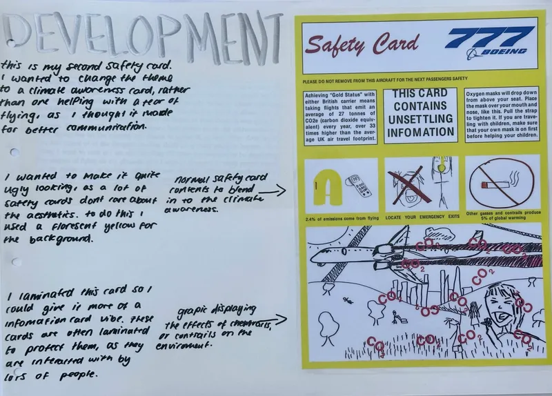 My final major project investigates the detrimental effects greenhouse gasses have on the environment, and how the aviation industry impacts it. i used the all too familiar visuals of publications you find in the back seat pocket of. plane to communicate this, with a parody of a safety card, informing my audience of the ignored future environment which lies ahead of us, and what i believe to be more dangerous than the slim possibility of a plane crash.