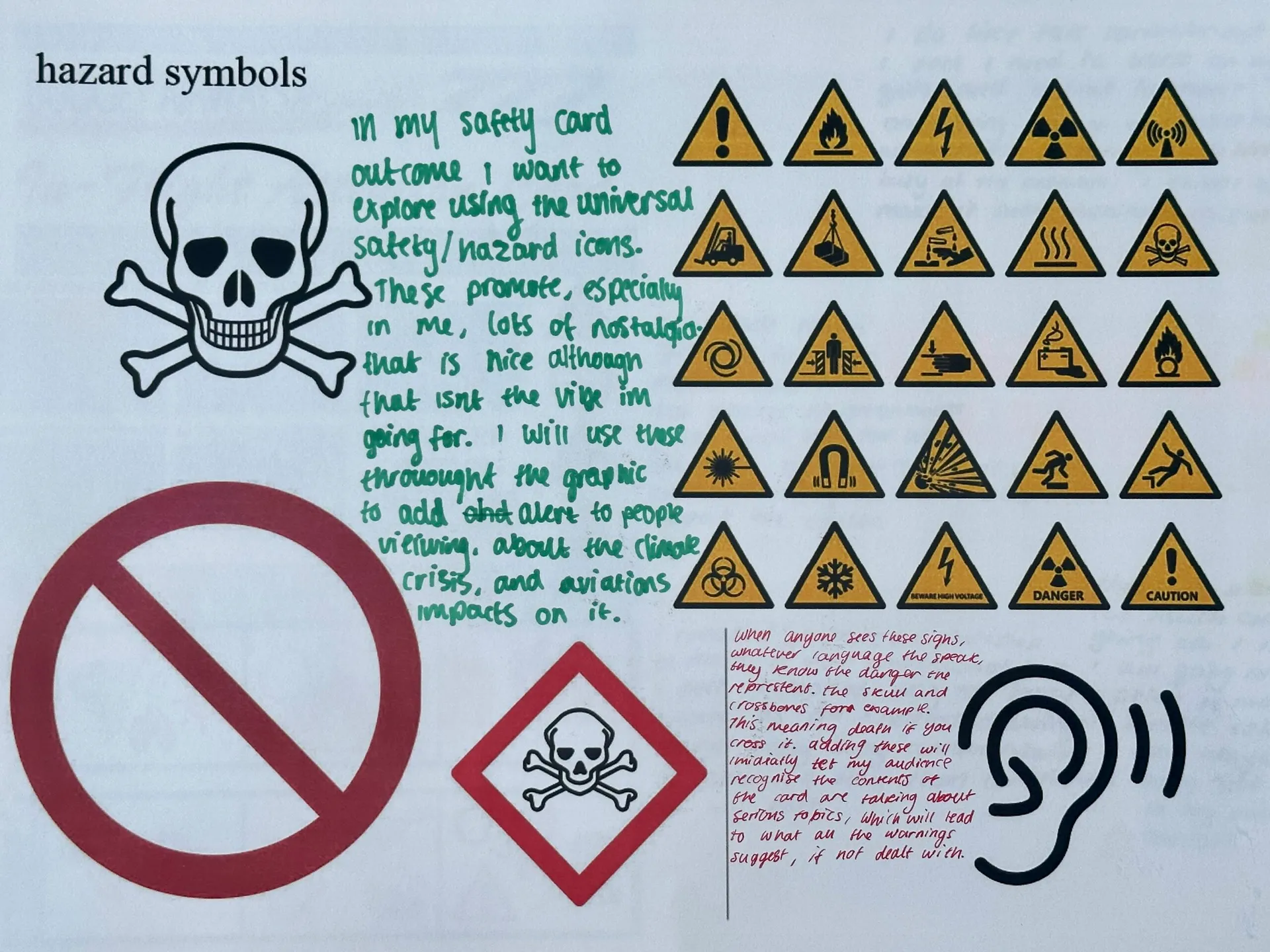 My final major project investigates the detrimental effects greenhouse gasses have on the environment, and how the aviation industry impacts it. i used the all too familiar visuals of publications you find in the back seat pocket of. plane to communicate this, with a parody of a safety card, informing my audience of the ignored future environment which lies ahead of us, and what i believe to be more dangerous than the slim possibility of a plane crash.