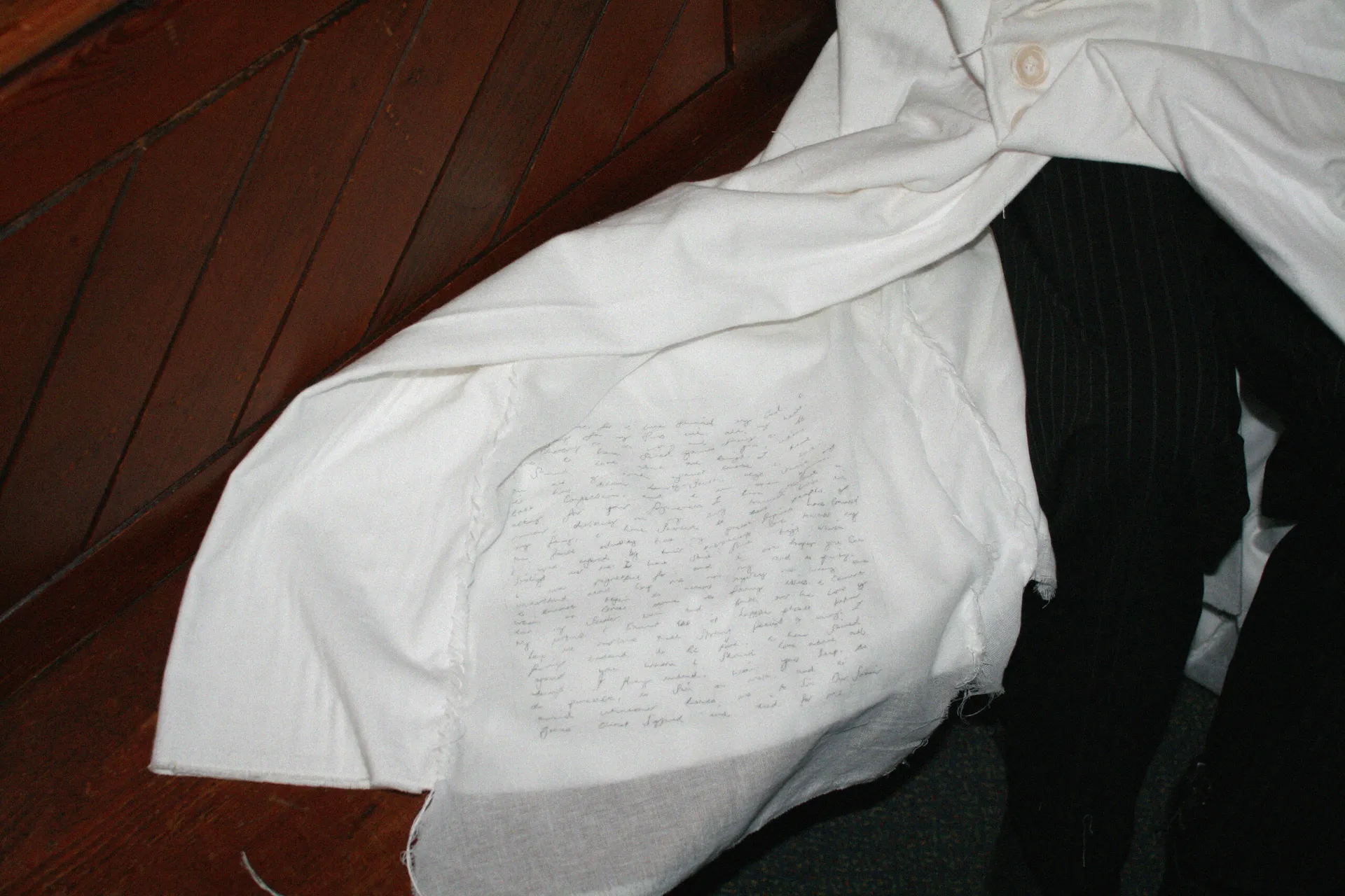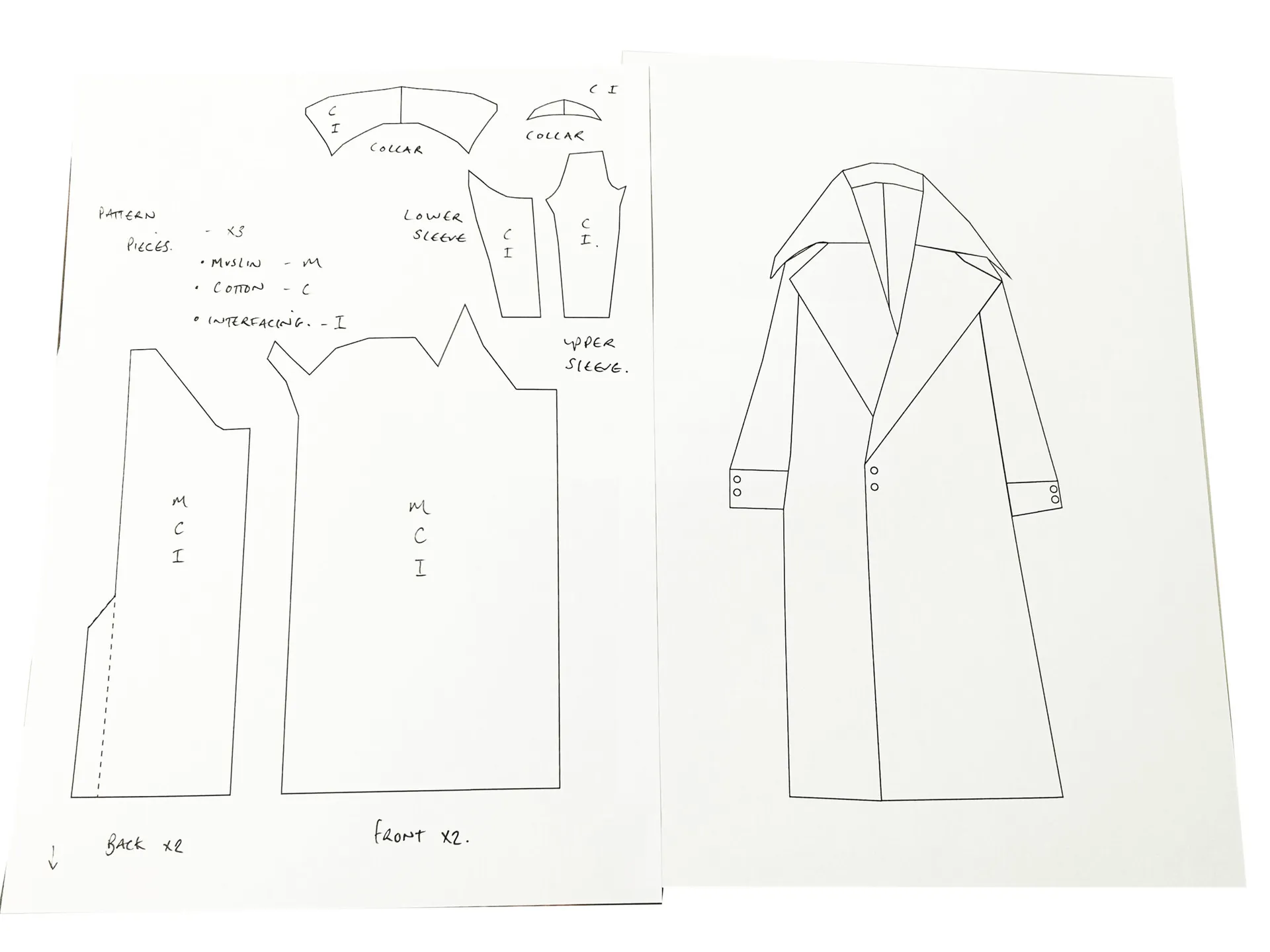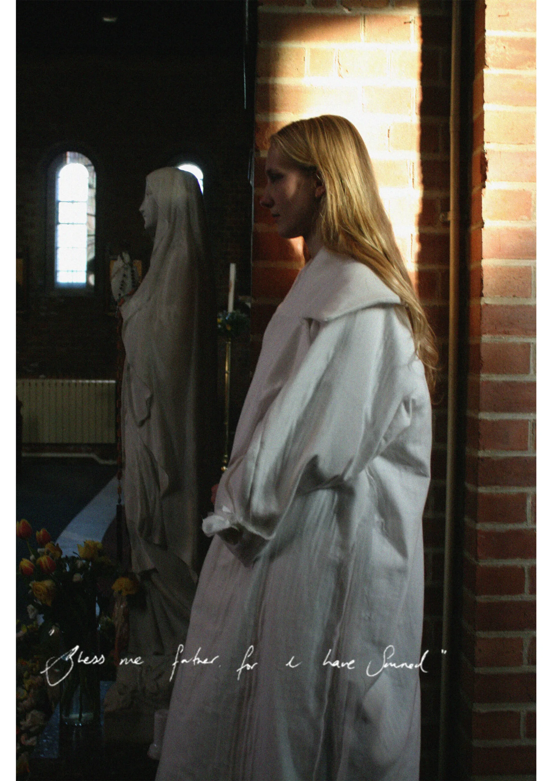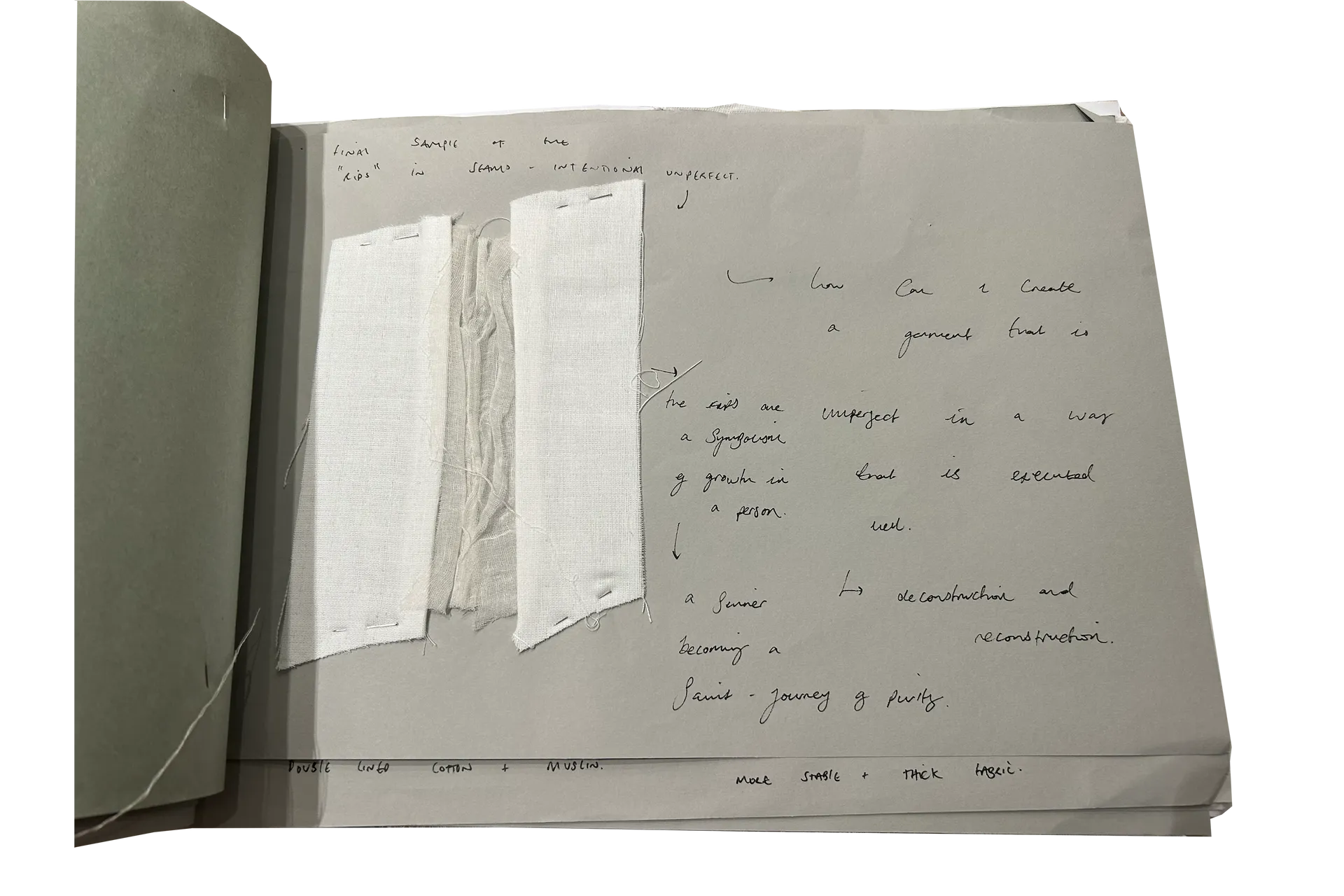 I designed my garment for a repentant sinner, looking at a journey of purity and rebirth of a person. I aimed to combine my love for tailoring and construction with a more conceptual theme, therefore I created a tailored jacket symbolising growth and purity through confession. the jacket is oversized, as a symbol of growing into your sins, embellished with ripped muslin on the seams. on the inside of the jacket, I created an etching inspired by confession, the etching is a handwritten note, based on what one says in confession.