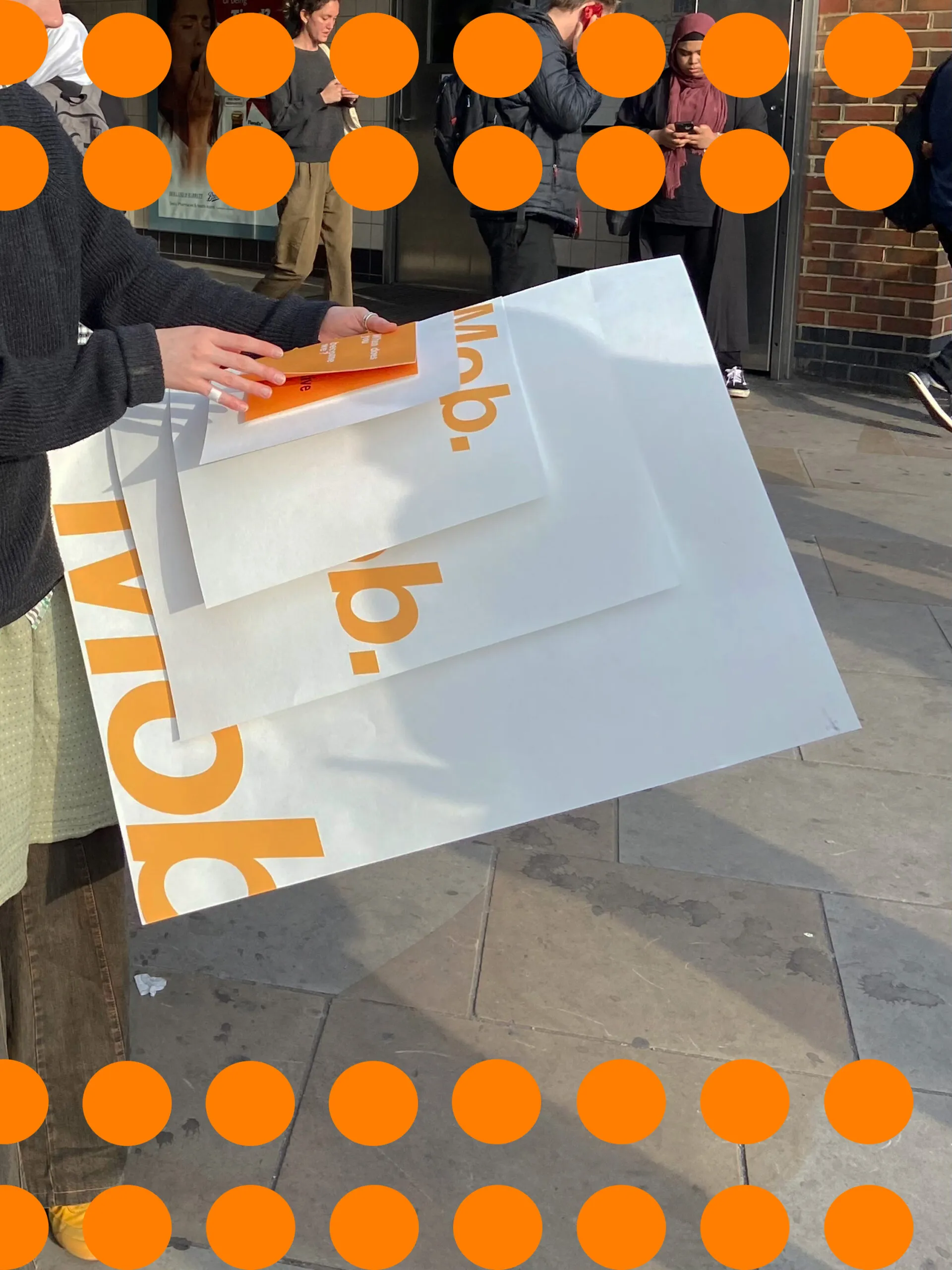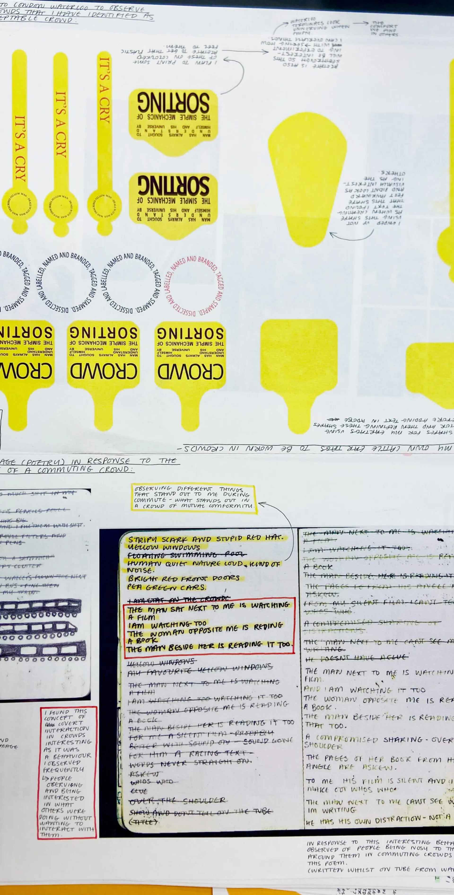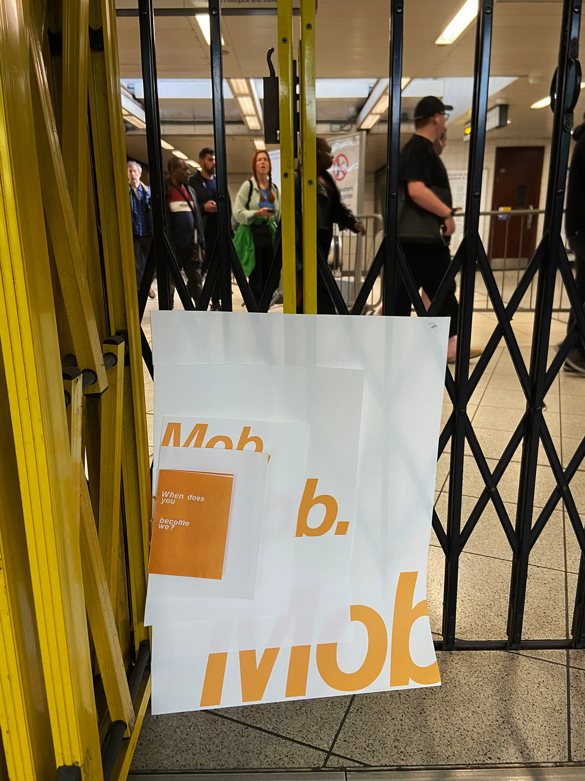 For my final piece I created a large (A0) publication that is communicating a warning – “crowds are being packaged”. However, within my publication this warning is disrupted; slowly disappearing between larger and larger pages simply state the word “Mob”.