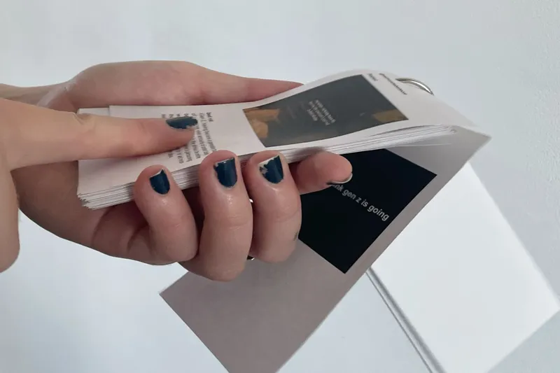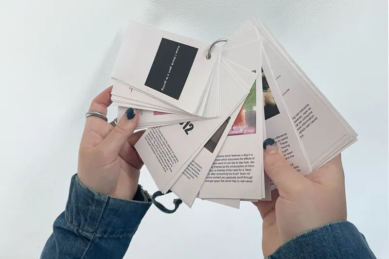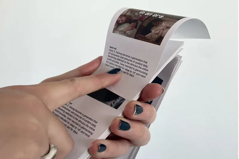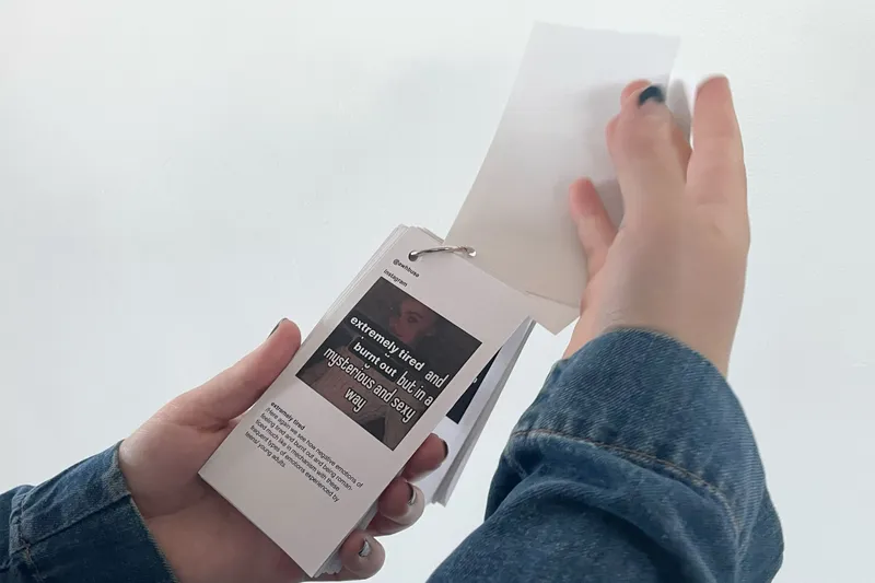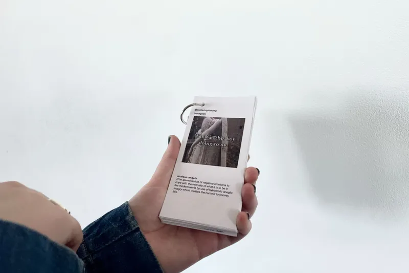 My body work for this project consists of observations of why parts of meme culture have come to light in Gen Z’s generation and the narratives they follow. I portrayed this idea in the form of an A-Z dictionary so my work would be accessible for all generations or people who weren’t or were familiar with memes, and use this publication as piece to reflect on mobile usage and its effects on our human nature. I used the size of a phone for my publication to bring the online world of ones phone into something real that one could reflect upon popular meme culture from a perspective that encouraged in person interaction with media rather than just on a phone as the online world, as found in my research, seems to make more of a negative impact on people than positive. I wanted also for people to recognise how meme was used as a seemingly ironic form of commentary to discuss the issues of the online world as it was so much a part of it furthering my desire to see how this would playout as an in person tangible object rather than on a screen. Perhaps, I wanted to come to the conclusion that coming offline would not change the tangibility of these messages or their value in how we respond to them. It would have a psychologically preferred impact on people to interact with content this way as teens and young adults in the modern world find themselves racking up screen times of 8-10hrs a day on average which has subsequently altered neuro links we make in our brain in social situations and in our attention spans. Overall, I hope my project can help people consider if the memes they are just looking at for passive entertainment value are simply just humorous, or are they far more telling about the way in which a generation has become thanks to the move towards the digital side to the modern world. I also hope parents could use this A-Z as a way to also understand this young generation being the first to grow up in an online world and the effects it could have on their children.