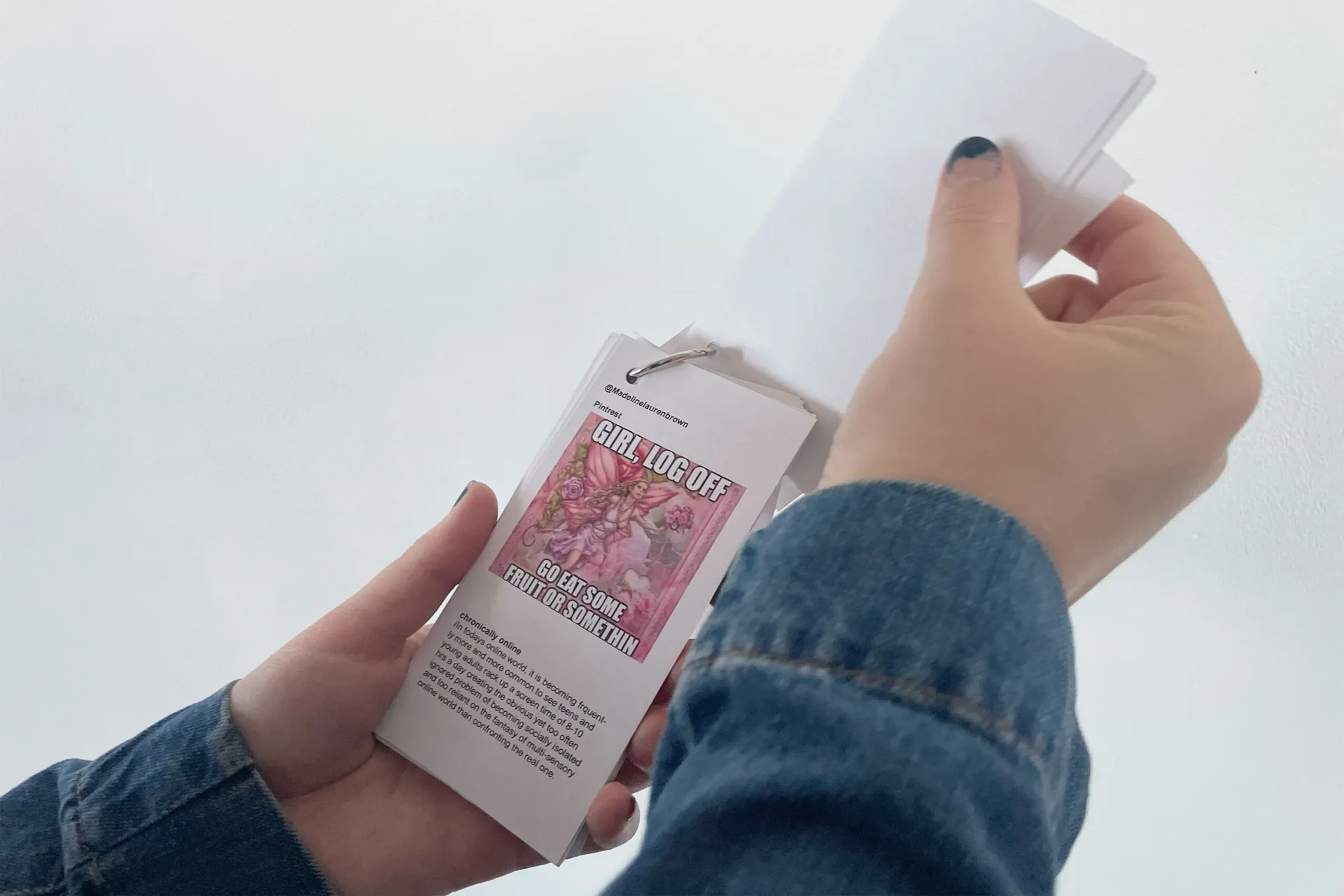 My body work for this project consists of observations of why parts of meme culture have come to light in Gen Z’s generation and the narratives they follow. I portrayed this idea in the form of an A-Z dictionary so my work would be accessible for all generations or people who weren’t or were familiar with memes, and use this publication as piece to reflect on mobile usage and its effects on our human nature. I used the size of a phone for my publication to bring the online world of ones phone into something real that one could reflect upon popular meme culture from a perspective that encouraged in person interaction with media rather than just on a phone as the online world, as found in my research, seems to make more of a negative impact on people than positive. I wanted also for people to recognise how meme was used as a seemingly ironic form of commentary to discuss the issues of the online world as it was so much a part of it furthering my desire to see how this would playout as an in person tangible object rather than on a screen. Perhaps, I wanted to come to the conclusion that coming offline would not change the tangibility of these messages or their value in how we respond to them. It would have a psychologically preferred impact on people to interact with content this way as teens and young adults in the modern world find themselves racking up screen times of 8-10hrs a day on average which has subsequently altered neuro links we make in our brain in social situations and in our attention spans. Overall, I hope my project can help people consider if the memes they are just looking at for passive entertainment value are simply just humorous, or are they far more telling about the way in which a generation has become thanks to the move towards the digital side to the modern world. I also hope parents could use this A-Z as a way to also understand this young generation being the first to grow up in an online world and the effects it could have on their children.