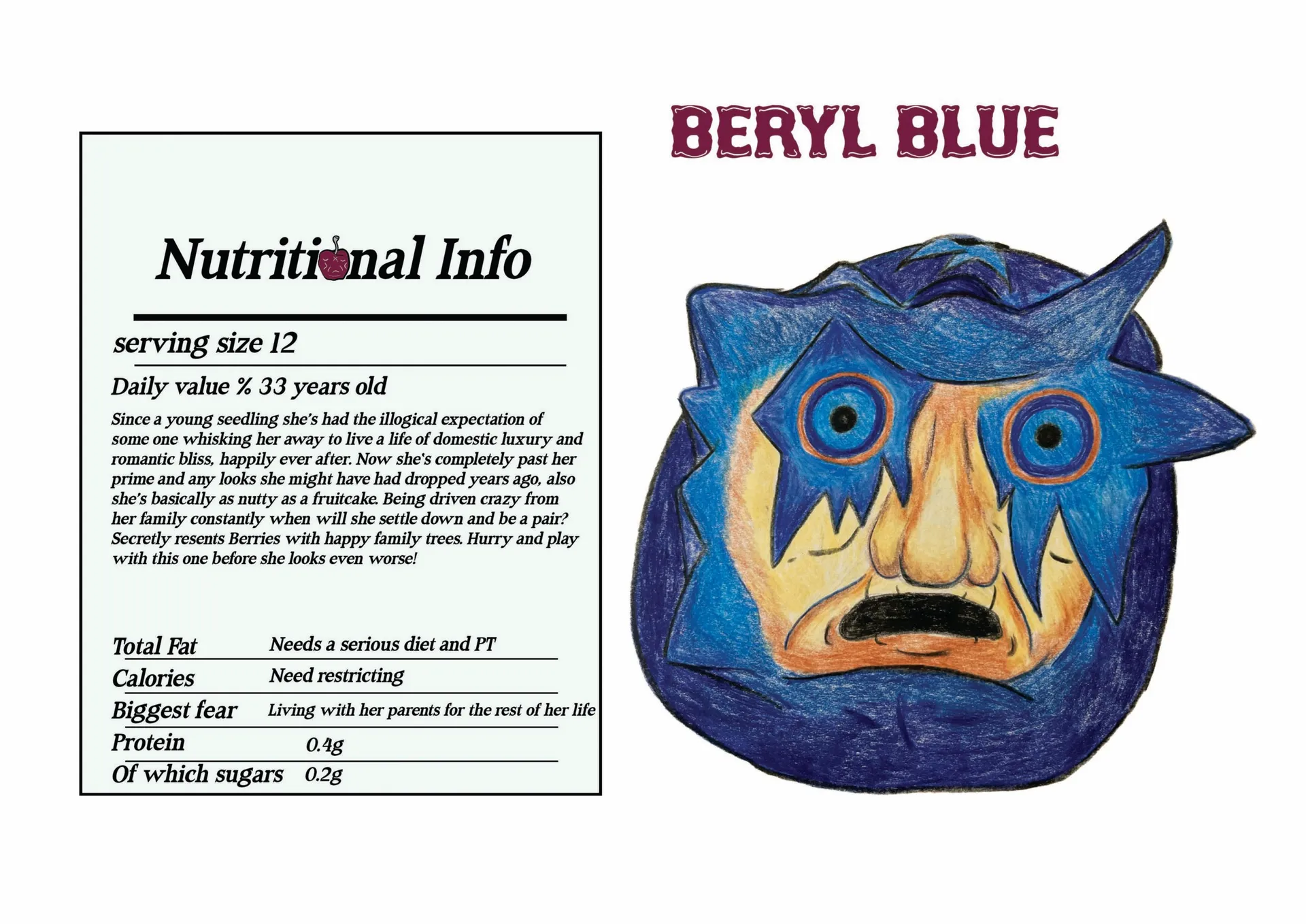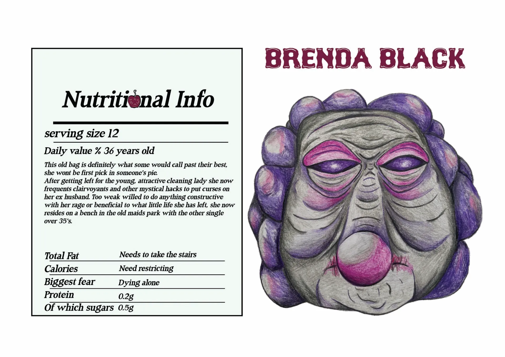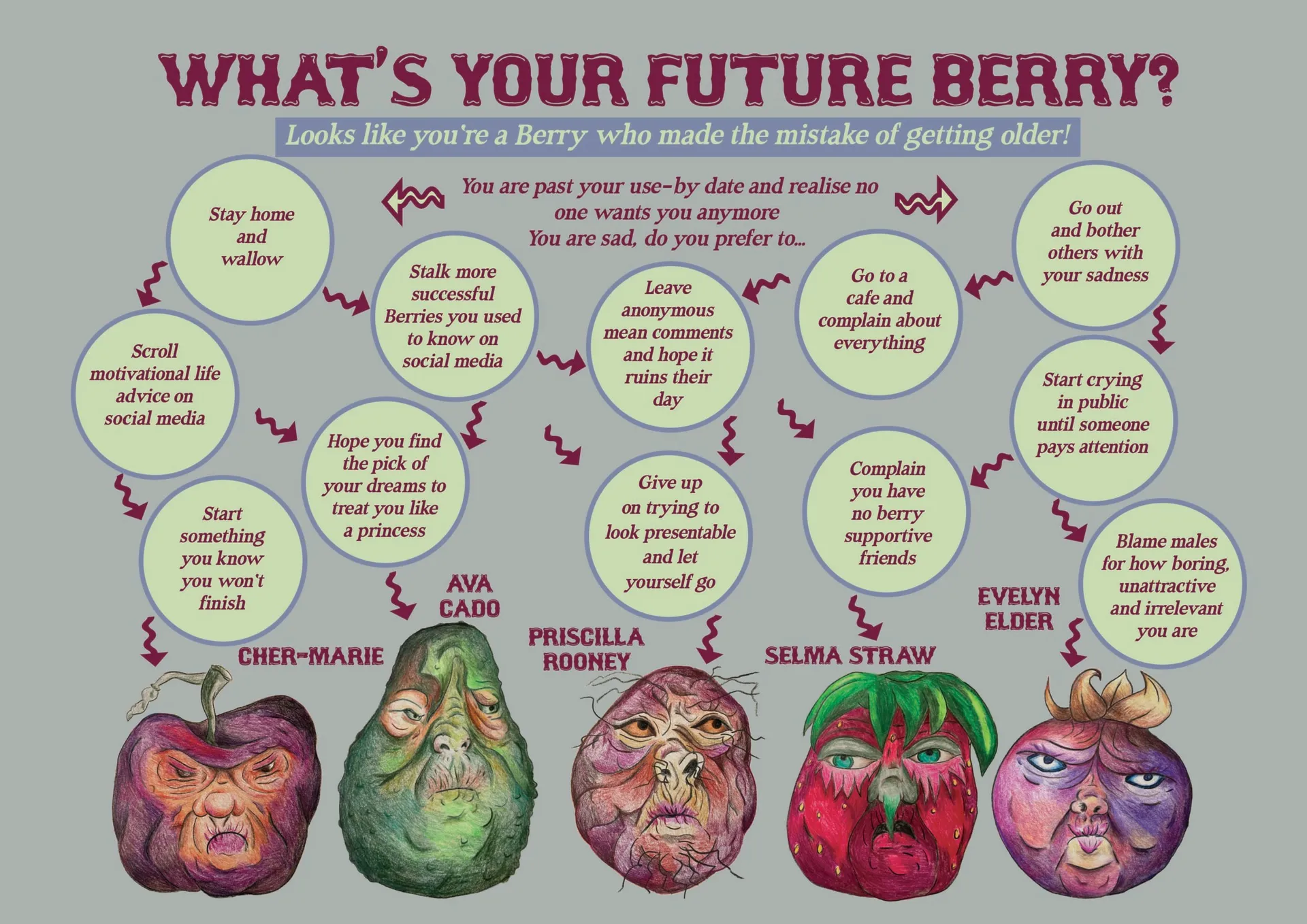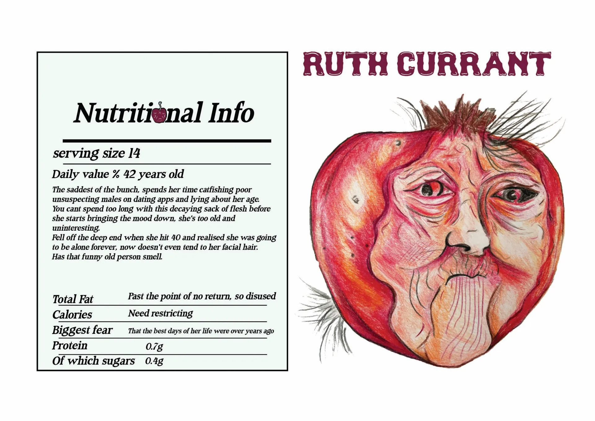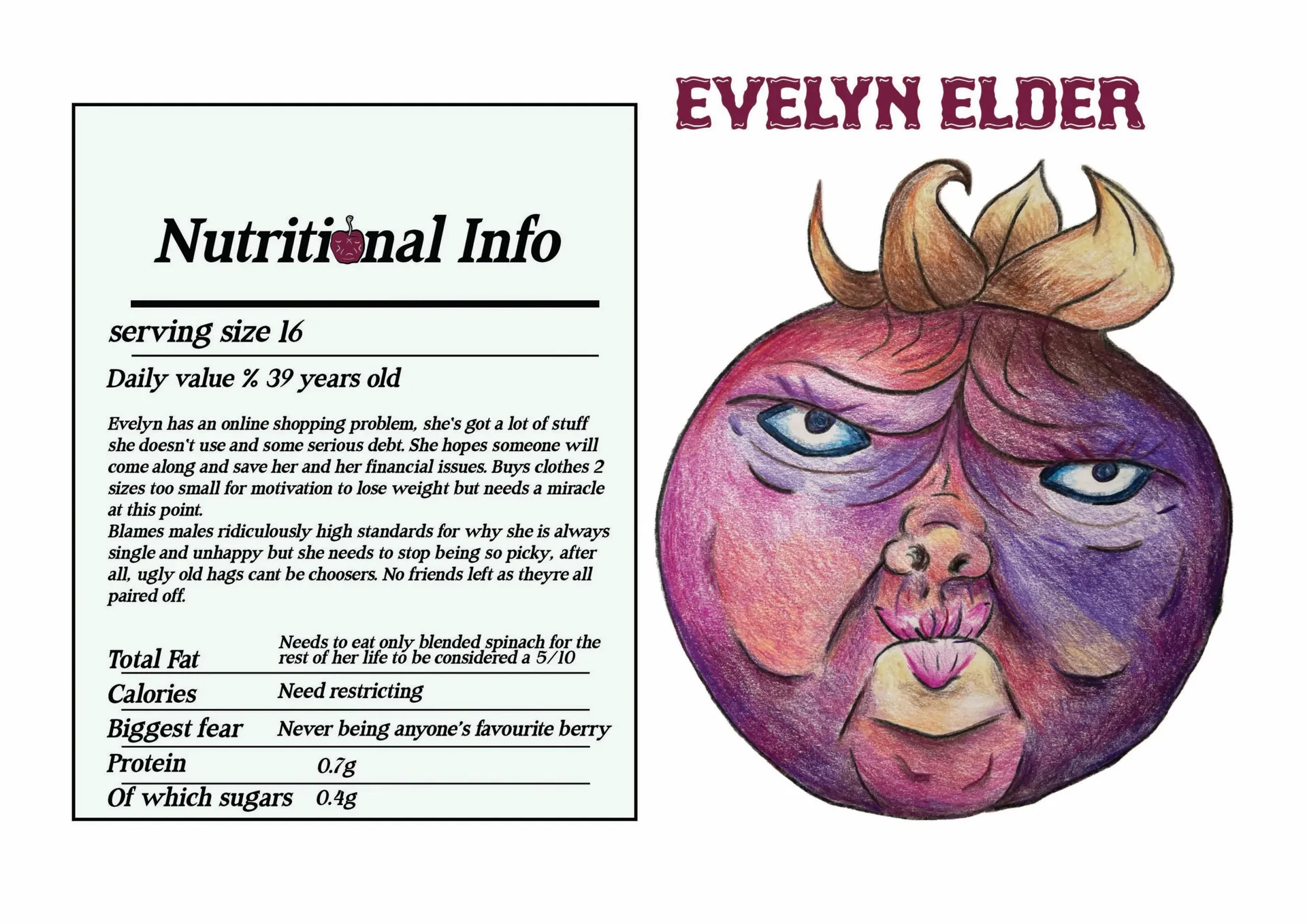 The project imagines these discriminated women as real produce, illustrated to emphasise flaws that society will be judge them for. The old berry ladies are ridiculed and seen as worthless for their lack of youth, beauty, contribution to motherhood and other feminine traits that often equate our worth.