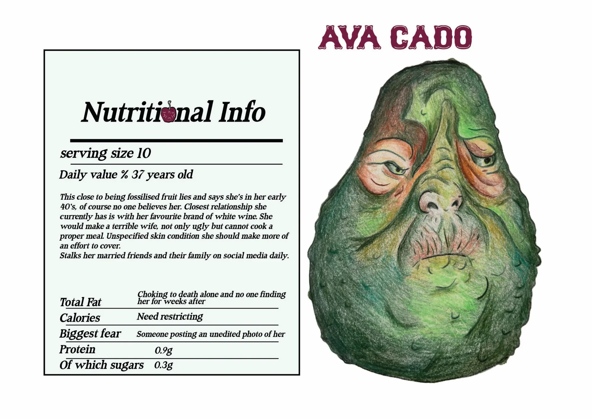 This project consisted of a bound book catalogue of illustrated, satirical characters with mock descriptions, reminiscent of ageist and gender-specific language used most often to describe normal-looking women as old and ‘past their sell-by date’.