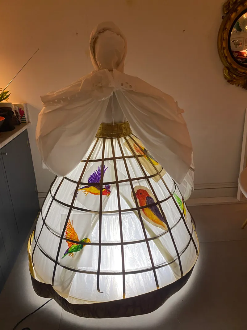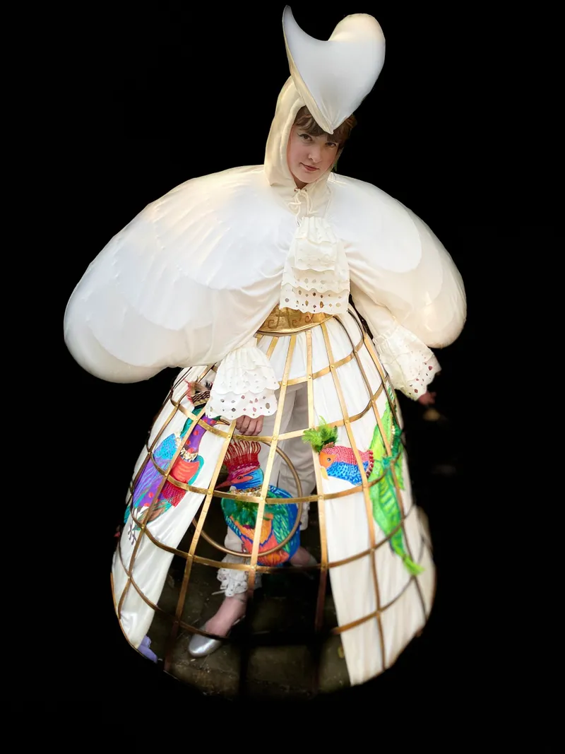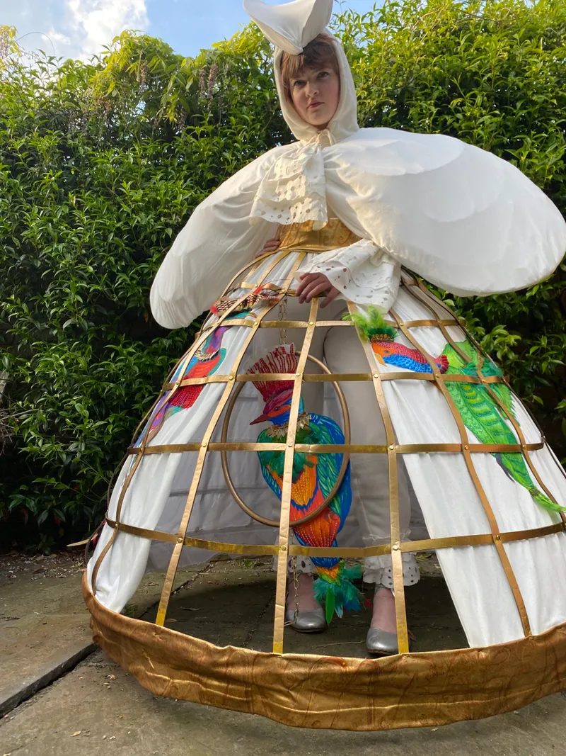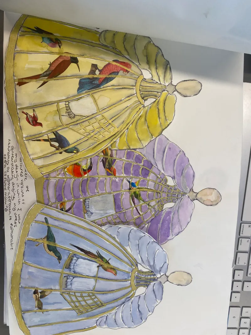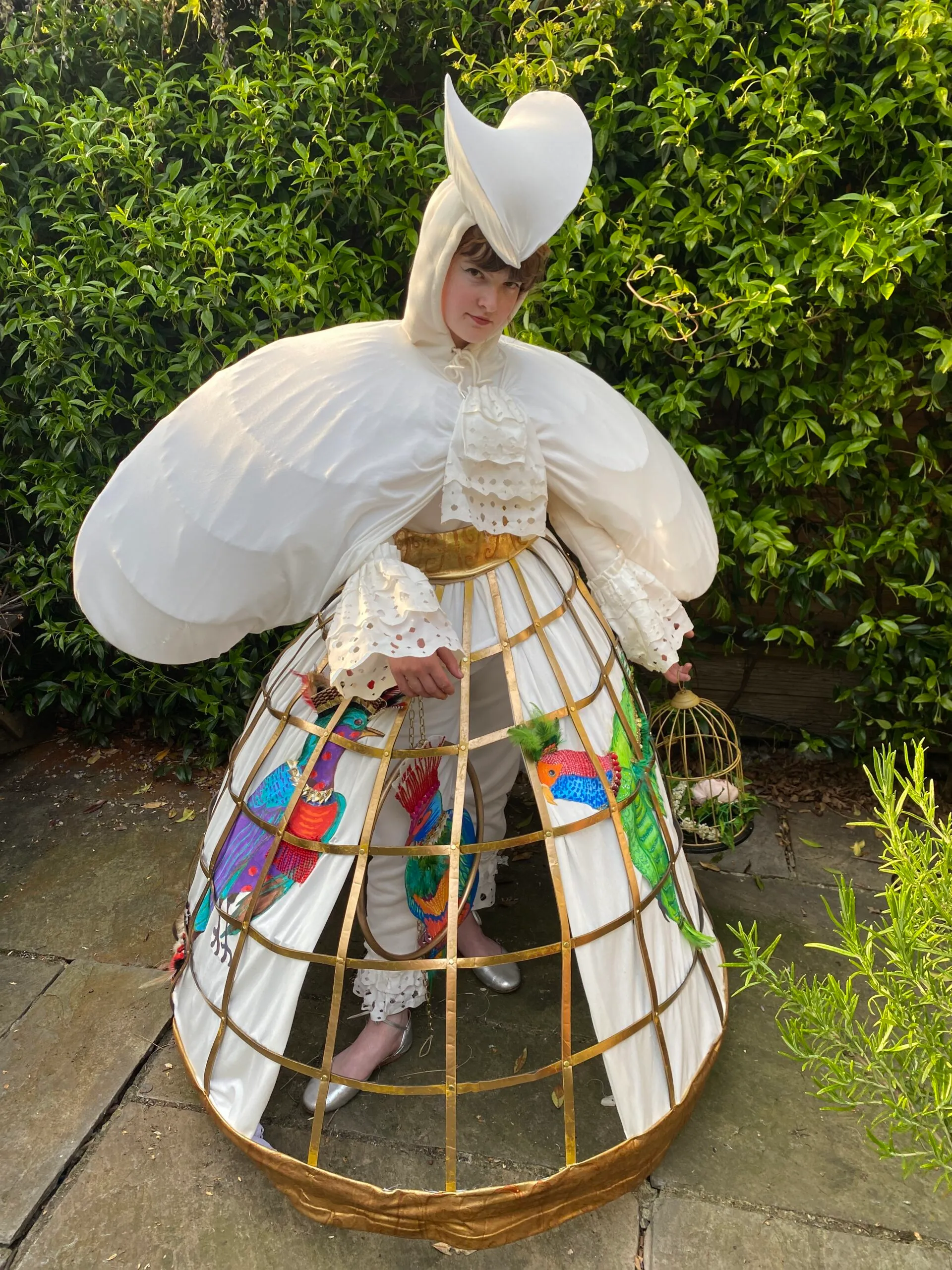 I have designed an opera costume for the character of Papagena (a bird catcher in love with Papageno) in Mozart’s opera the Magic Flute (a favourite opera of mine). My costume for Papagena combines both traditional and modern approaches to opera, given I was bewildered when contemporary opera production designers drastically changed the characters or their costumes within the opera. This idea stemmed from watching Simon McBurney’s production of The Magic Flute at the English National Opera at the London Coliseum, and his dressing of beloved characters like Pamina and Tamino in a bunch of cheap looking tracksuits, that loom as if they were bought from Primark. It simply was a huge disappointment. However, I did find his use of video projections as sets, extremely impressive and I wanted to investigate a costume which showed an appreciation for both traditional and modern approaches to opera. Overall, my costume for Papagena pokes fun at the styling of tracksuits in opera, since it transforms a generic tracksuit into a crazy, surreal and comedic dress.