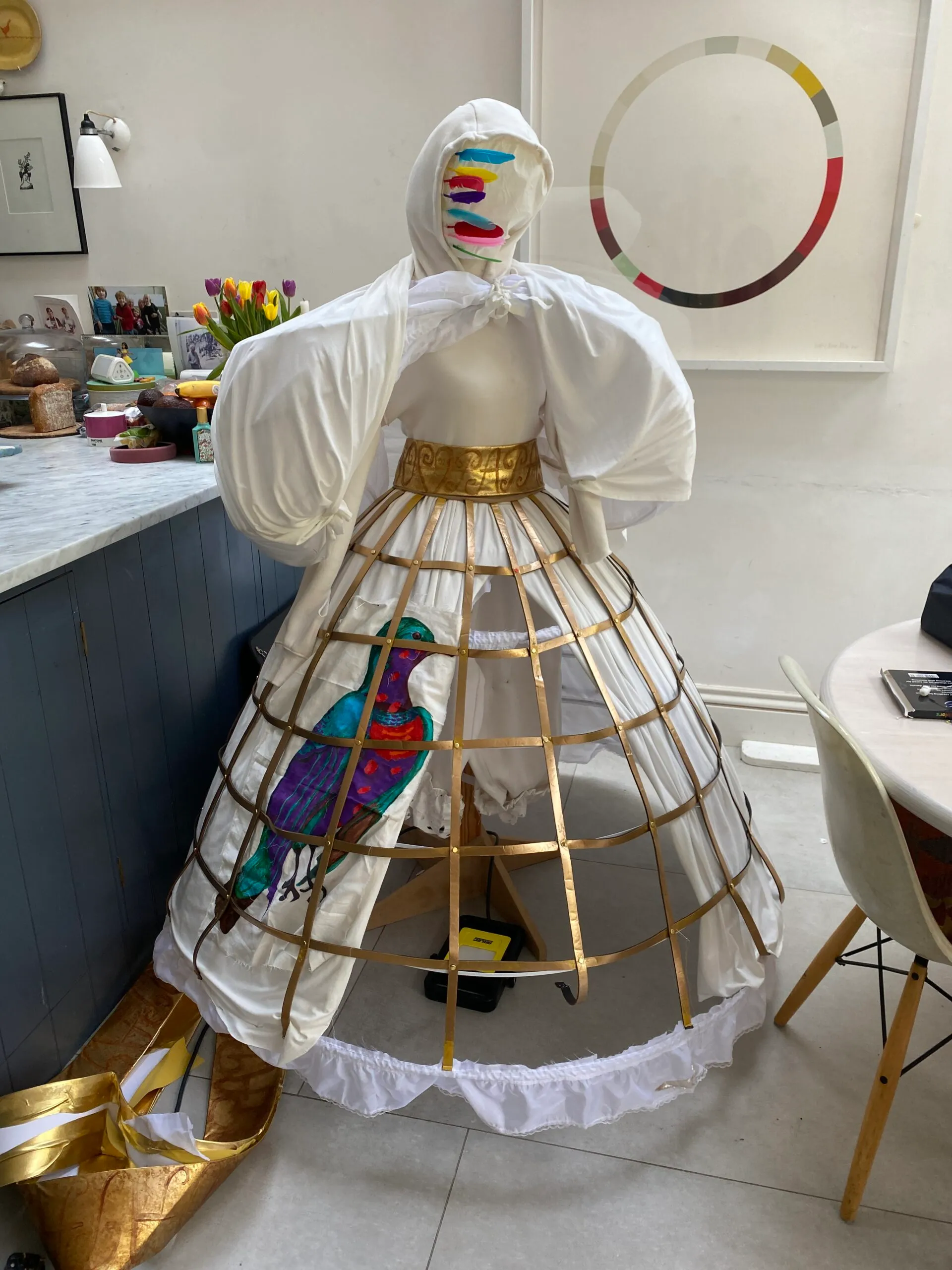 My intention for this costume was to design it in a way that incorporated the beauty of traditional opera costume making i.e. embroidery and combining that with contemporary means such as video projections. In addition, since opera as an art form is exceedingly expensive, I aspired to create an inexpensive opera that used recycled and cost-efficient materials such as rubber neoprene, spray paint and upcycled tracksuits from Primark, to successfully convey the idea that a beautiful opera costume can be made cheaply and sustainably.