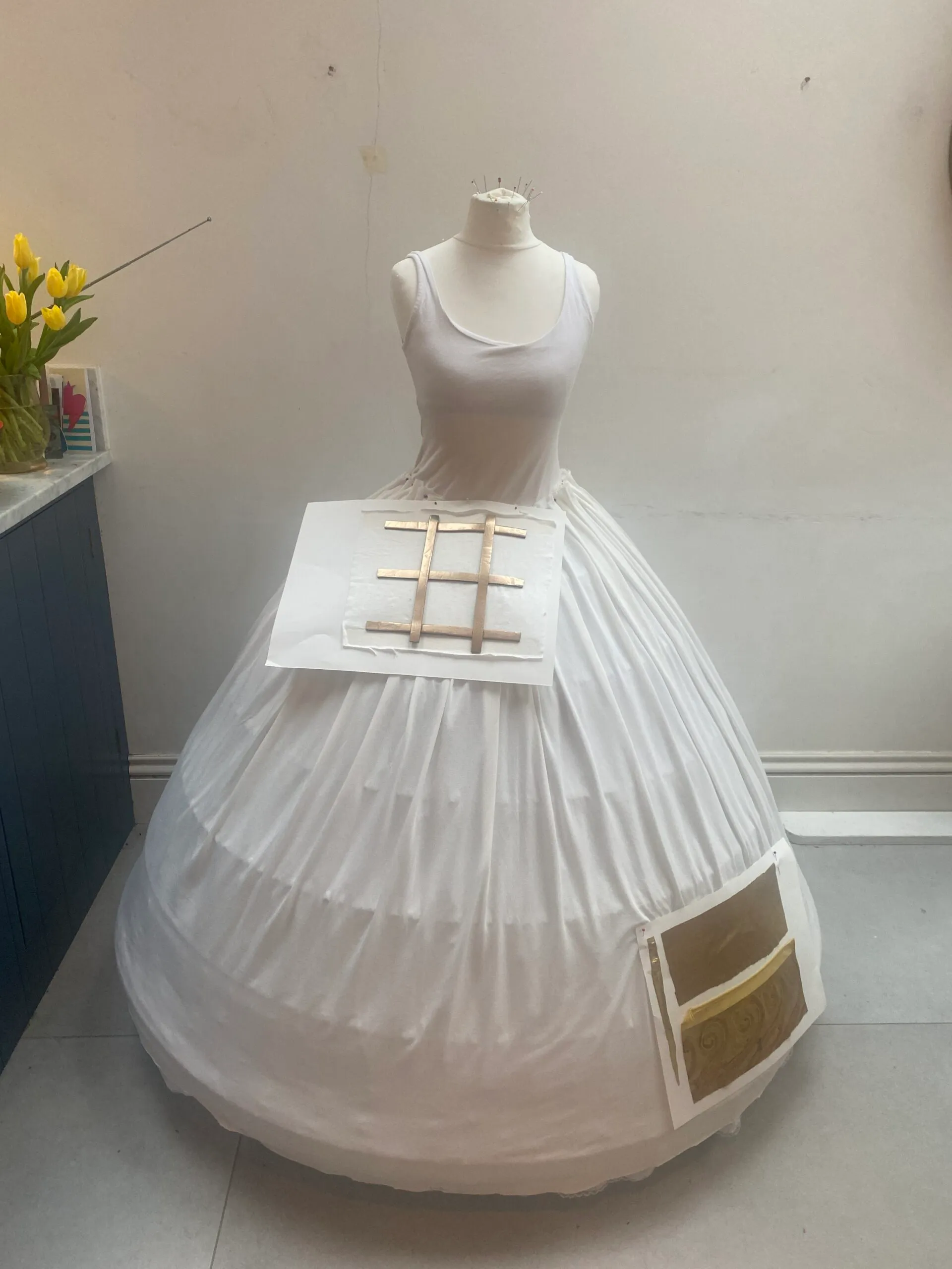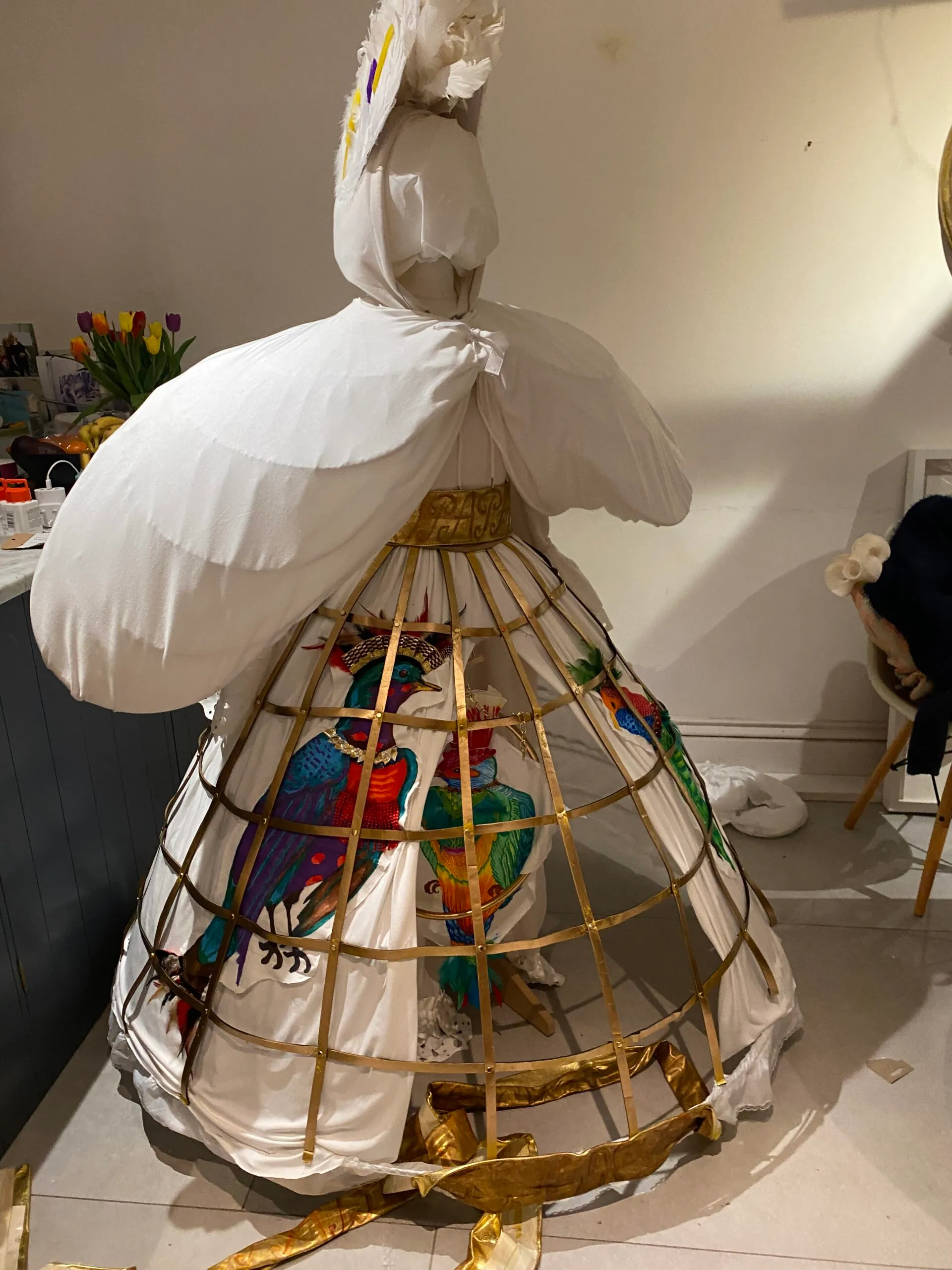My intention for this costume was to design it in a way that incorporated the beauty of traditional opera costume making i.e. embroidery and combining that with contemporary means such as video projections. In addition, since opera as an art form is exceedingly expensive, I aspired to create an inexpensive opera that used recycled and cost-efficient materials such as rubber neoprene, spray paint and upcycled tracksuits from Primark, to successfully convey the idea that a beautiful opera costume can be made cheaply and sustainably.