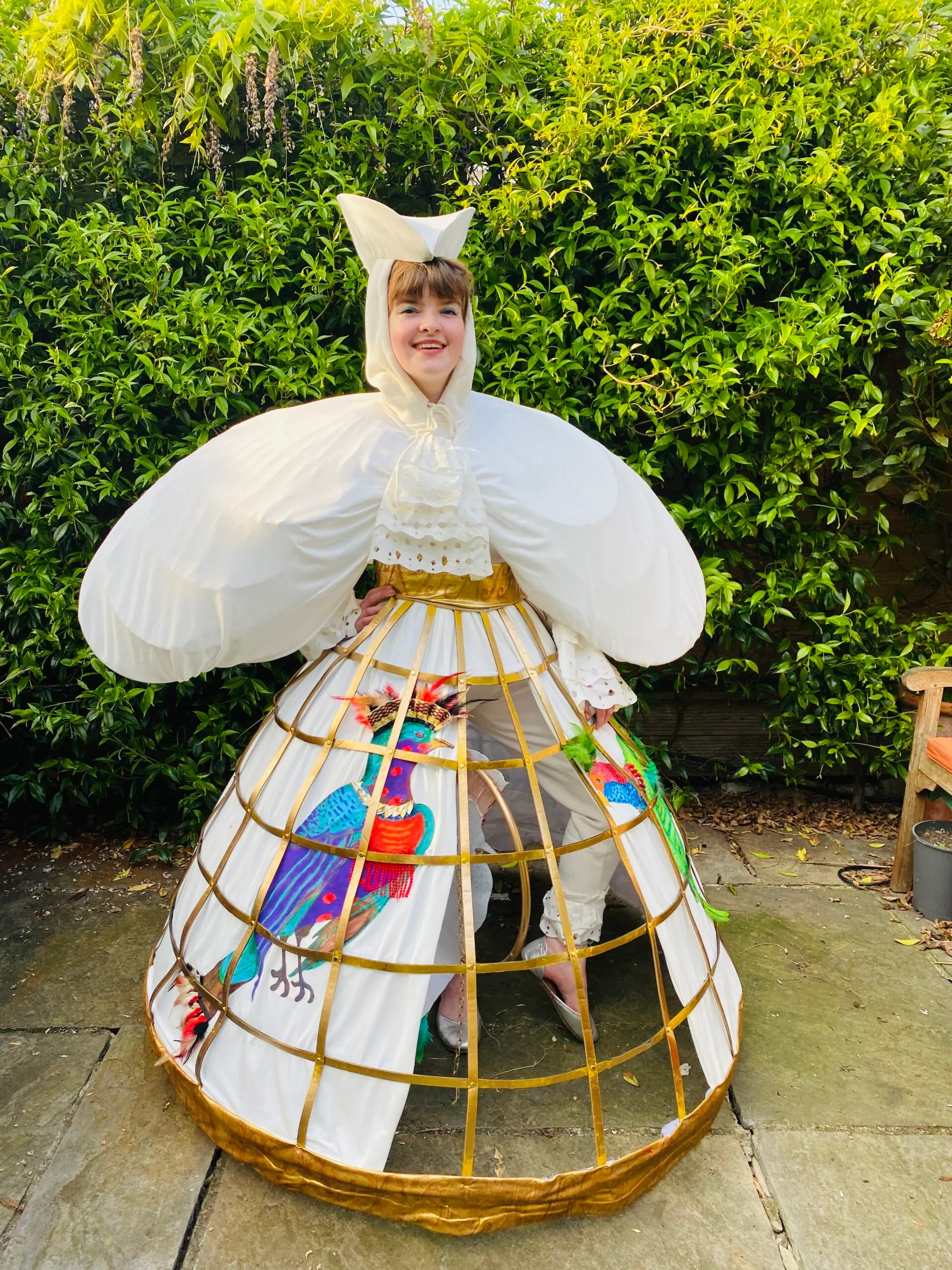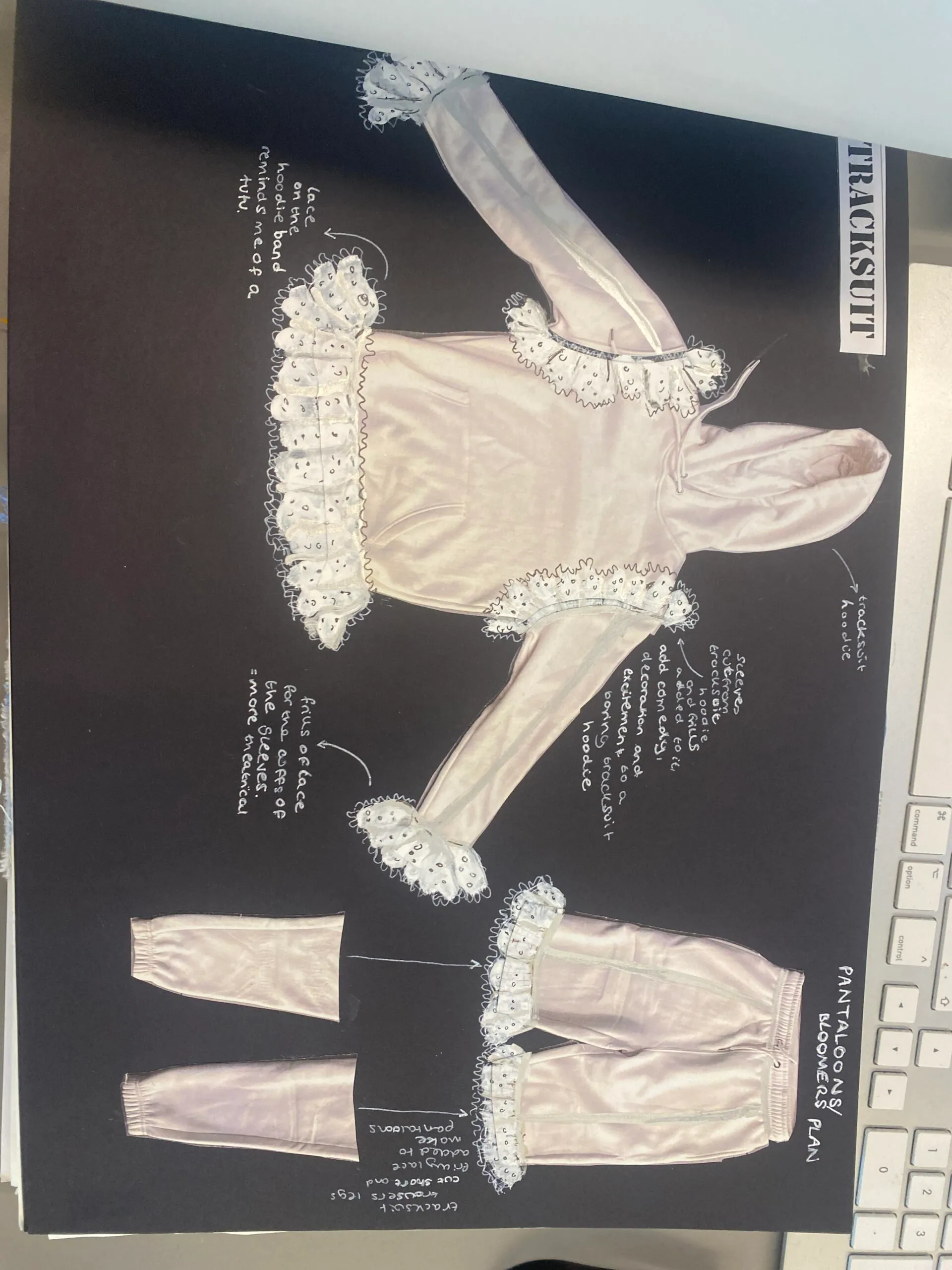 I have designed an opera costume for the character of Papagena (a bird catcher in love with Papageno) in Mozart’s opera the Magic Flute (a favourite opera of mine). My costume for Papagena combines both traditional and modern approaches to opera, given I was bewildered when contemporary opera production designers drastically changed the characters or their costumes within the opera. This idea stemmed from watching Simon McBurney’s production of The Magic Flute at the English National Opera at the London Coliseum, and his dressing of beloved characters like Pamina and Tamino in a bunch of cheap looking tracksuits, that loom as if they were bought from Primark. It simply was a huge disappointment. However, I did find his use of video projections as sets, extremely impressive and I wanted to investigate a costume which showed an appreciation for both traditional and modern approaches to opera. Overall, my costume for Papagena pokes fun at the styling of tracksuits in opera, since it transforms a generic tracksuit into a crazy, surreal and comedic dress.