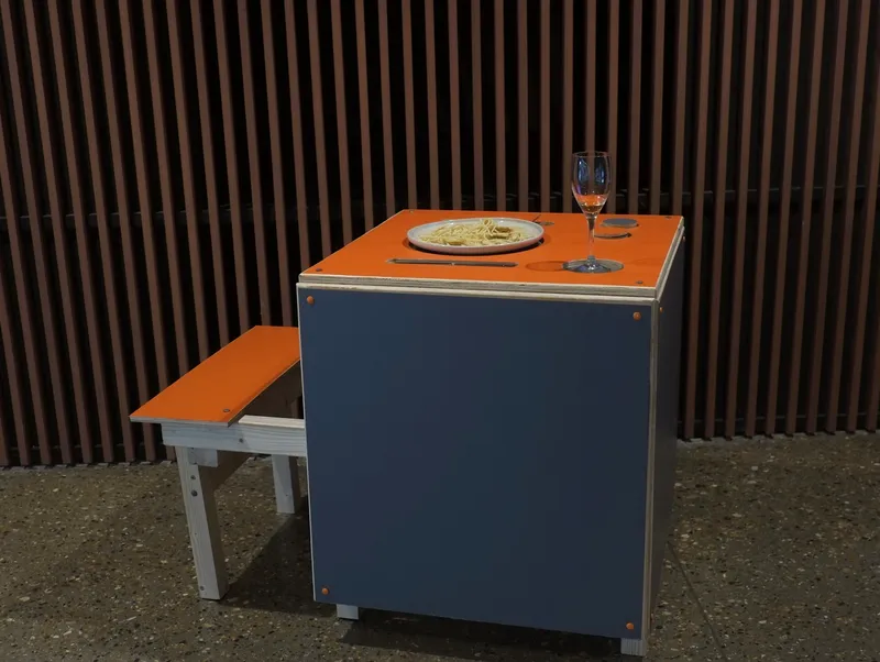 For my final FMP project, I designed and made a table tailored exclusively for solo diners in a restaurant setting. Drawing from my own phobias of social anxiety and food textures, I aimed to challenge the societal taboo surrounding solo dining. My design aims to confront this stigma by providing a comfortable yet empowering space for individuals to dine alone, embracing their fears. Featuring a single-seat structure with cutouts showcasing a complete dining setup, the table encourages the user to enjoy being alone and to in pair face their fears. Additionally, two flip-over discs facilitate seamless communication with the waiter for ordering or requesting the bill.It provides a setting where individuals can embrace being alone without facing judgment, fostering a liberating dining atmosphere.