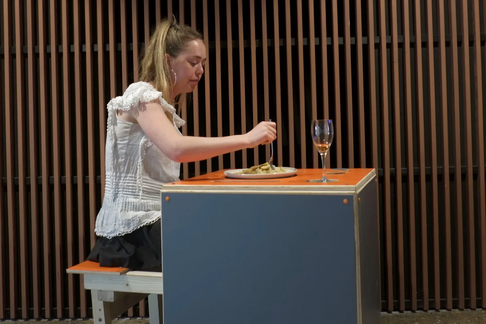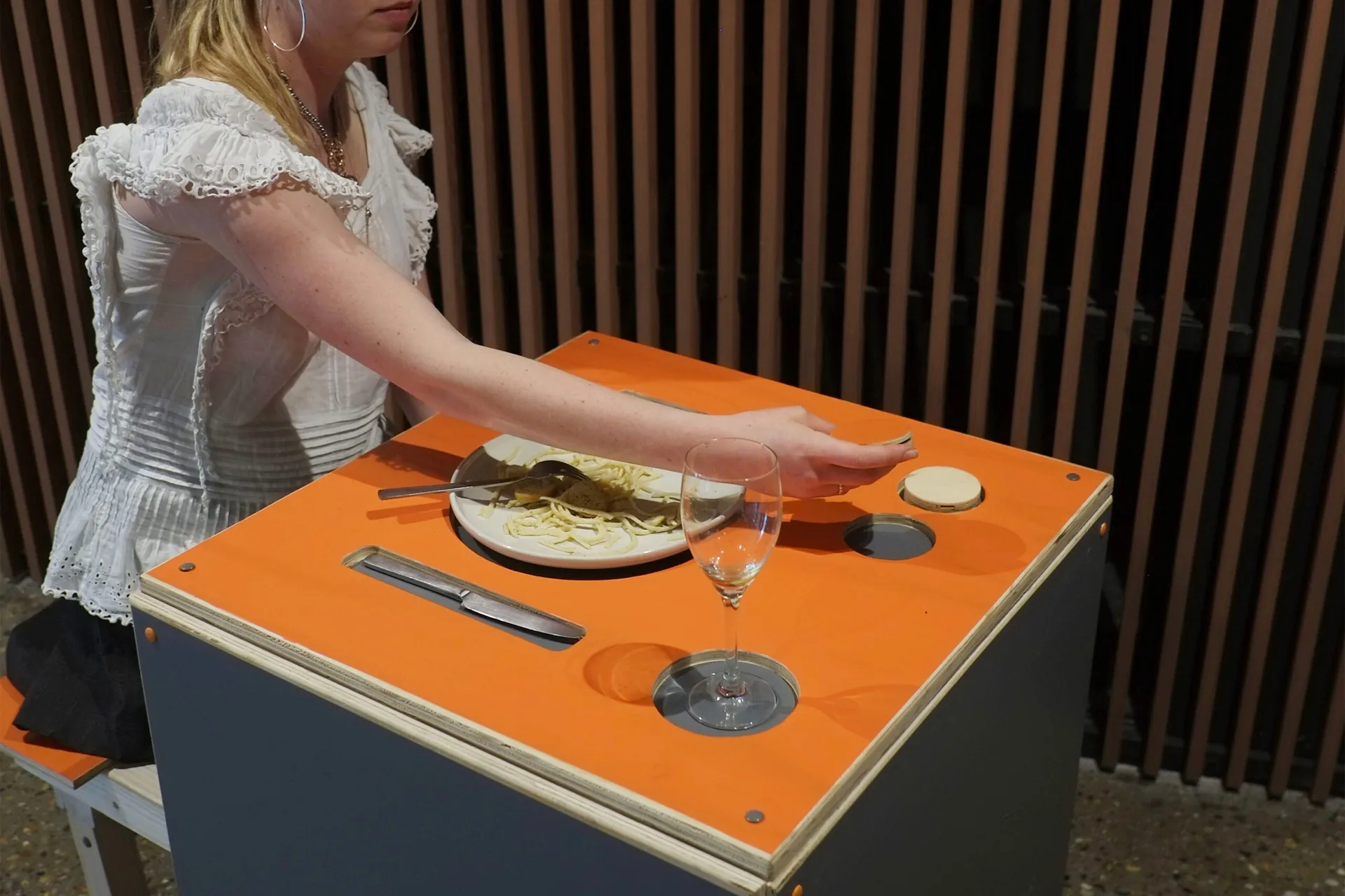 For my final FMP project, I designed and made a table tailored exclusively for solo diners in a restaurant setting. Drawing from my own phobias of social anxiety and food textures, I aimed to challenge the societal taboo surrounding solo dining. My design aims to confront this stigma by providing a comfortable yet empowering space for individuals to dine alone, embracing their fears. Featuring a single-seat structure with cutouts showcasing a complete dining setup, the table encourages the user to enjoy being alone and to in pair face their fears. Additionally, two flip-over discs facilitate seamless communication with the waiter for ordering or requesting the bill.It provides a setting where individuals can embrace being alone without facing judgment, fostering a liberating dining atmosphere.