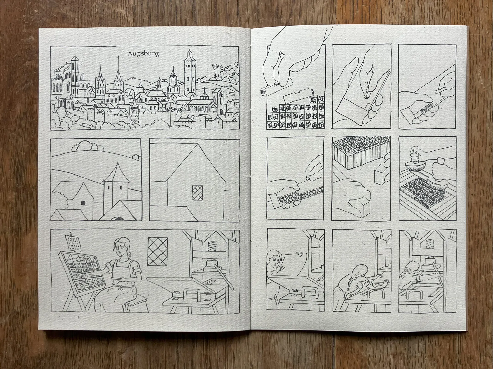 An ongoing comic following two women from opposite ends of the class spectrum, leading up to the German Peasants’ Revolt of 1524–25. The comic combines drawn panels with letterpress and woodcut printing, growing technologies from the time.
