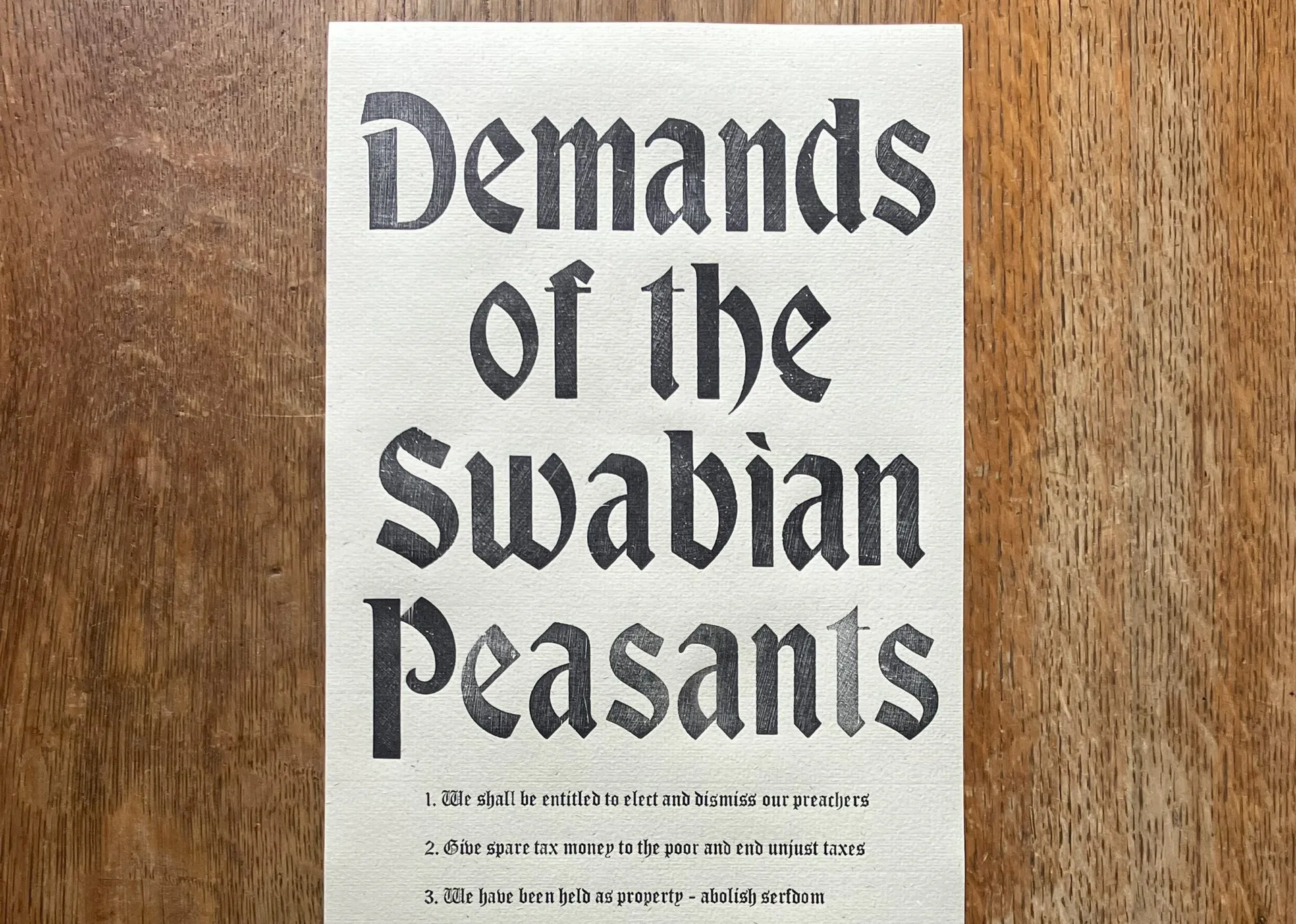 An ongoing comic following two women from opposite ends of the class spectrum, leading up to the German Peasants’ Revolt of 1524–25. The comic combines drawn panels with letterpress and woodcut printing, growing technologies from the time.