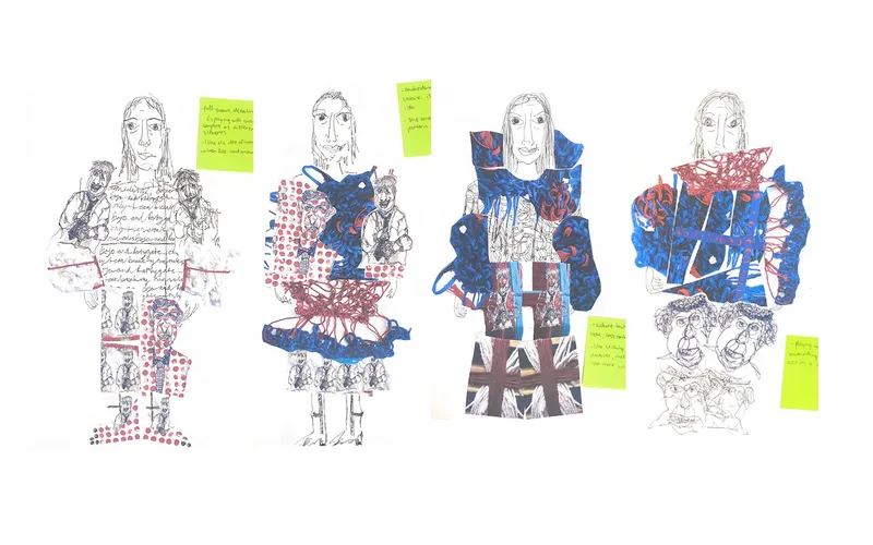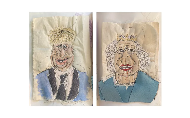Here I explored traditional English ceremonies and events and I collaged imagery to visualise their unique nature. Further on, I asked what words people associate with ‘England’ and responded with draping and designs. I also explored political satire and took inspiration from the show ‘Spitting Image’, to machine stitch certain British figures.