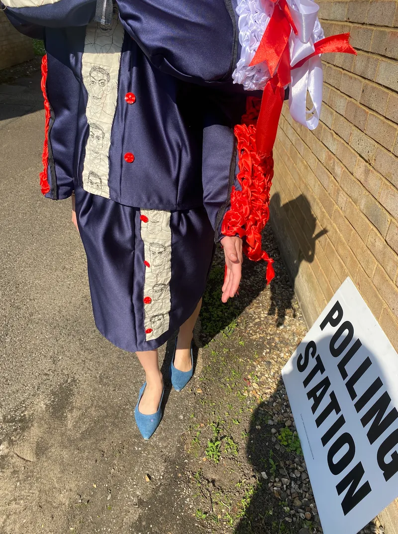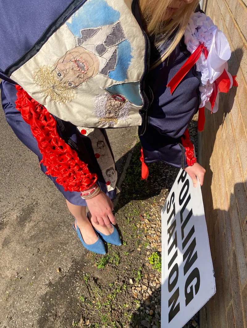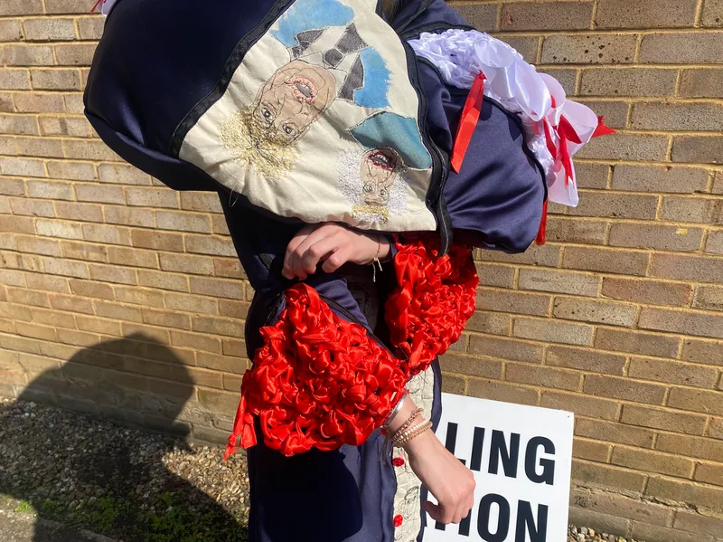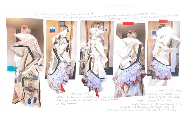 My Project ‘Britain Scrutinised’ was inspired by the awkwardness I felt around English patriotism due to the negative connotations I had attached to the term. Investigating culture and satire, I aimed to produce a garment which could denounce and celebrate depictions of England. As part of my outcome, I incorporated zips into the garment which would conceal and reveal those aspects. My final outcome is a midi-skirt and jacket, which on it rests a shoulder garment to reflect the baggage associated with the term ‘Britain’. Using textiles, I crochet ribbons to reference May Pole dancing and Morris dancing, while using machine stitch as a method of drawing to satirise figures such as Boris Johnson, Rishi Sunak and Queen Elizabeth.