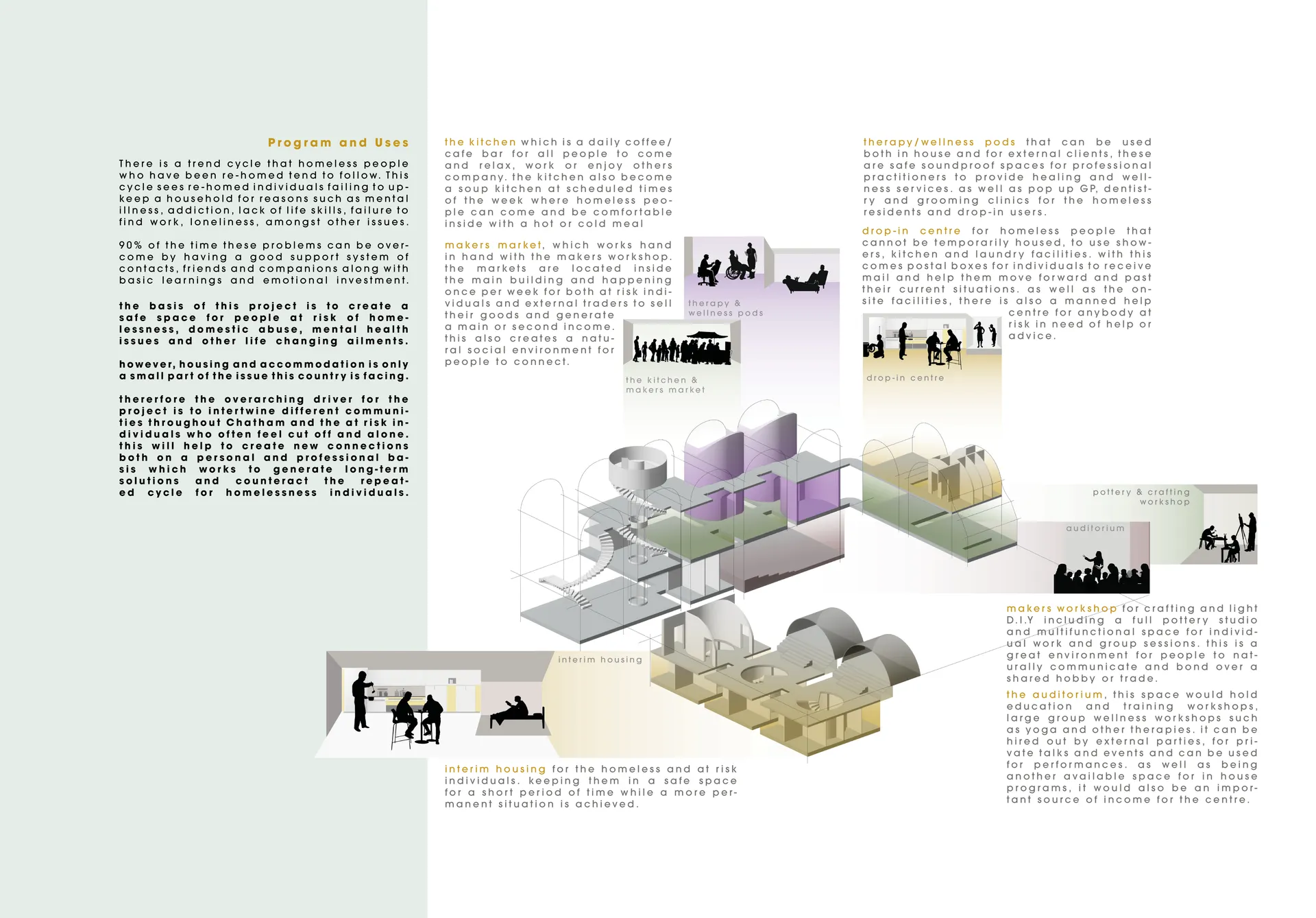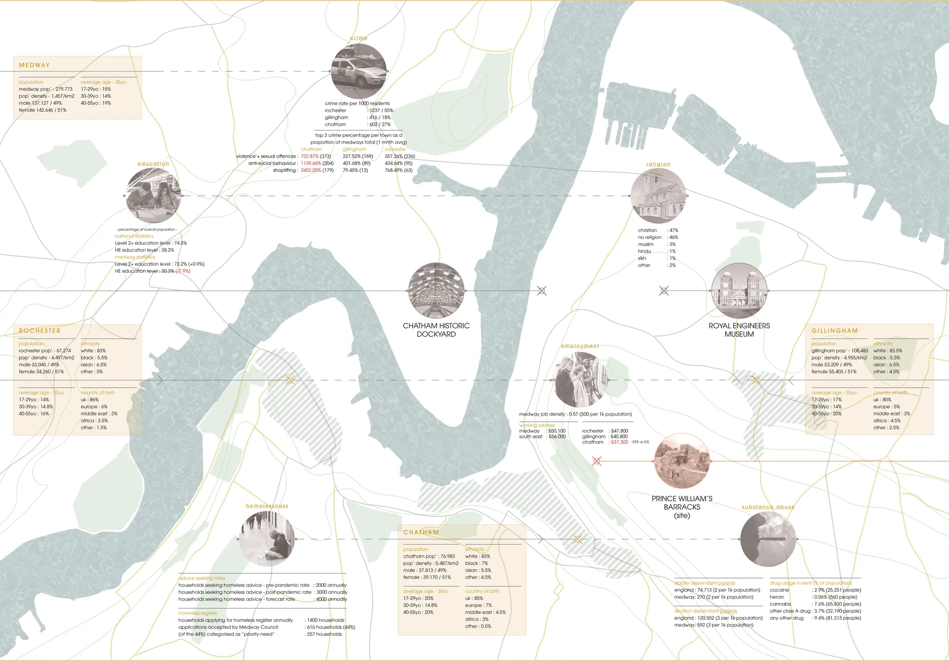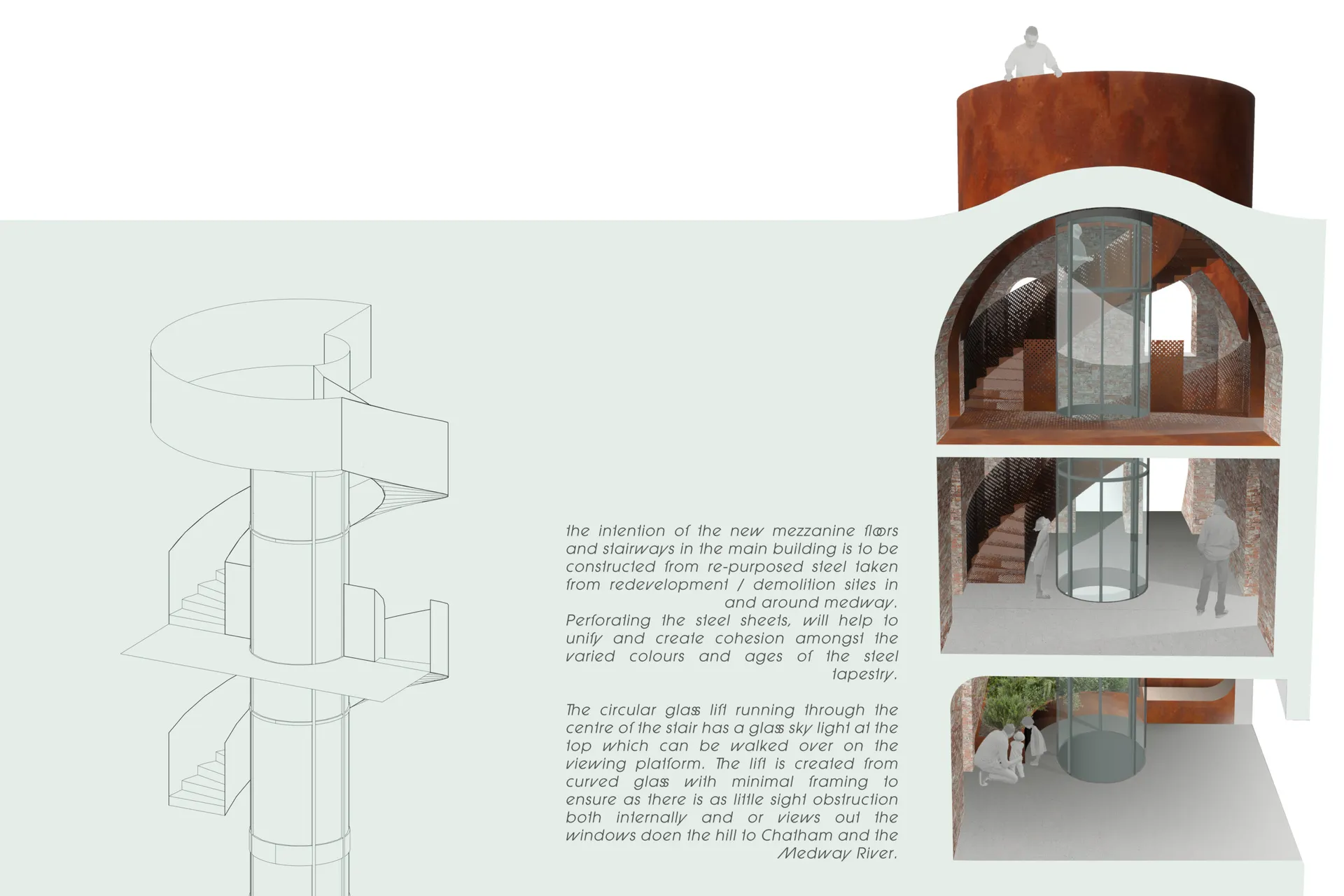 My proposal occupies Prince William’s Barracks, a building that was created to protect Chatham. My intention was to conserve and focalise the existing with minimal intervention and adopt sustainable methods, reusing materials taken from local redevelopment in and around Chatham.