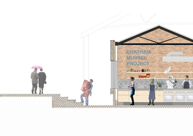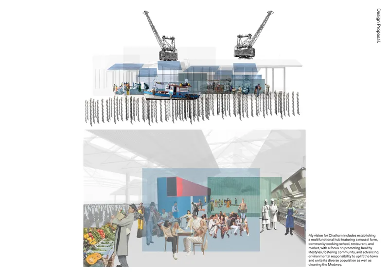Chatham Mussel Project aims to rejuvenate Chatham by promoting healthy food habits and sustainable practices, such as zero-input mussel farming, creating a communal space for education and collaboration. Integrating features like community kitchens, cooking schools, and markets will foster connection and shared knowledge, while partnering with local initiatives like the Rochester oyster and floating fishery will bridge divides and promote community cohesion. Through these efforts, I aspire to offer a new narrative of pride and progress, revitalising Chatham’s social and physical landscape.