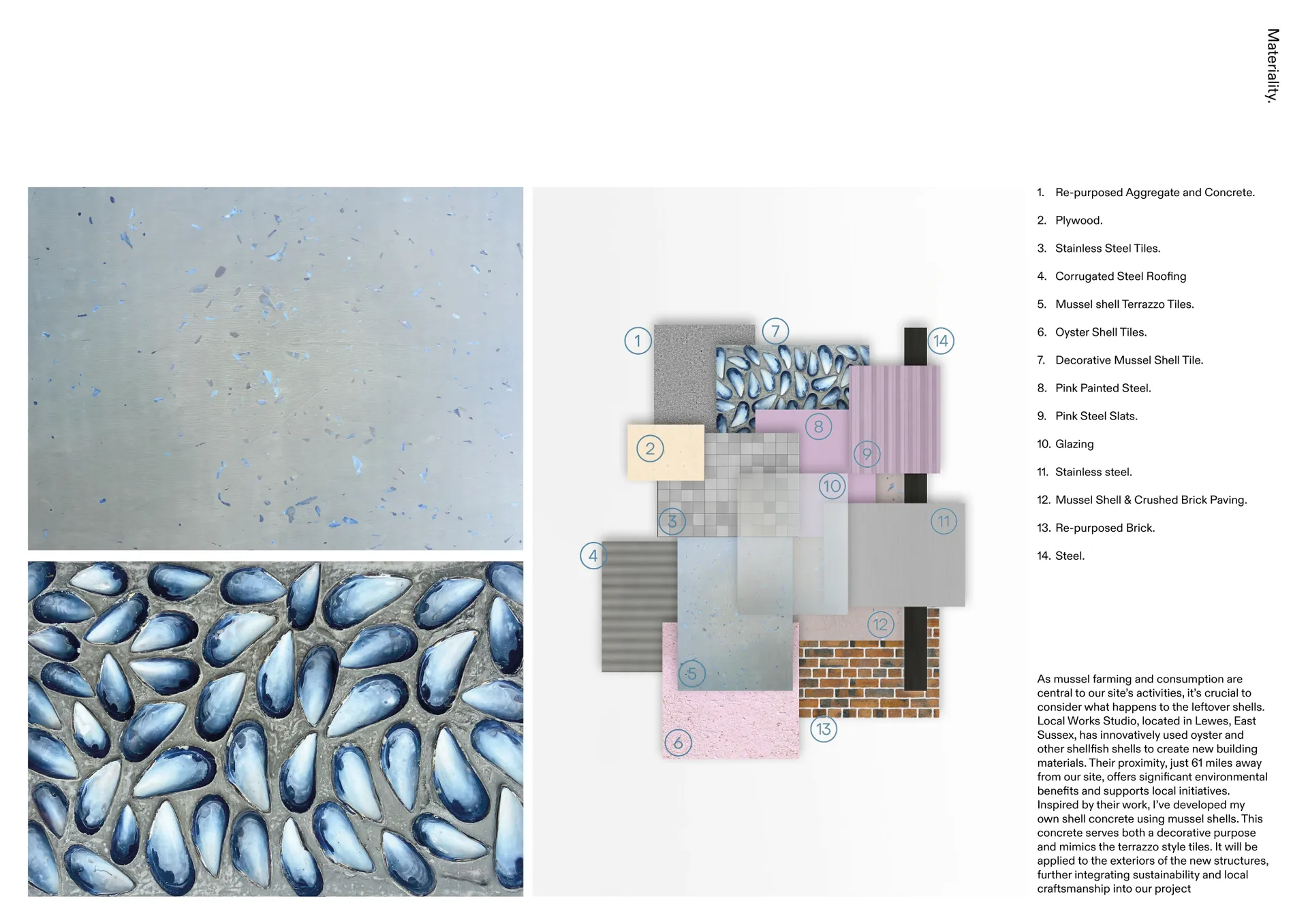 Chatham Mussel Project aims to rejuvenate Chatham by promoting healthy food habits and sustainable practices, such as zero-input mussel farming, creating a communal space for education and collaboration. Integrating features like community kitchens, cooking schools, and markets will foster connection and shared knowledge, while partnering with local initiatives like the Rochester oyster and floating fishery will bridge divides and promote community cohesion. Through these efforts, I aspire to offer a new narrative of pride and progress, revitalising Chatham’s social and physical landscape.