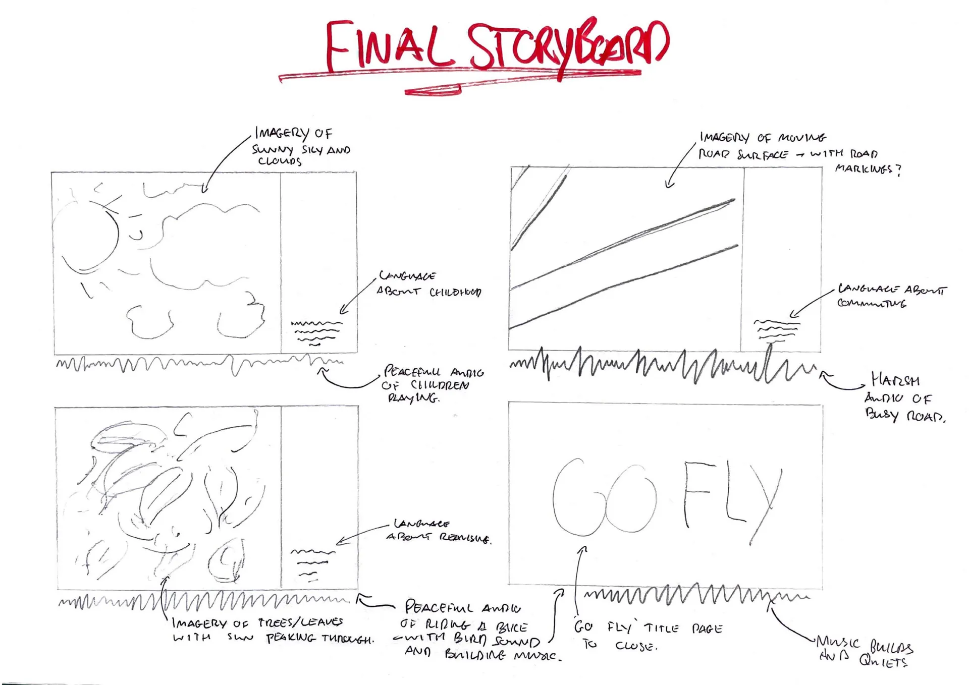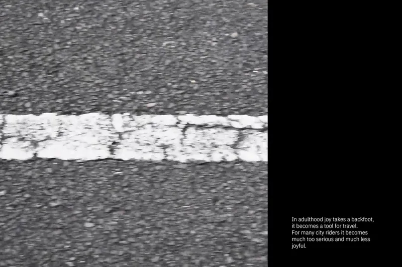 For my final piece I have made a video highlighting the feelings of riding a bicycle and how they can change throughout people’s lives and experiences. It consists of three sections depicting childhood joy, the stress of commuting by bike and the reconnection with the childhood joy. The aim of this piece is to encourage those who don’t cycle to reconnect with their childhood enjoyments and experience the sense of flying that a bicycle can give you, as well as showing those who may cycle but don’t enjoy it for what it is the peaceful romance of being in the saddle.
