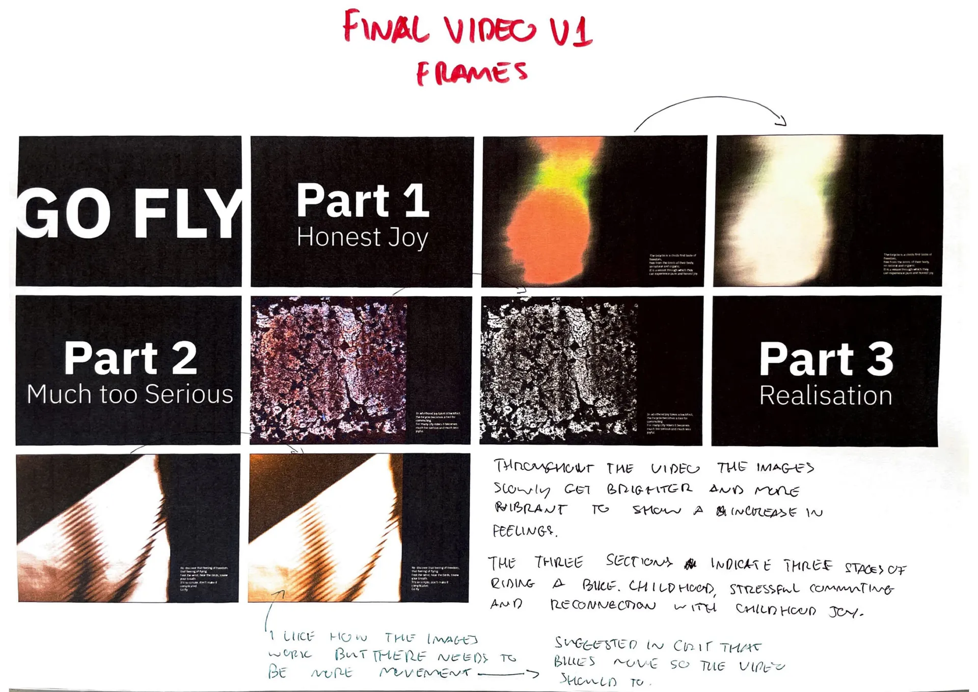 For my final piece I have made a video highlighting the feelings of riding a bicycle and how they can change throughout people’s lives and experiences. It consists of three sections depicting childhood joy, the stress of commuting by bike and the reconnection with the childhood joy. The aim of this piece is to encourage those who don’t cycle to reconnect with their childhood enjoyments and experience the sense of flying that a bicycle can give you, as well as showing those who may cycle but don’t enjoy it for what it is the peaceful romance of being in the saddle.