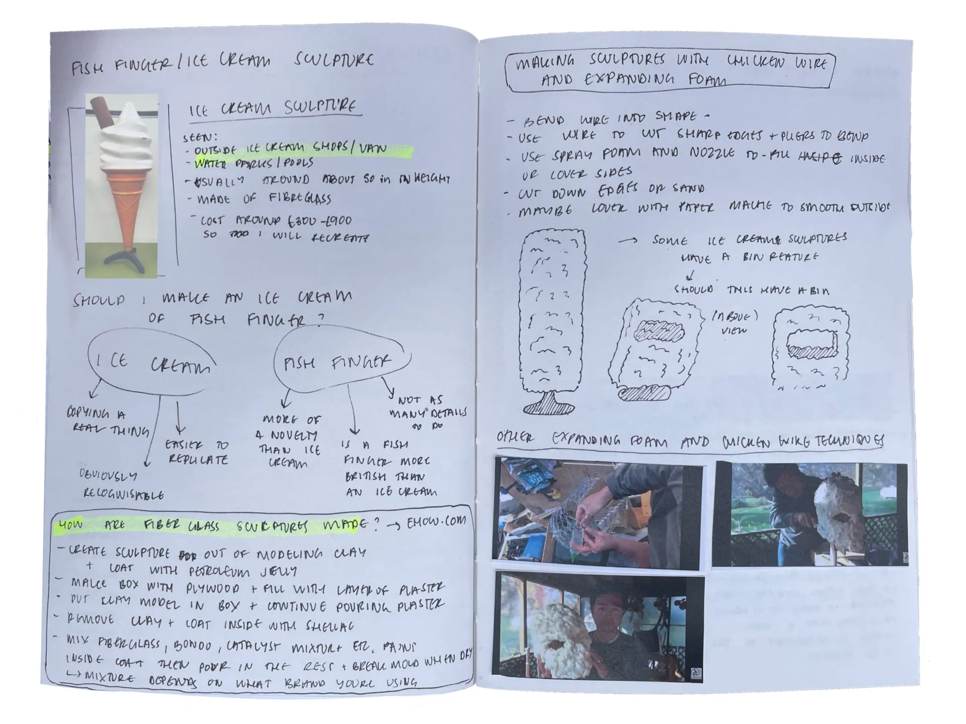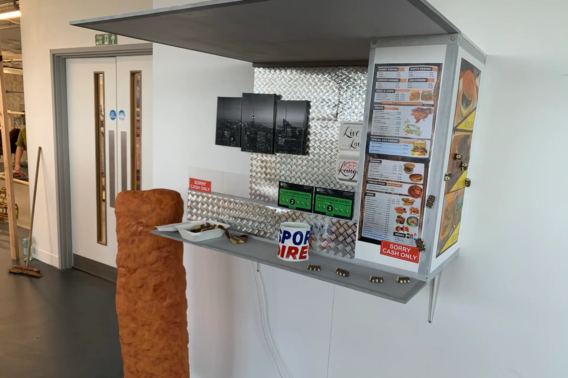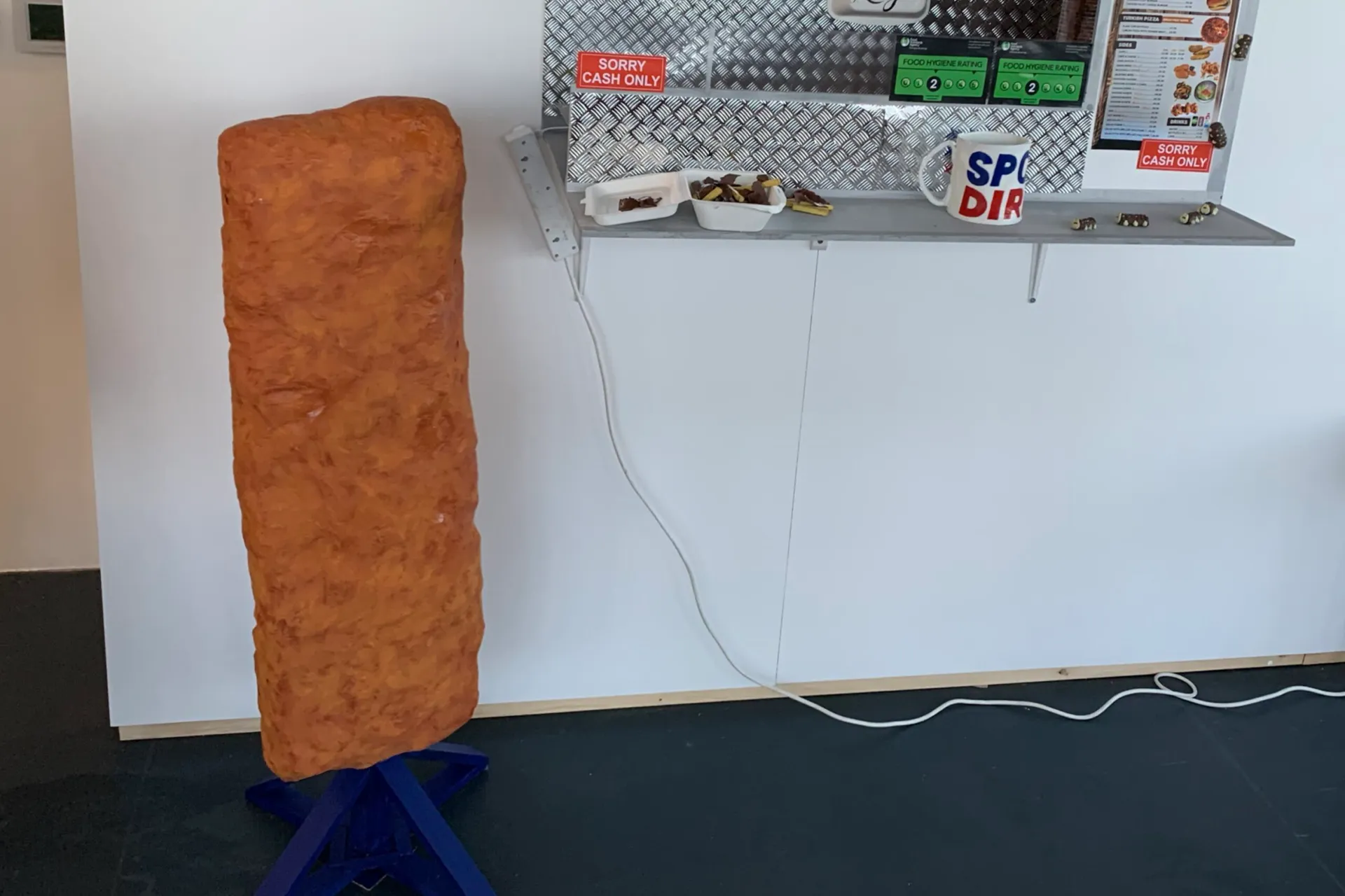 During my project I explored nostalgia, memory, and simply British averageness. I intended my final outcome to have a level of relatability in at least one part of the piece for someone as it’s an amalgamation of somewhat iconic and hopefully recognisable British objects. Previously I have explored replication, testing how detailed recreations of objects can evoke memory. I found it interesting to spend a long amount of time recreating something as it really makes you rethink the materiality of the object. For example, my recreation of a sports direct mug, whose design I hadn’t thought much of before. Yet I now realise it’s obvious nationalistic design of the white, red and blue, the same colours as the British flag. But since I have a continuous theme of satire throughout my work, I wanted this piece to be more than just recreations of objects, so I began to play with scale for comic effect. Because an absurdly large fish finger and tiny sweet little Colin the caterpillar cakes are far more interesting than when they’re at their real size. I wanted all the separate pieces to live in one space to make them cohesive and I felt a kebab van was perfect for this. It is based off Bourton Kebab Van from home, and is a slightly distorted version, yet still has its essence. Its particularly iconic at home, and so are kebab shops throughout Britain in general. Lastly, I explored the power of scent in evoking nostalgia, so I decided to cover the van in Bacon smelling spray as a reminder of British BBQs and in impulse body spray as a throwback to year 8 changing rooms which stank of this.