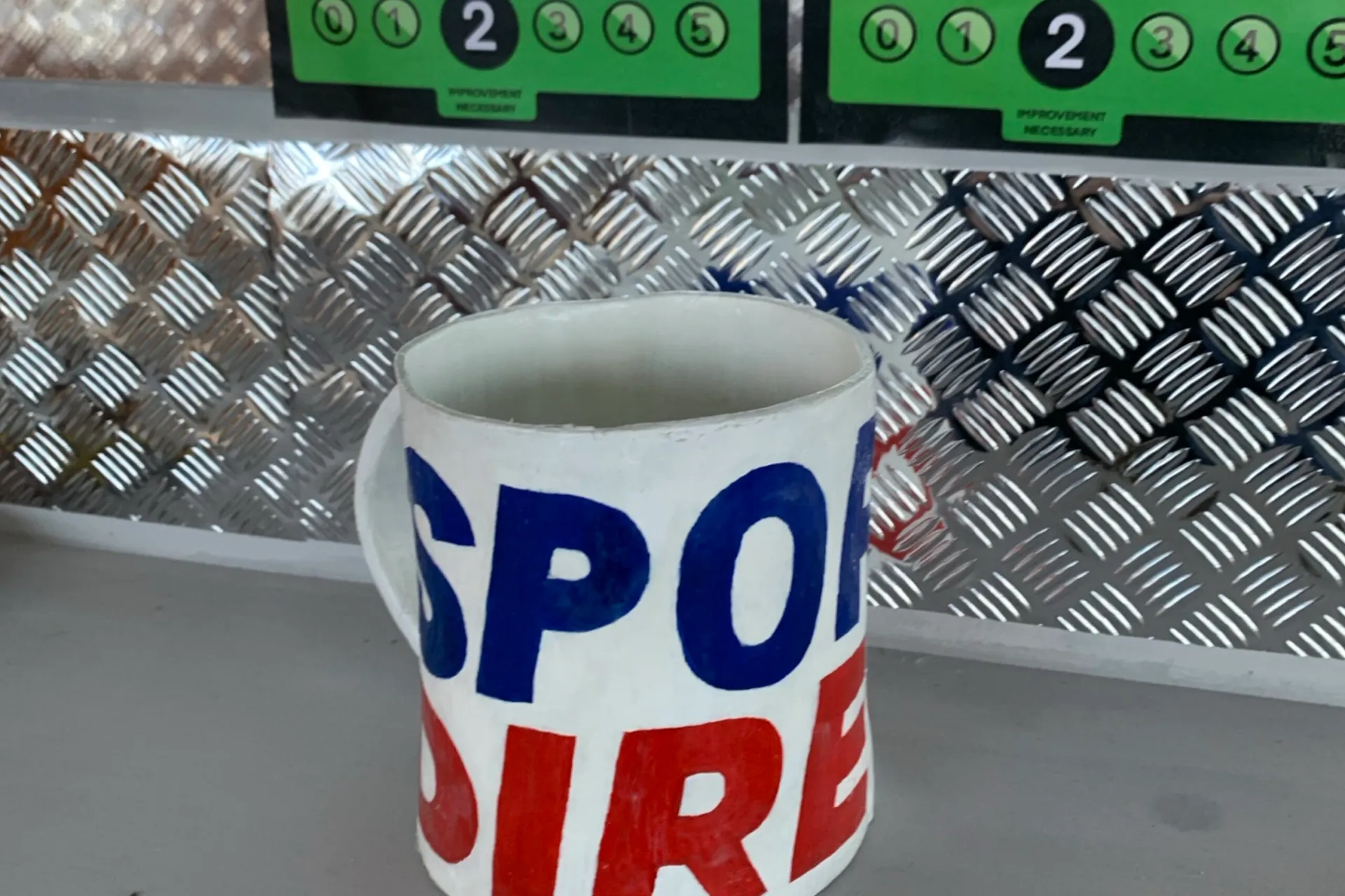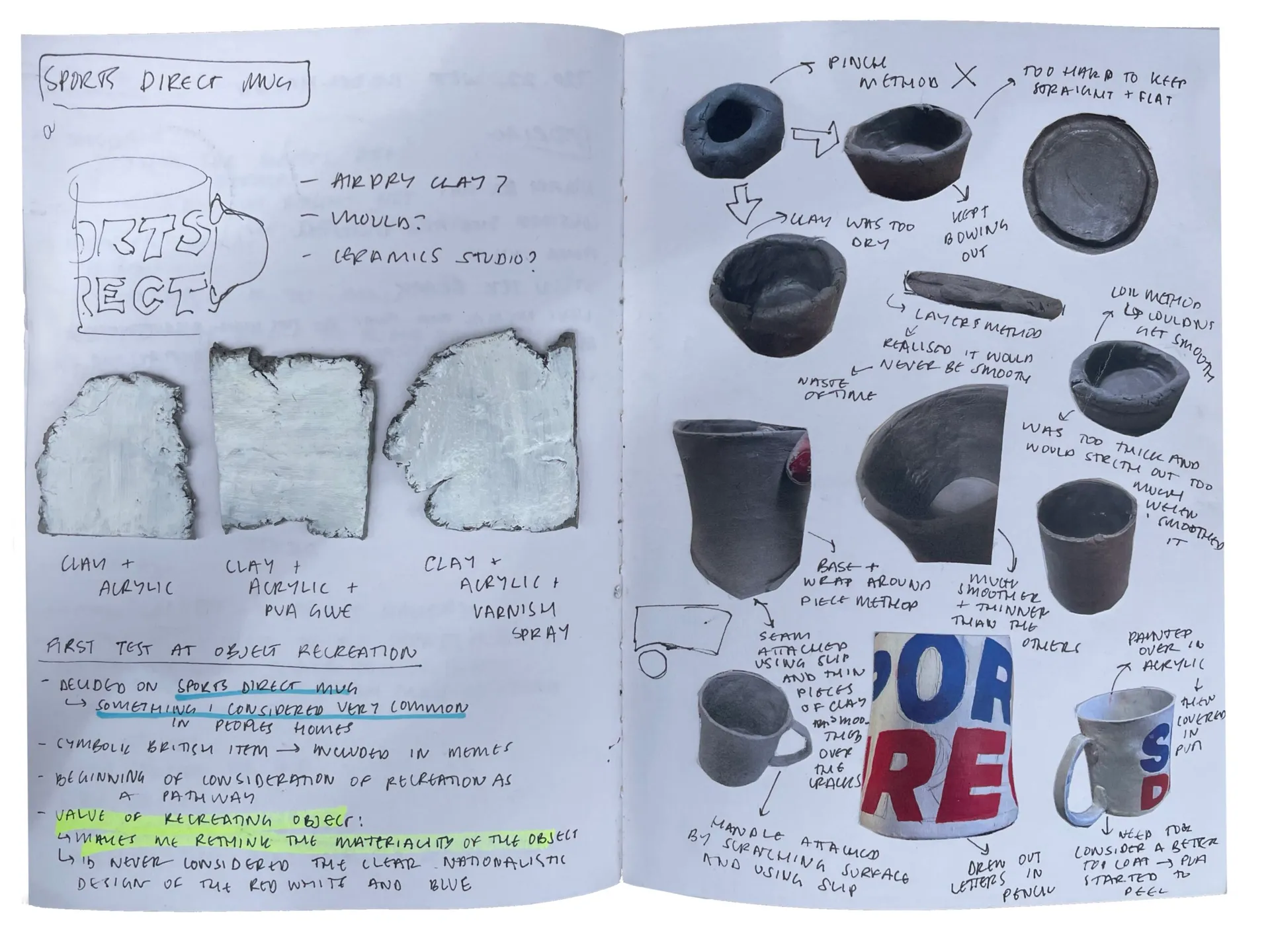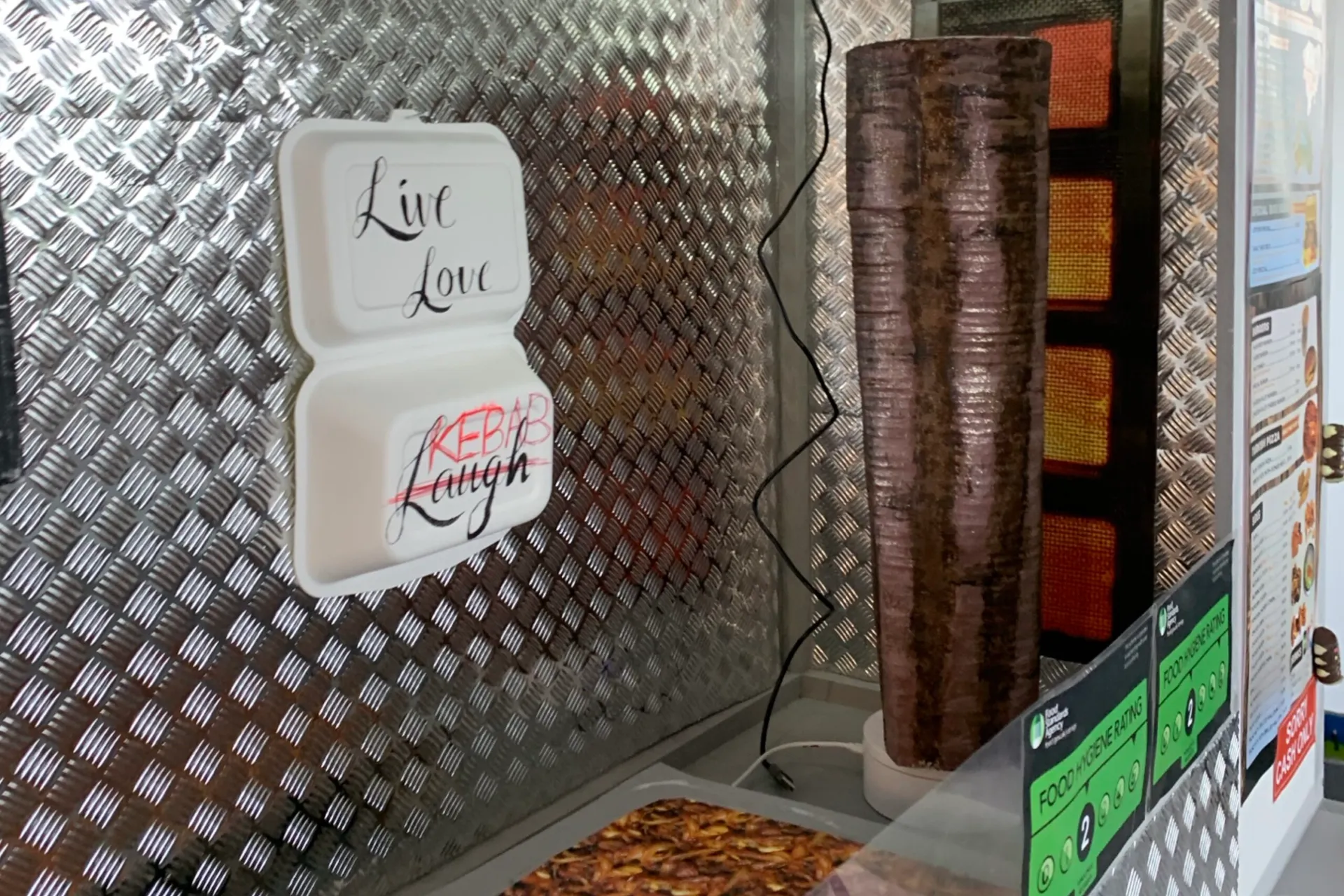 During my project I explored nostalgia, memory, and simply British averageness. I intended my final outcome to have a level of relatability in at least one part of the piece for someone as it’s an amalgamation of somewhat iconic and hopefully recognisable British objects. Previously I have explored replication, testing how detailed recreations of objects can evoke memory. I found it interesting to spend a long amount of time recreating something as it really makes you rethink the materiality of the object. For example, my recreation of a sports direct mug, whose design I hadn’t thought much of before. Yet I now realise it’s obvious nationalistic design of the white, red and blue, the same colours as the British flag. But since I have a continuous theme of satire throughout my work, I wanted this piece to be more than just recreations of objects, so I began to play with scale for comic effect. Because an absurdly large fish finger and tiny sweet little Colin the caterpillar cakes are far more interesting than when they’re at their real size. I wanted all the separate pieces to live in one space to make them cohesive and I felt a kebab van was perfect for this. It is based off Bourton Kebab Van from home, and is a slightly distorted version, yet still has its essence. Its particularly iconic at home, and so are kebab shops throughout Britain in general. Lastly, I explored the power of scent in evoking nostalgia, so I decided to cover the van in Bacon smelling spray as a reminder of British BBQs and in impulse body spray as a throwback to year 8 changing rooms which stank of this.