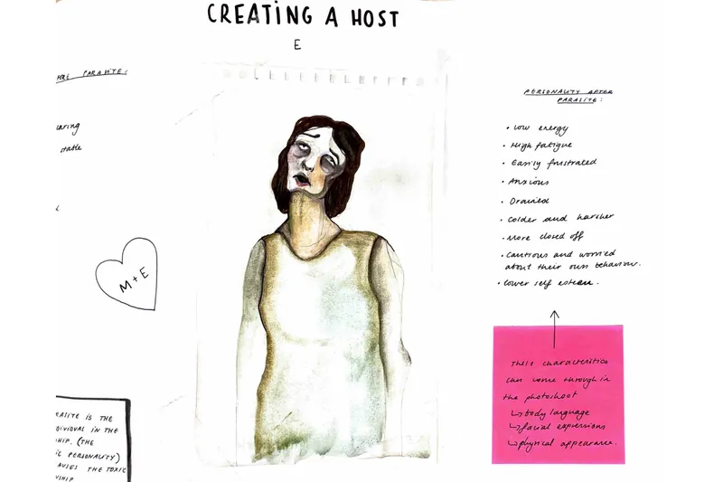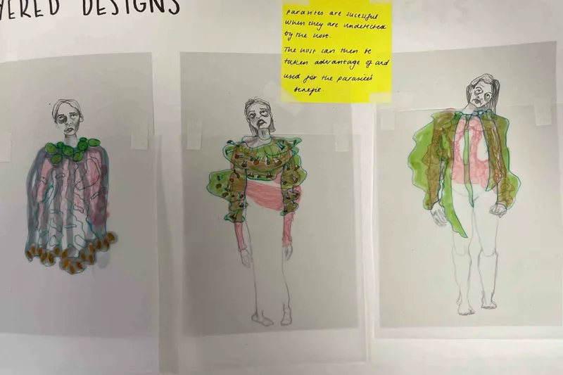 My project investigates symbiosis in the natural world to explore human relationships and parasitic personalities. My garments portray 2 forms of symbiosis, mutualism and parasitism, and the relationship between parasite and host, visually inspired by biological interactions.