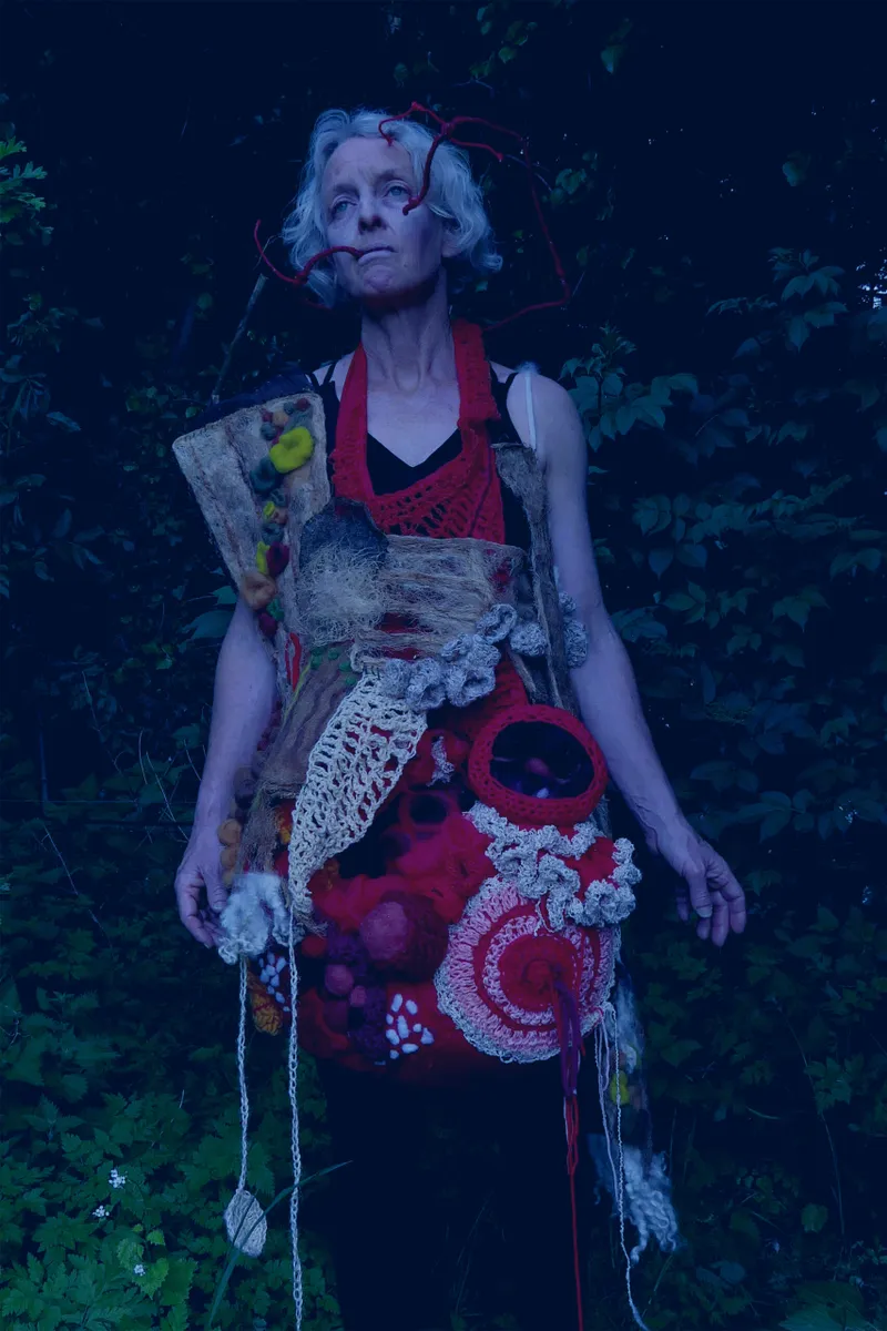 I experimented with multiple techniques including crochet, felting, wire work, weave and embroidery. I created a variety of textures on the surface of my garments to enhance their organic appearance. I dyed yarn with lichens and experimented with root growth. Through trial and error, I found a successful method of growing, extracting and drying the roots to be used as a textile. I explored felting and embroidery into the roots to achieve variations in texture and experimented with growing the roots in shaped, tinfoil containers.