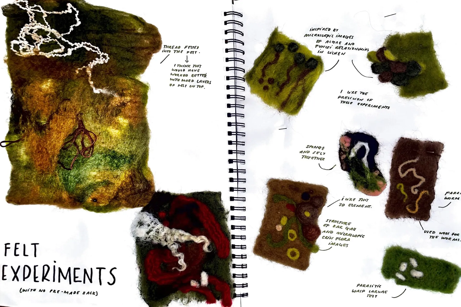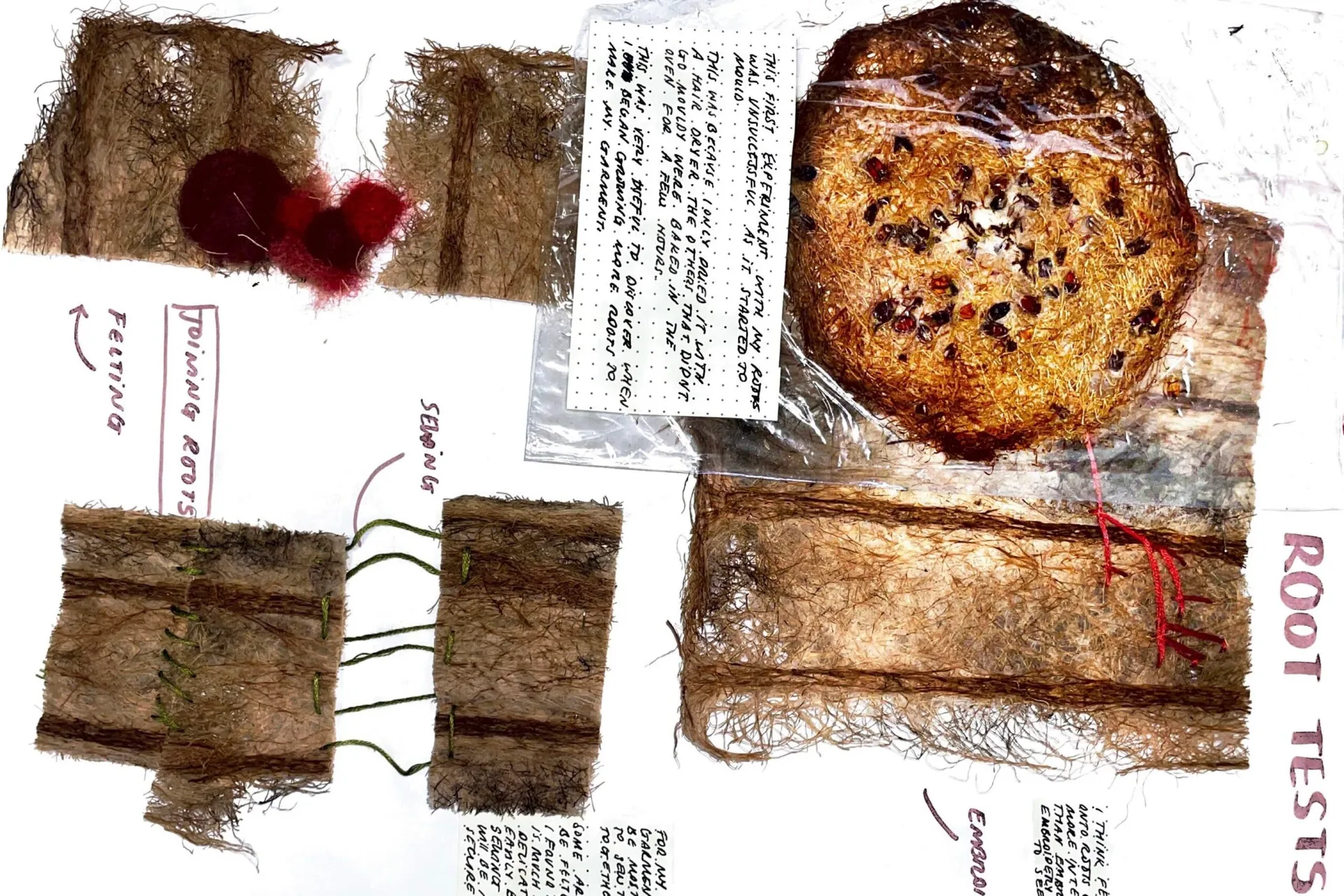 I experimented with multiple techniques including crochet, felting, wire work, weave and embroidery. I created a variety of textures on the surface of my garments to enhance their organic appearance. I dyed yarn with lichens and experimented with root growth. Through trial and error, I found a successful method of growing, extracting and drying the roots to be used as a textile. I explored felting and embroidery into the roots to achieve variations in texture and experimented with growing the roots in shaped, tinfoil containers.