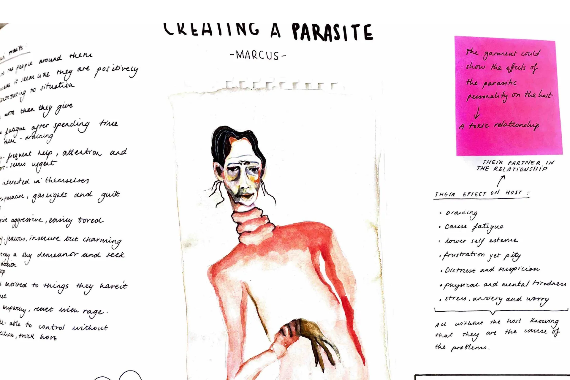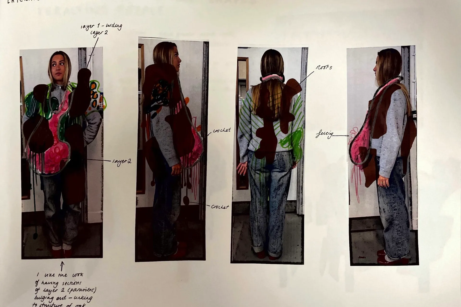 My project investigates symbiosis in the natural world to explore human relationships and parasitic personalities. My garments portray 2 forms of symbiosis, mutualism and parasitism, and the relationship between parasite and host, visually inspired by biological interactions.