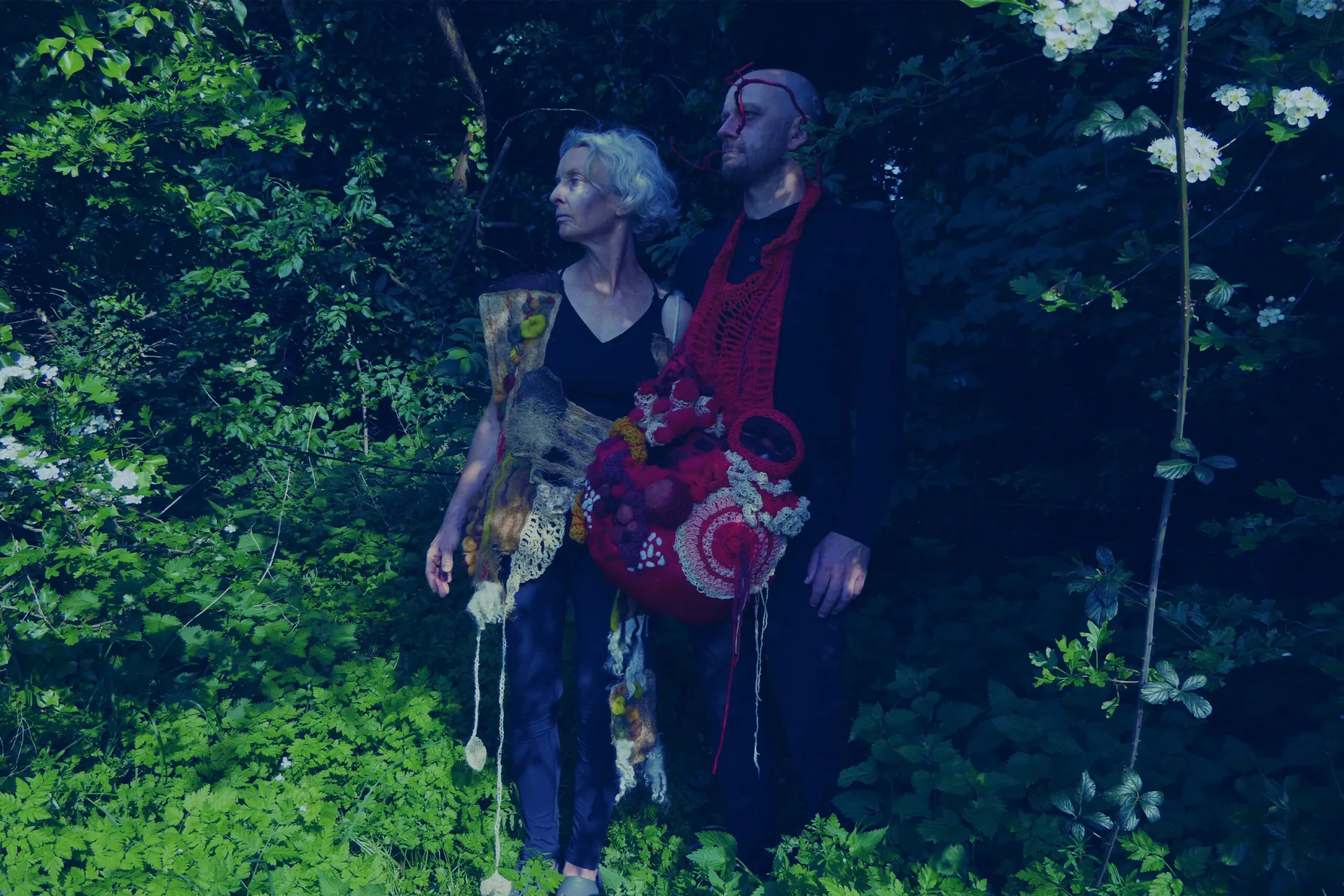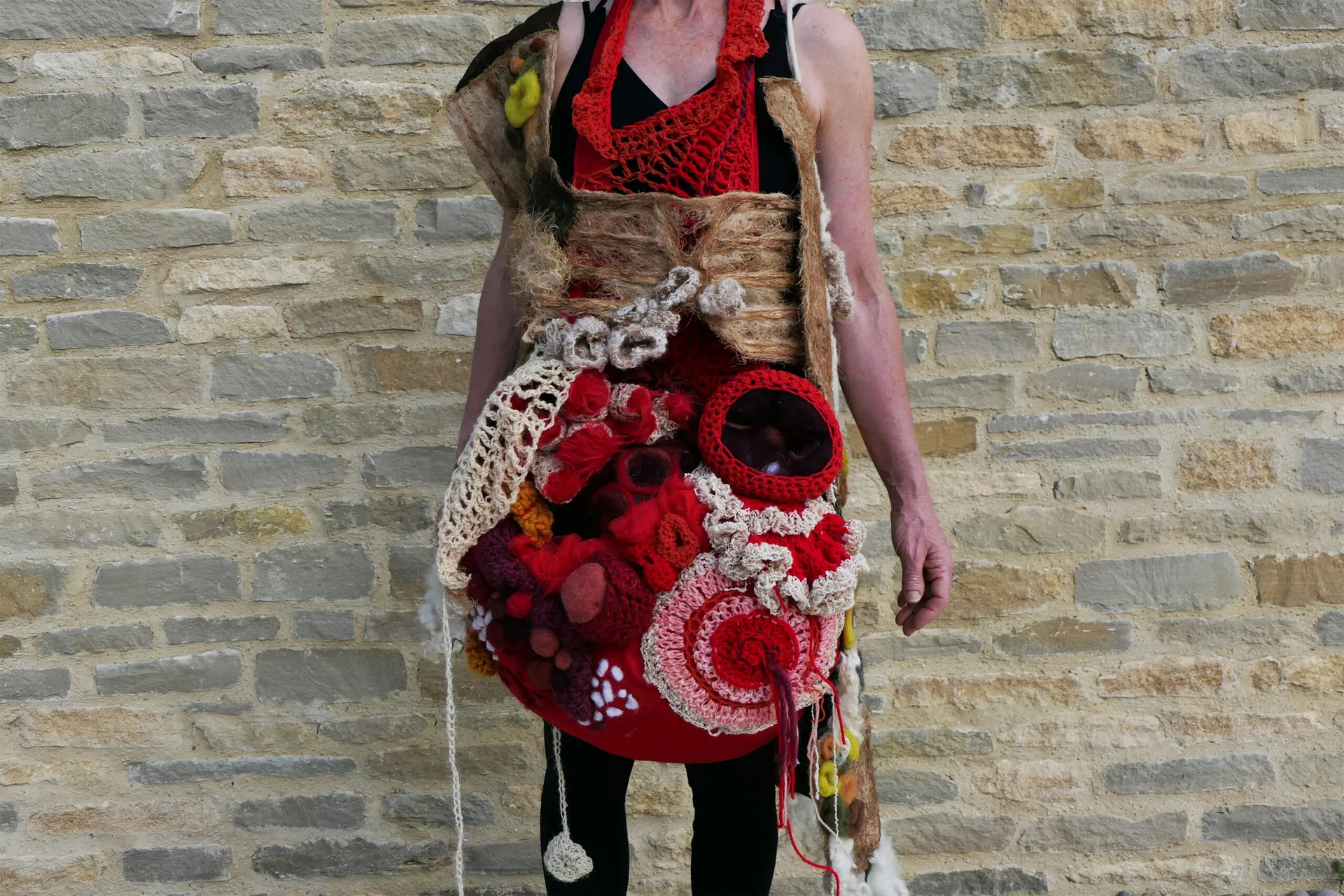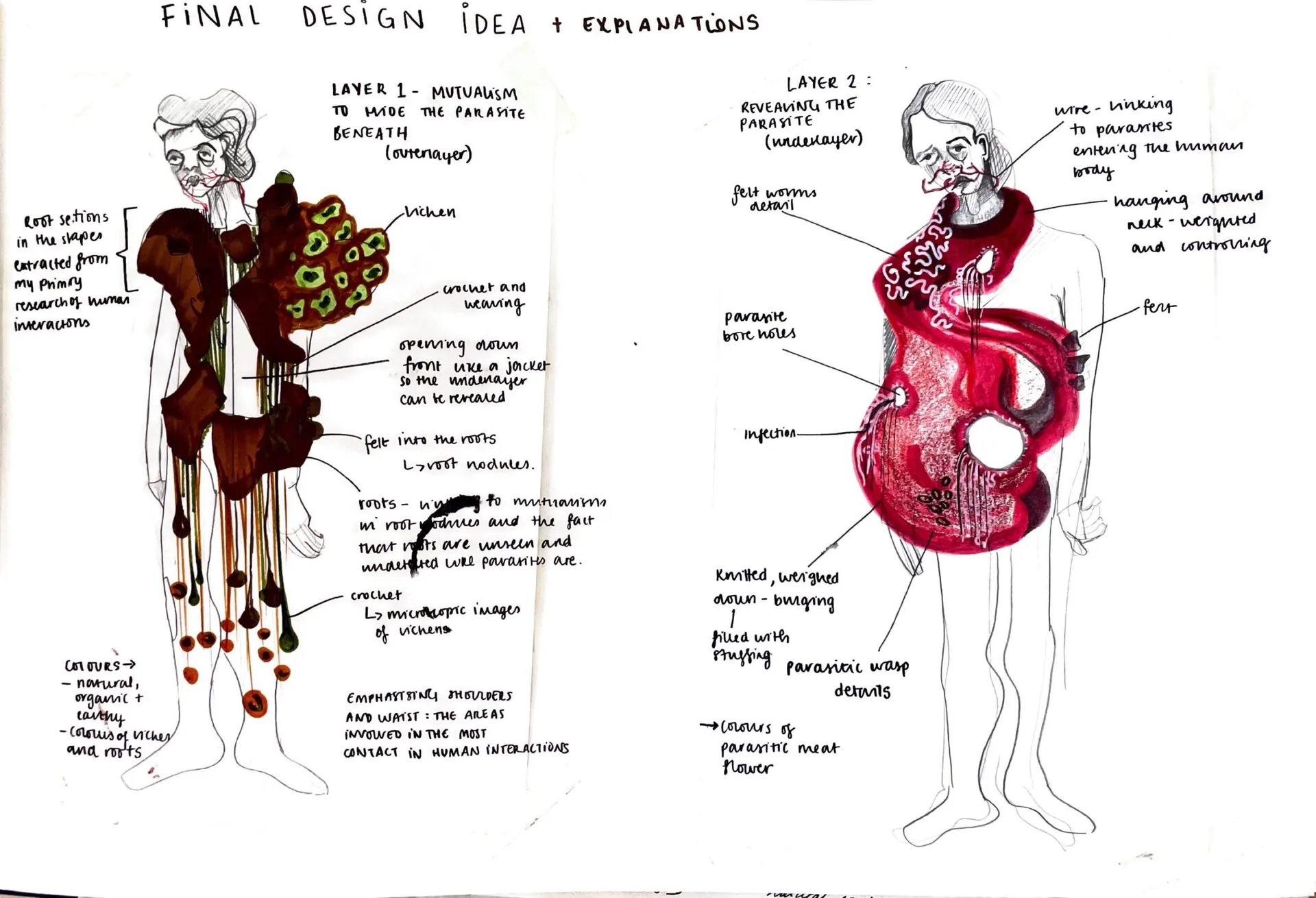 My final garments portray 2 forms of symbiosis, mutualism and parasitism, and the relationship between parasite and host, drawing similarities to human relationships. The synthetic, red, swollen layer, pulling down on the neck, inspired by parasites, shows the draining relationship of a parasite on a host. The colours of Rafflesia arnoldii make up the garment with textiles inspired by parasitic worms, wasps and fungi creating an organic, natural silhouette. The second garment, made mainly from roots, reflects a mutualistic (healthy) relationship with textiles inspired from lichens and root nodules. When worn together this covers the parasitic layer which hides beneath, showing the characteristic of parasites to deceive and trick their host. The shapes of these roots were grown mirroring the shapes of human relationships I observed during primary research. As time passes, the mutualistic root layer will decompose leaving behind the parasite reflecting on how parasites slowly drain their host.