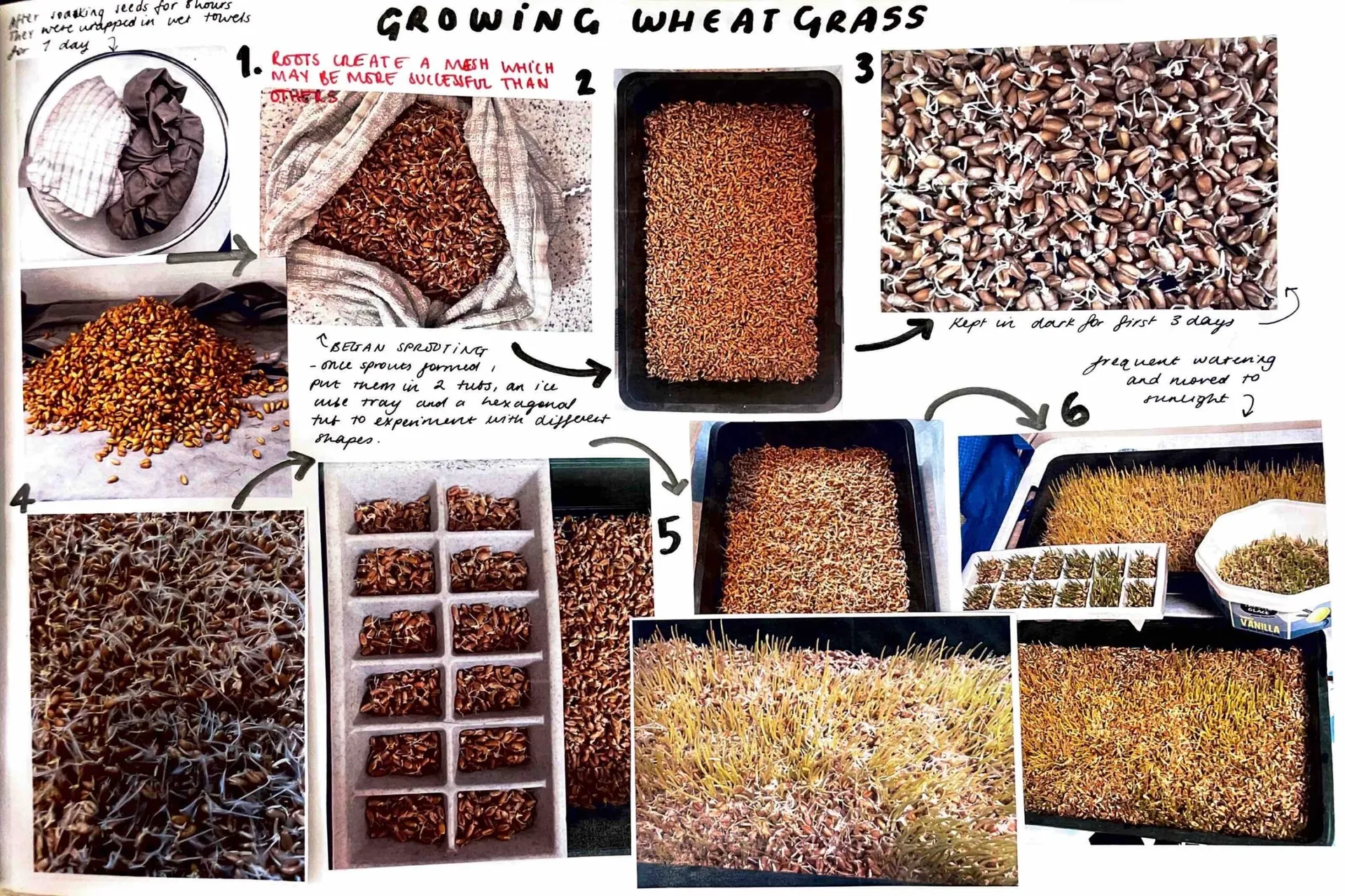 For the parasite layer I chose red colours of the Parasitic meat flower: Rafflesia arnoldii and synthetic materials. Like a parasite does, the materials posed as something they were not: natural textiles. For example, acrylic yarn instead of real wool. For the mutualistic layer I used Wheat Grass Roots and all natural materials such as raw sheep’s wool, as well as earthy colours such as greens and browns.