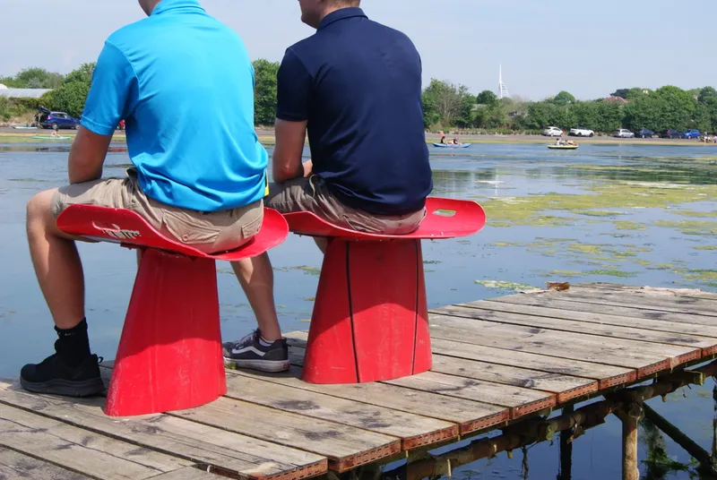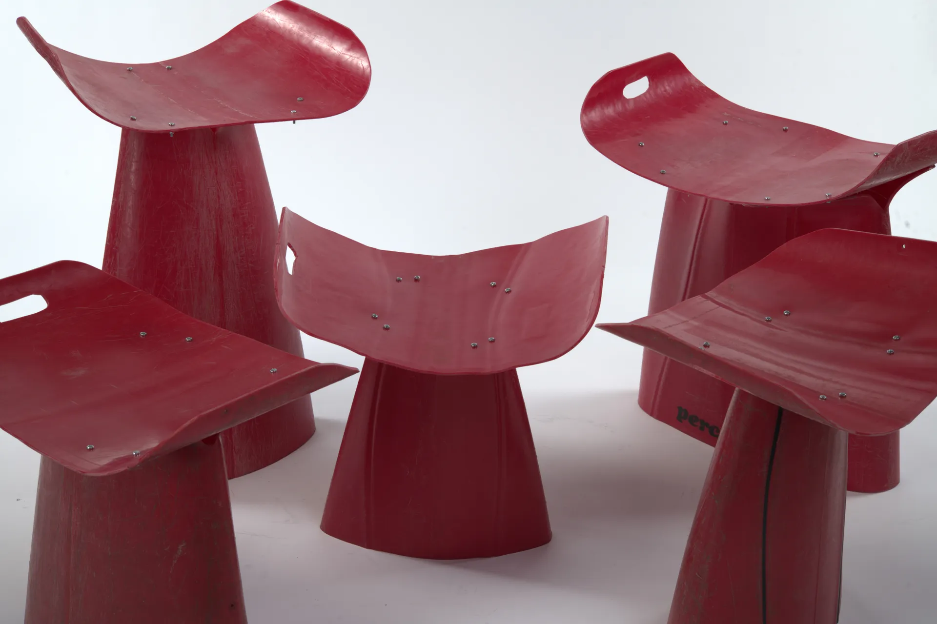 A collection of stools made from old dagger perception kayaks, preventing them from reaching the landfill and giving them another life of use.