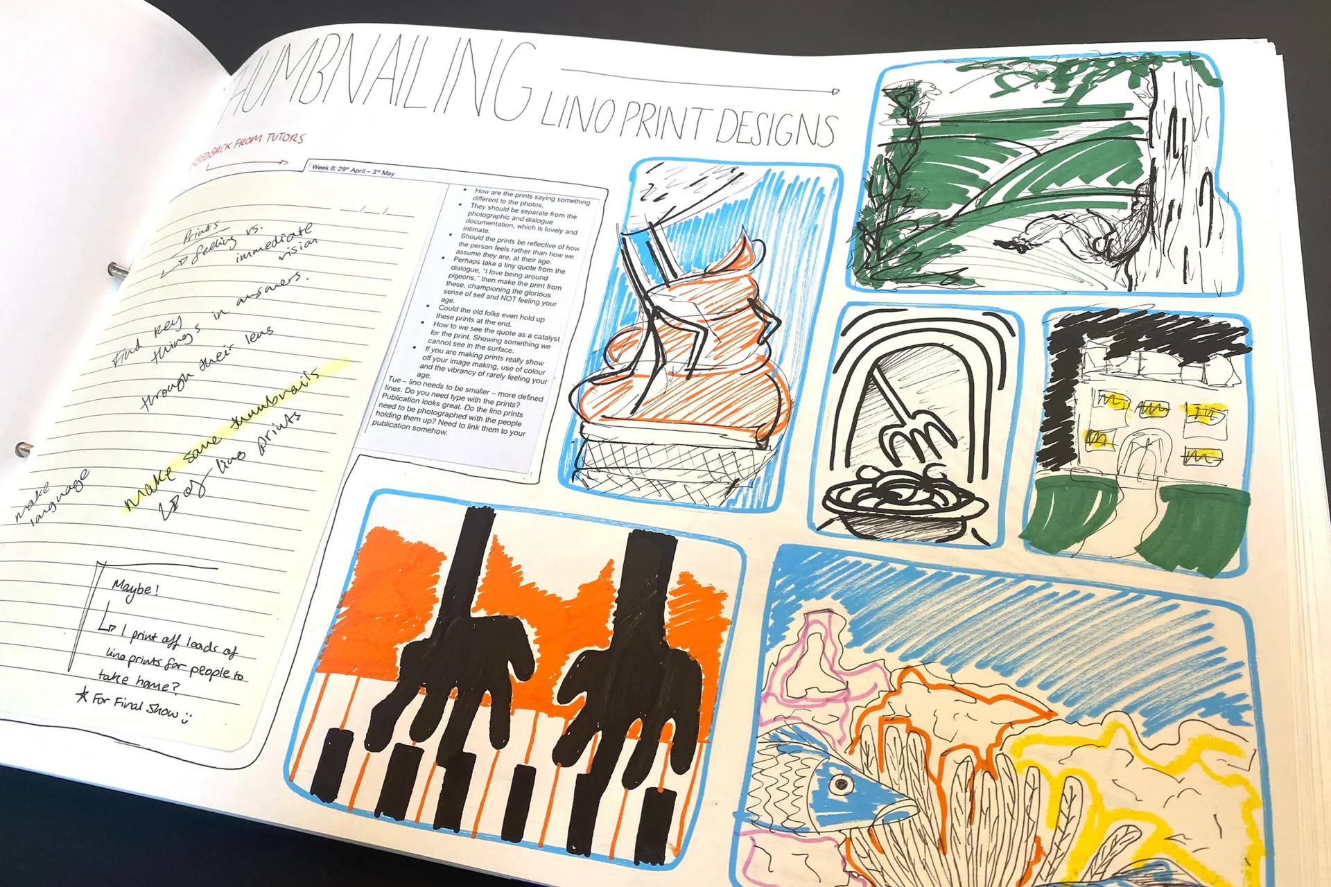 For my final FMP outcome I have made a book, accompanied my fragmented lino prints. Inside the book features street photography of people aged 60-90 and their honest responses to a list of questions discussing their lives. My lino prints are acting as their disorganised memories, illustrating certain events or achievements in their lives.