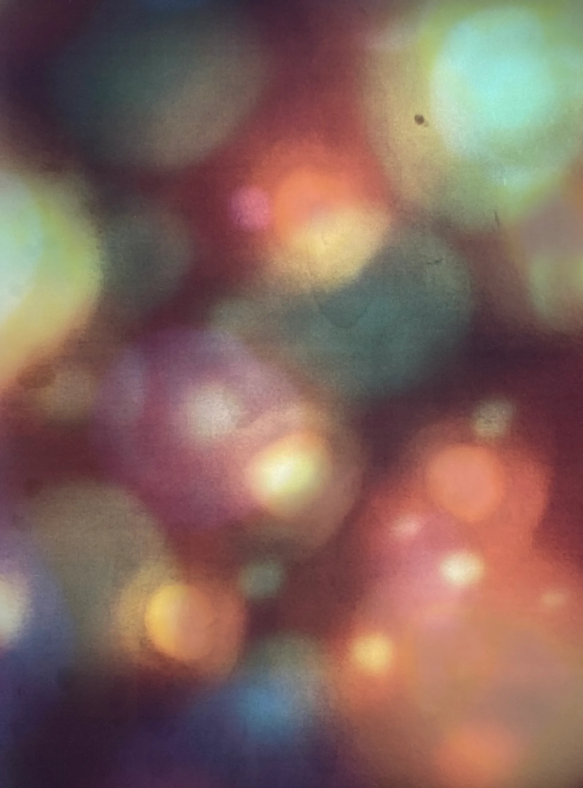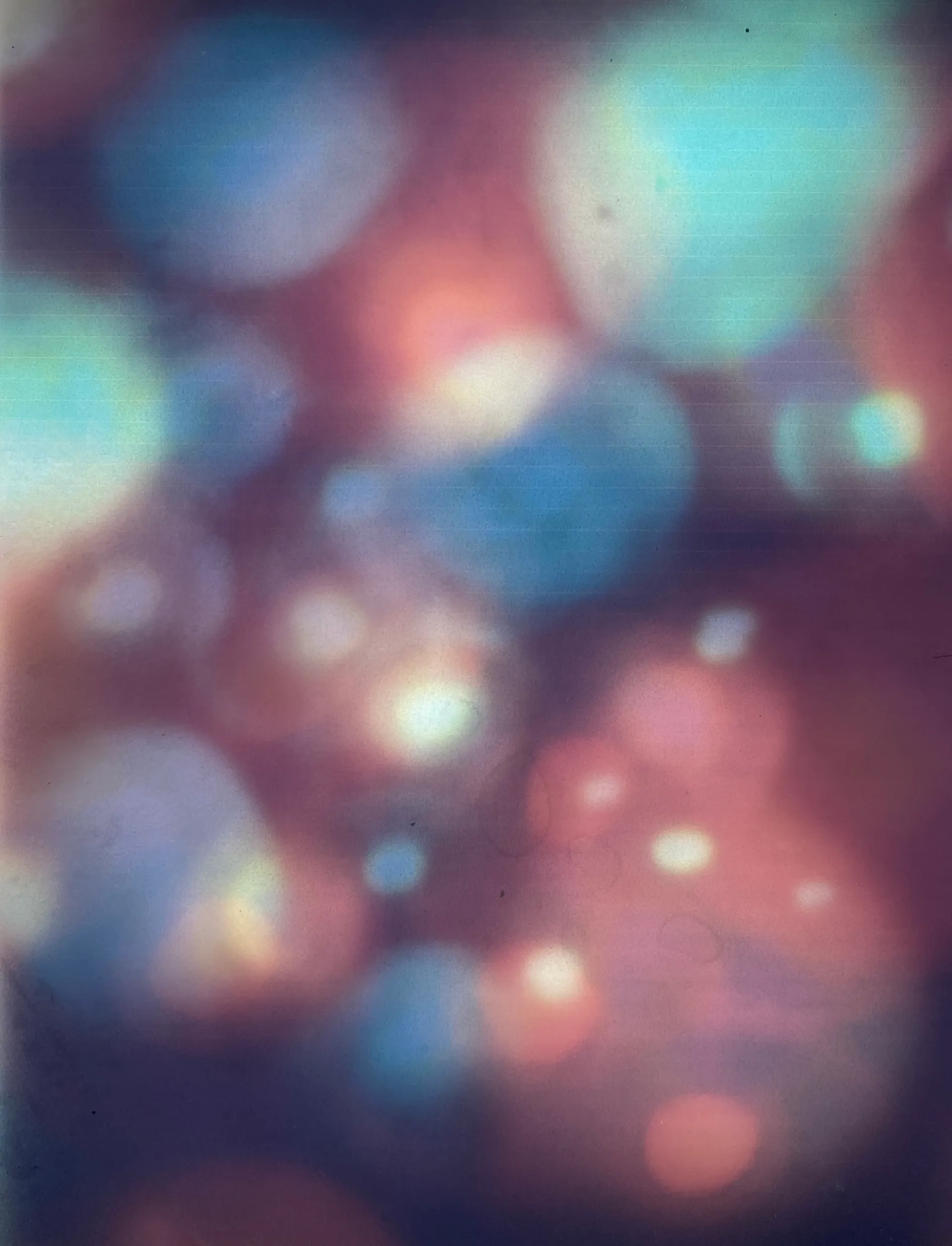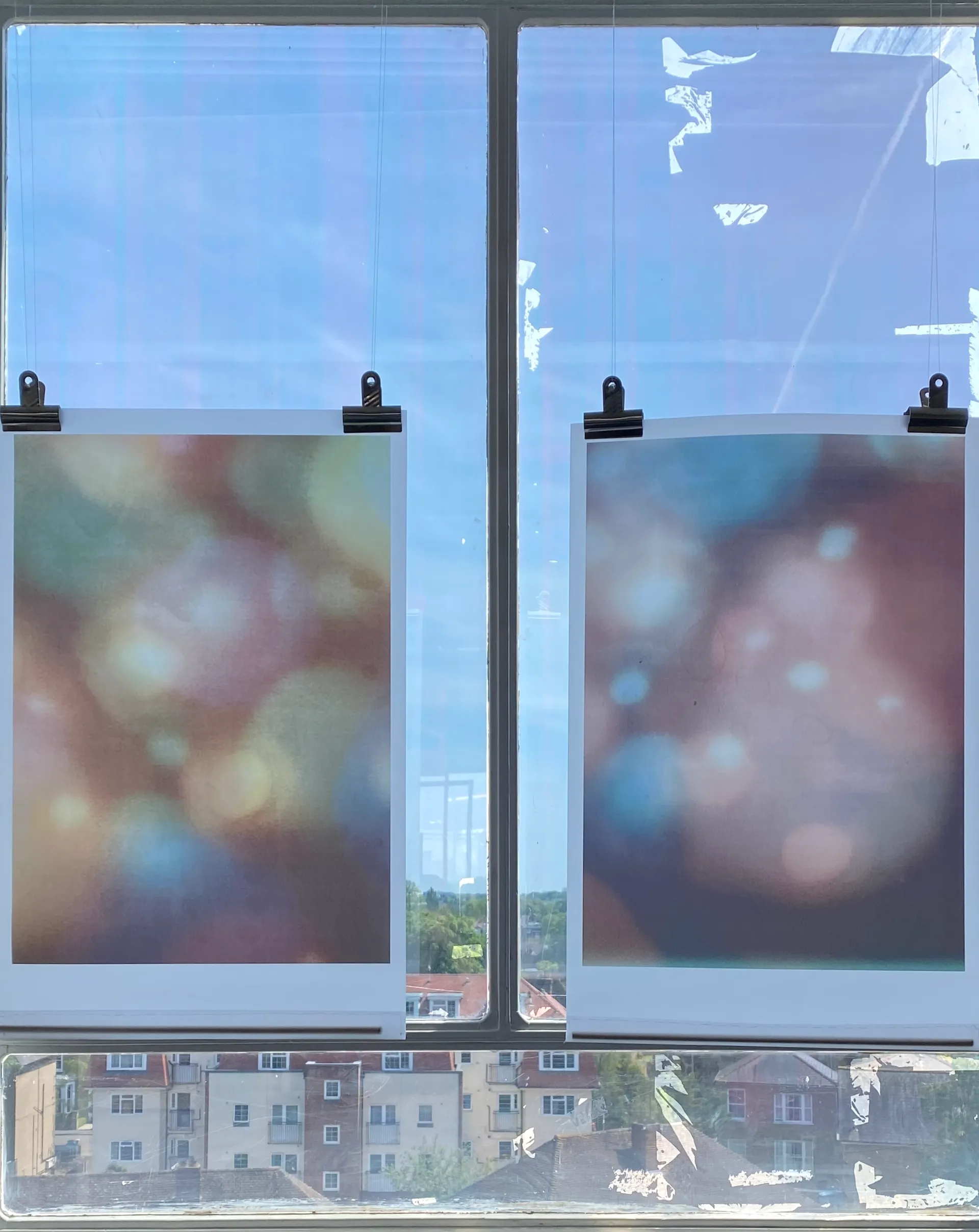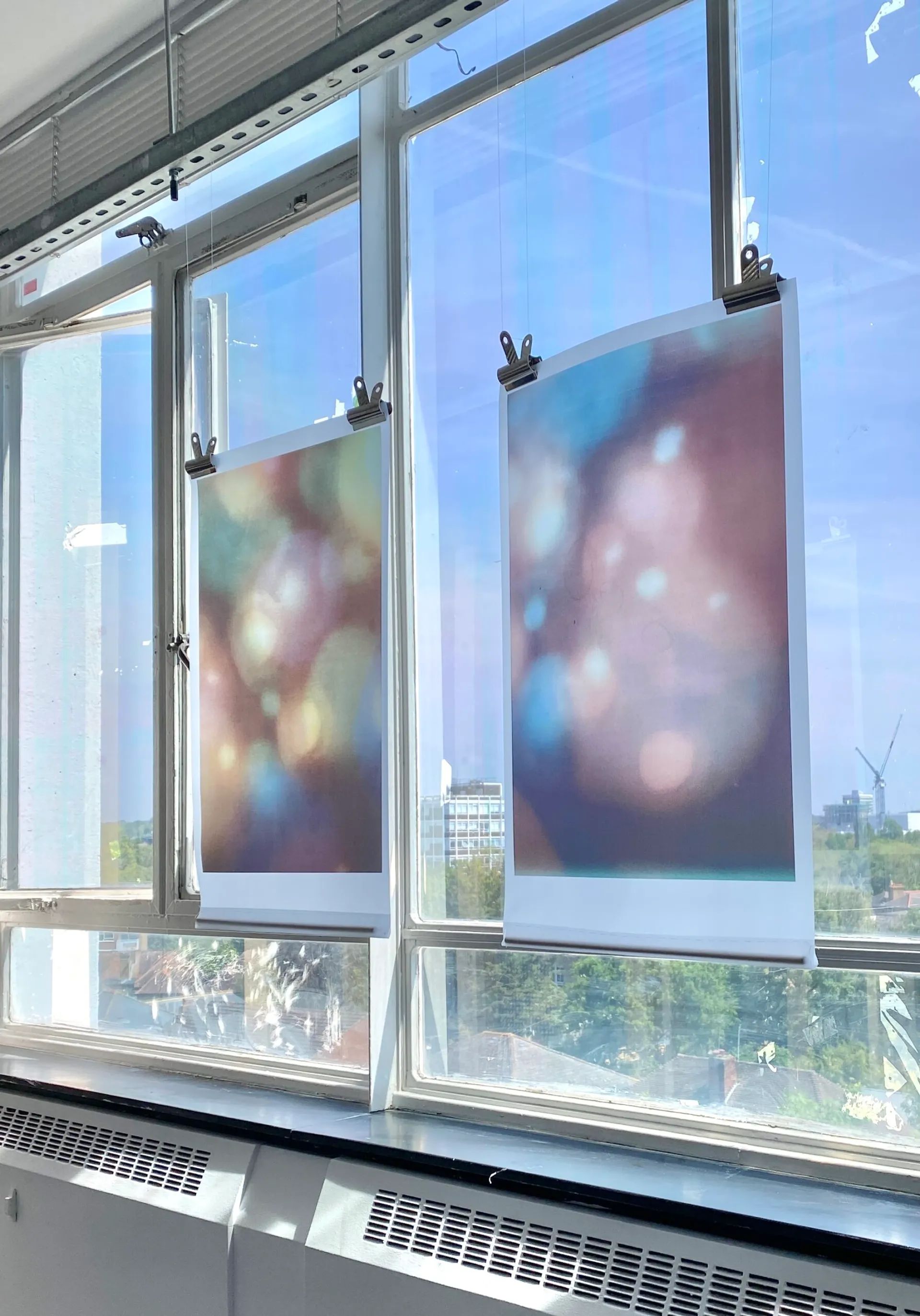 My final piece titled “Eyes wide shut” is comprised of two A2 photographic prints on polyester film, illuminated by the window behind them. The photos are of what I see when I close my eyes and rub them.